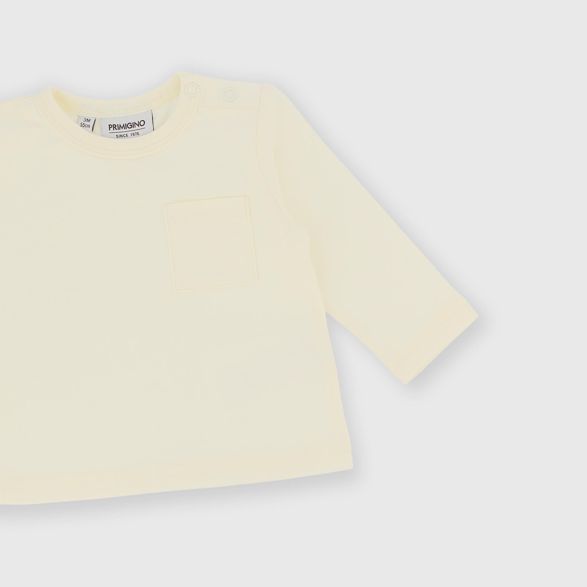 Maglietta in jersey, girocollo, a maniche lunghe. Chiusura con bottoncini automatici sulla spalla. Taschina sul petto.