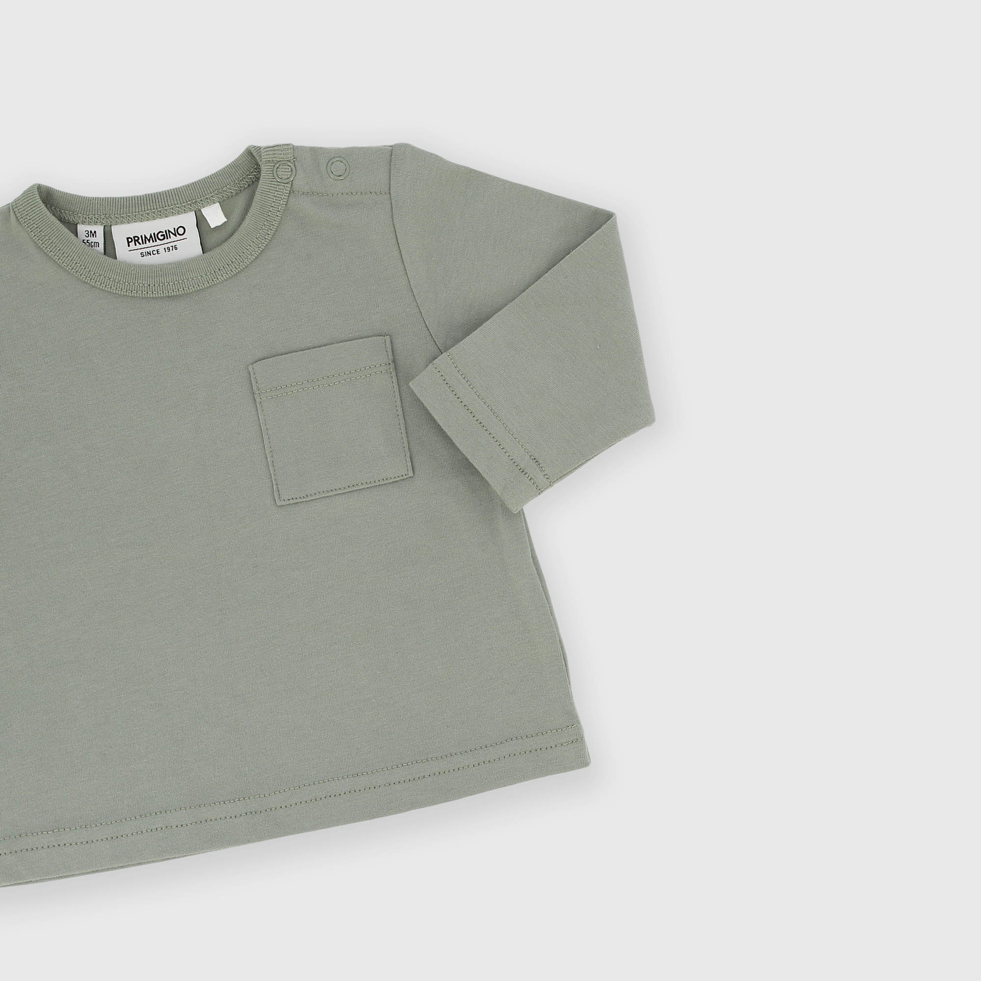 Maglietta in jersey, girocollo, a maniche lunghe. Chiusura con bottoncini automatici sulla spalla. Taschina sul petto.