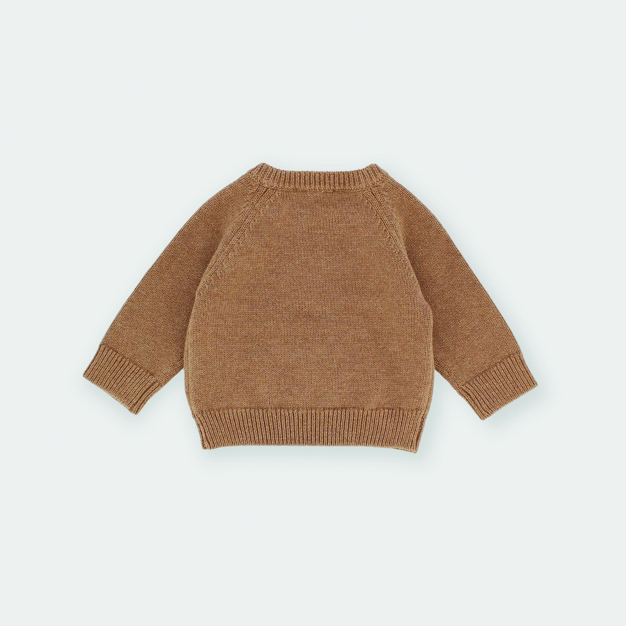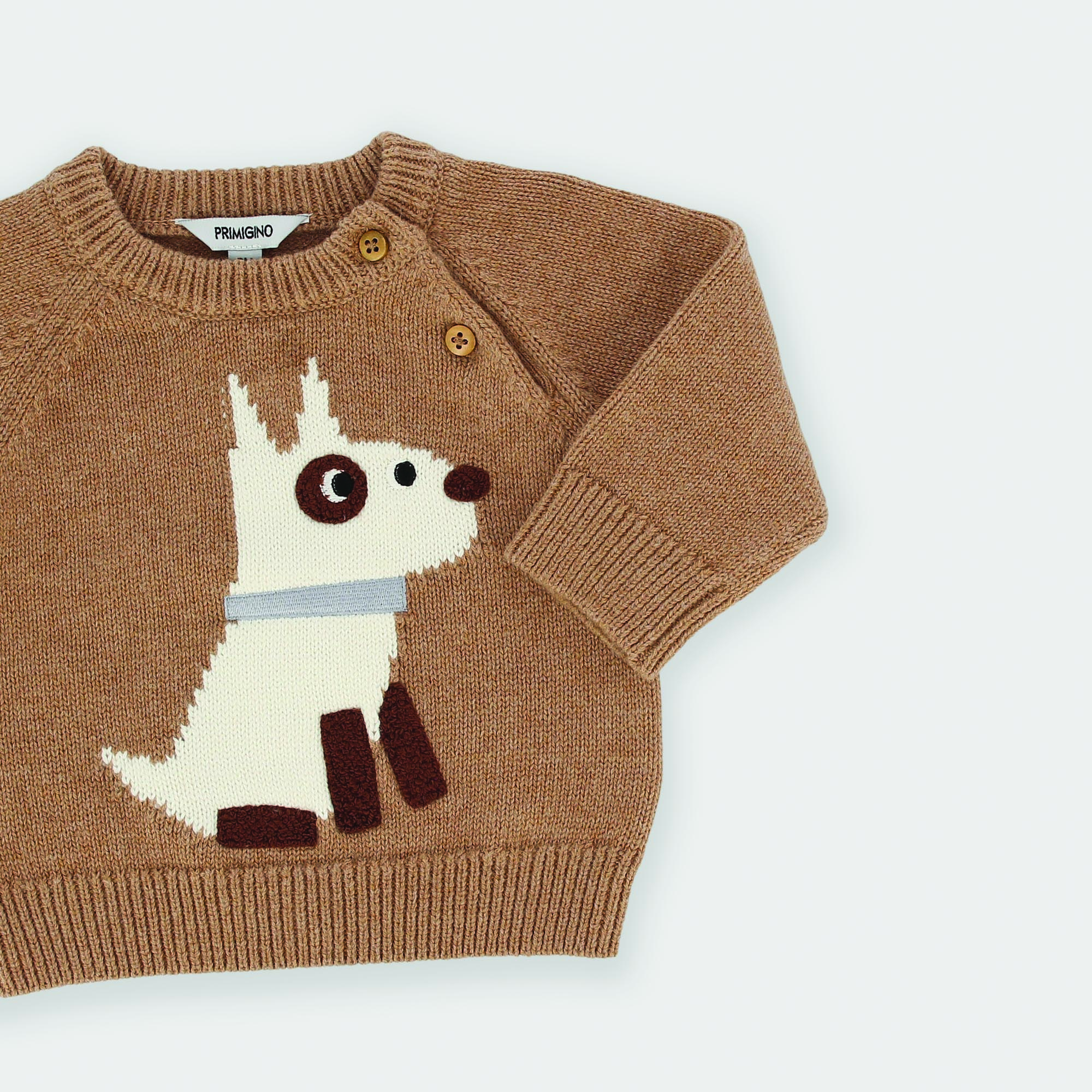 Pullover in morbida maglia, girocollo, a maniche lunghe. Chiusura con bottoncini sulla spalla. Ricamo jacquard cagnolino con applicazioni punto spugna sul davanti.