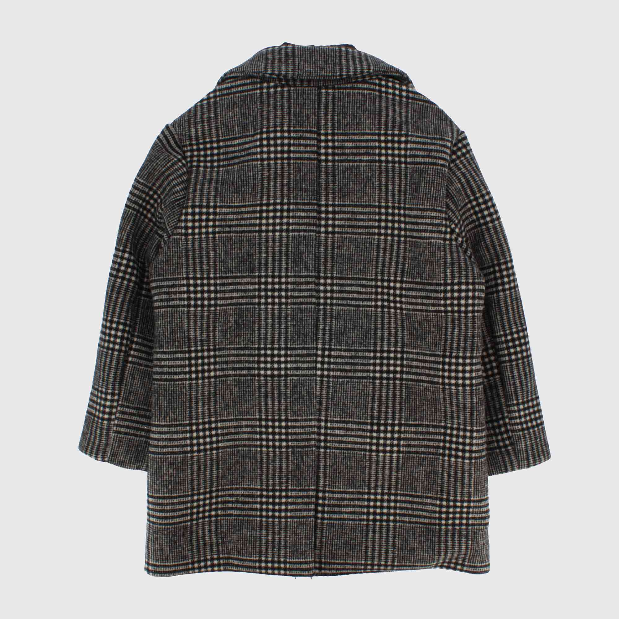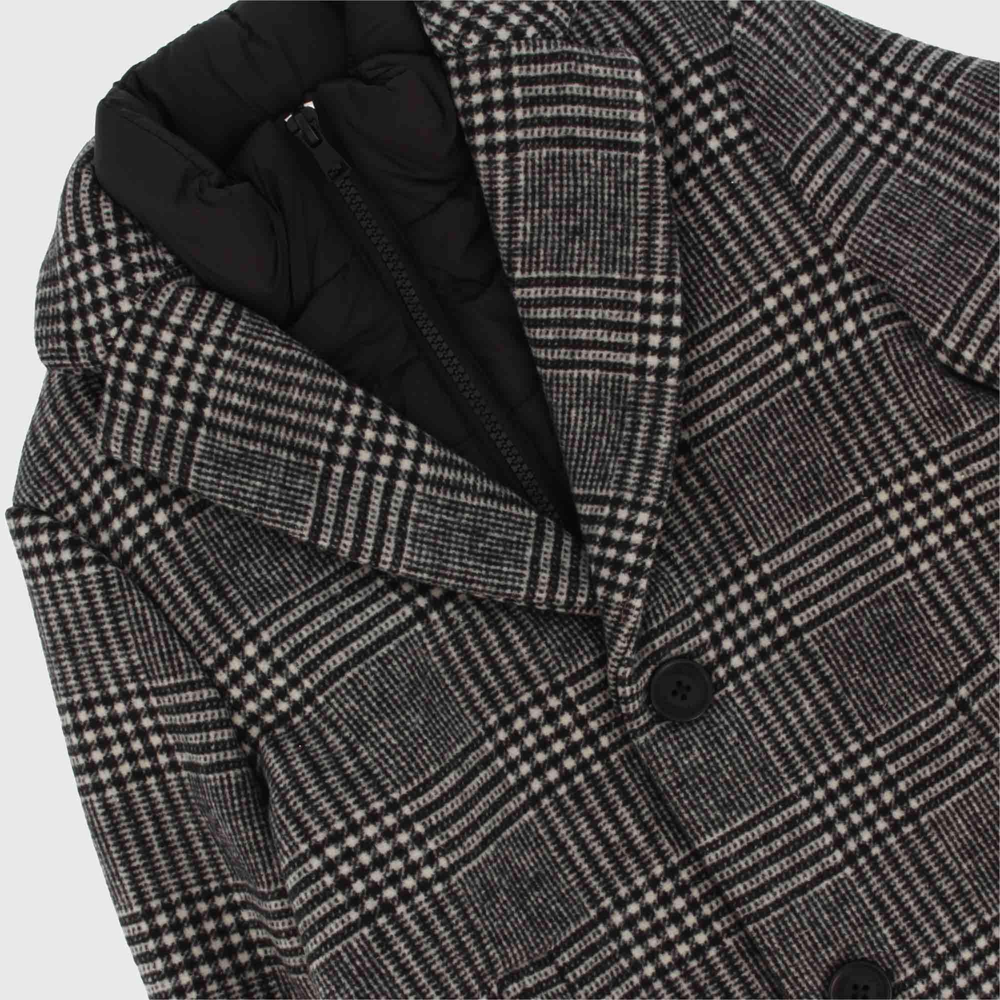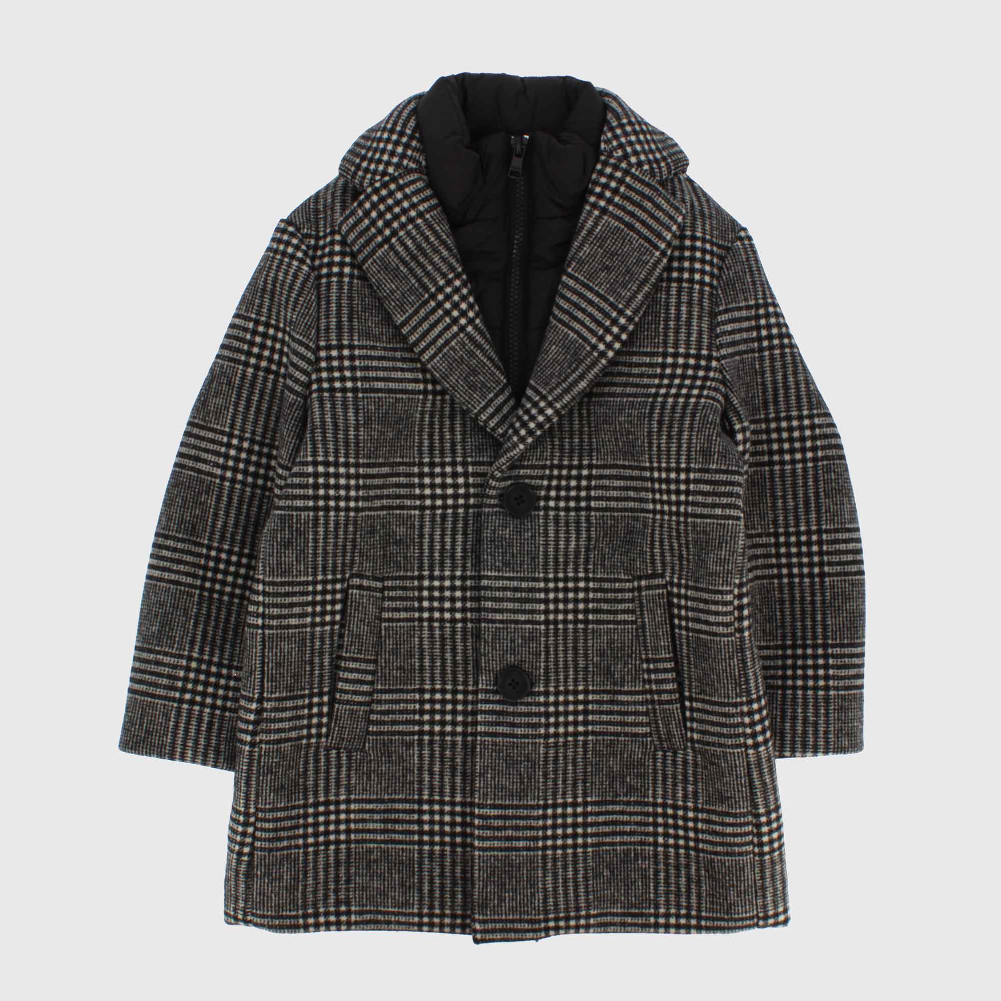 Cappotto in panno a quadretti con finto gilet imbottito interno. Chiusura frontale con zip e bottoni. Tasche laterali e spacchetto sul retro.