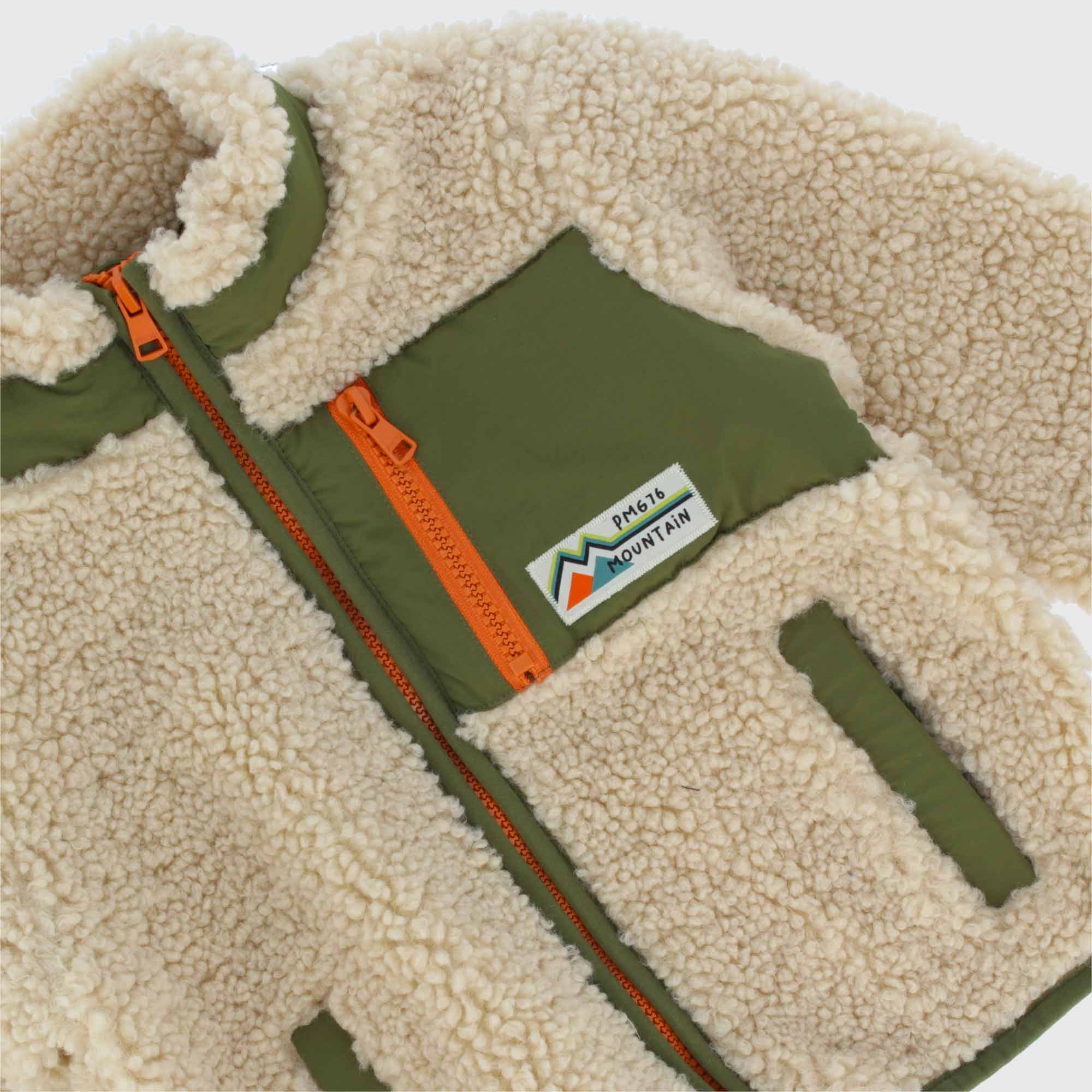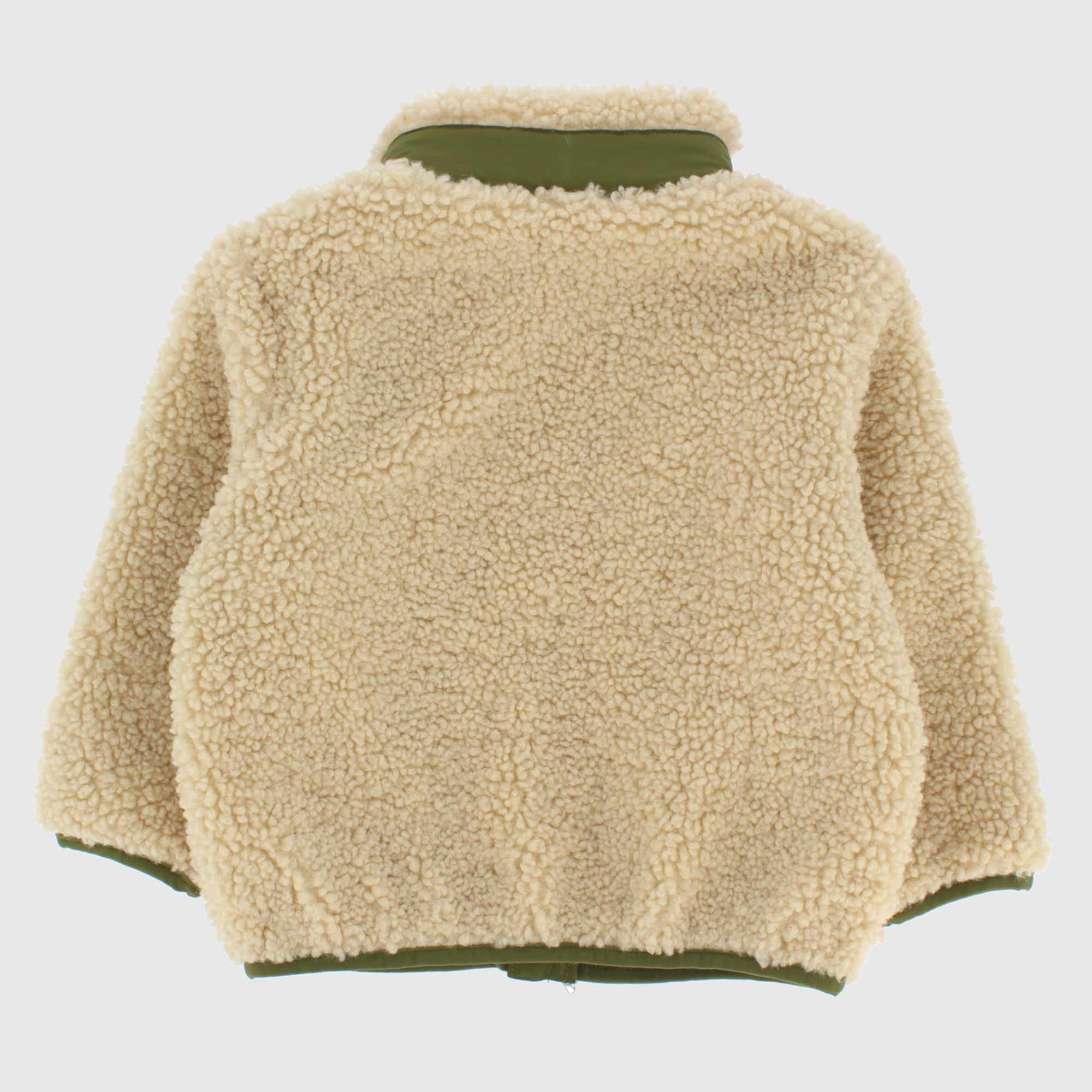 Felpa aperta in pile effetto teddy a maniche lunghe. Chiusura con zip a contrasto sul davanti. Tasche laterali, ed inserti in nylon a contrasto.