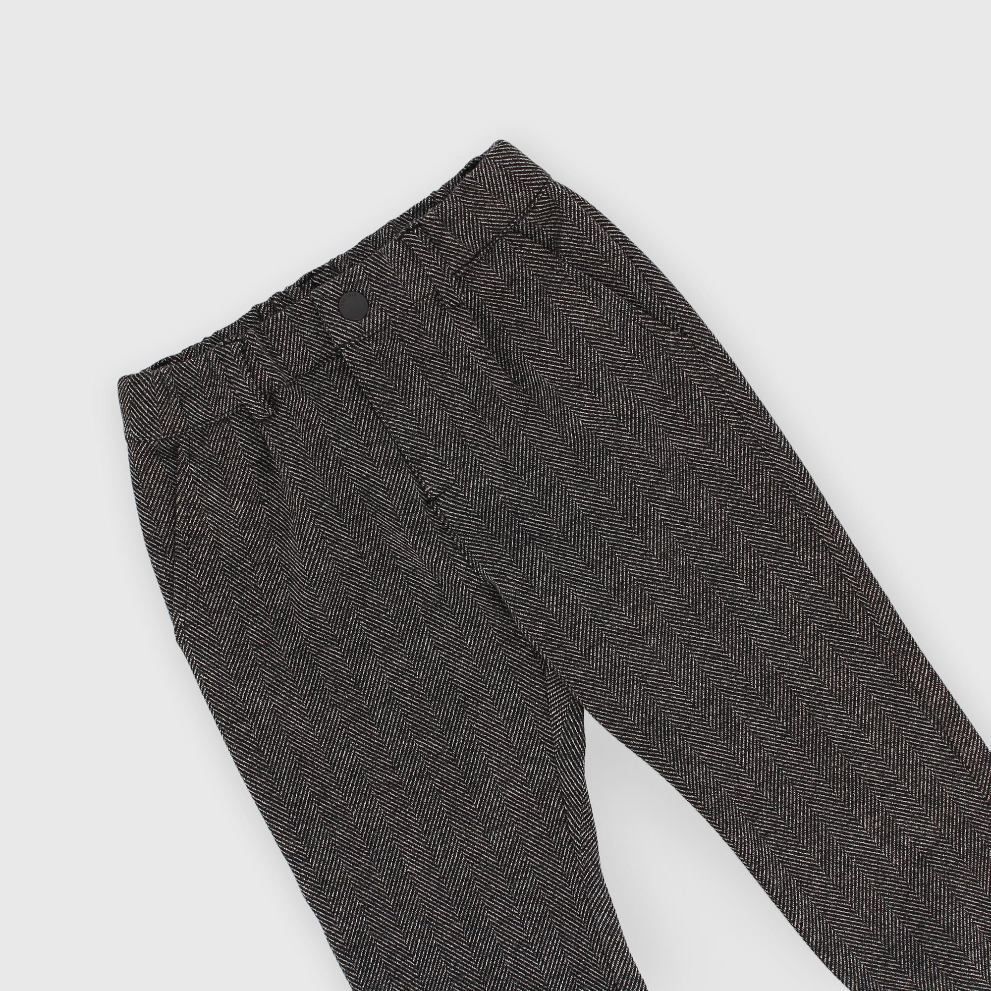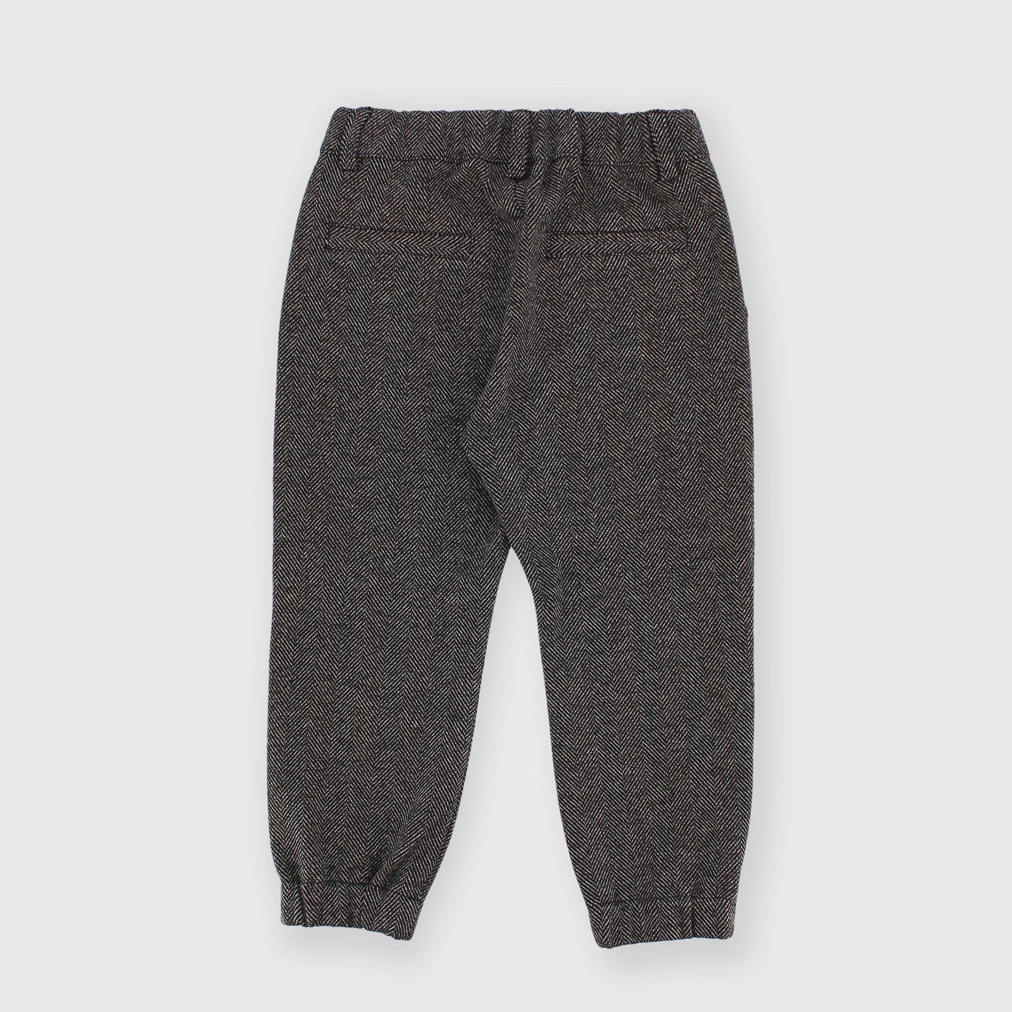 Pantalone in tessuto spigato con vita regolabile all'interno. Chiusura con bottoncino. Tasche alla francese sul davanti e a filetto sul retro. Fondo elasticato.