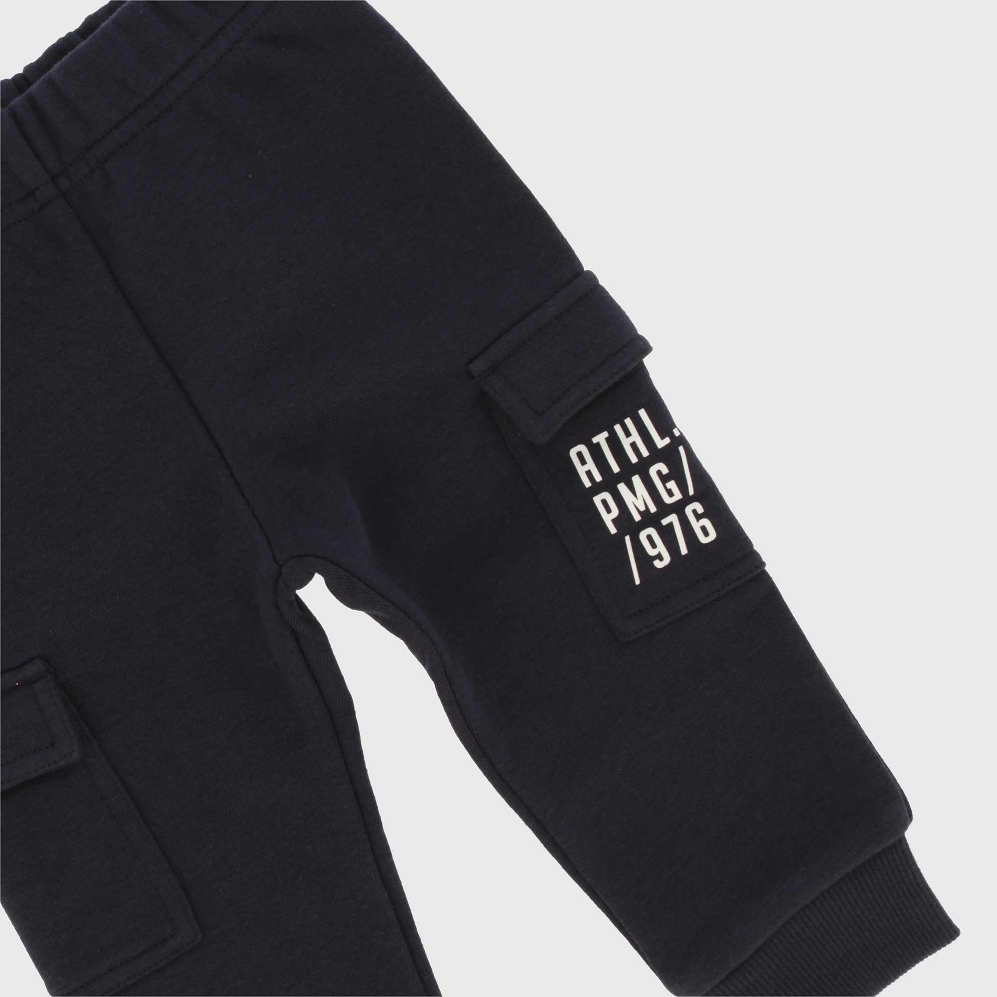 Pantalone in felpa con vita elasticizzata. Tasconi laterali, con scritte stampate. Fondo in costina.