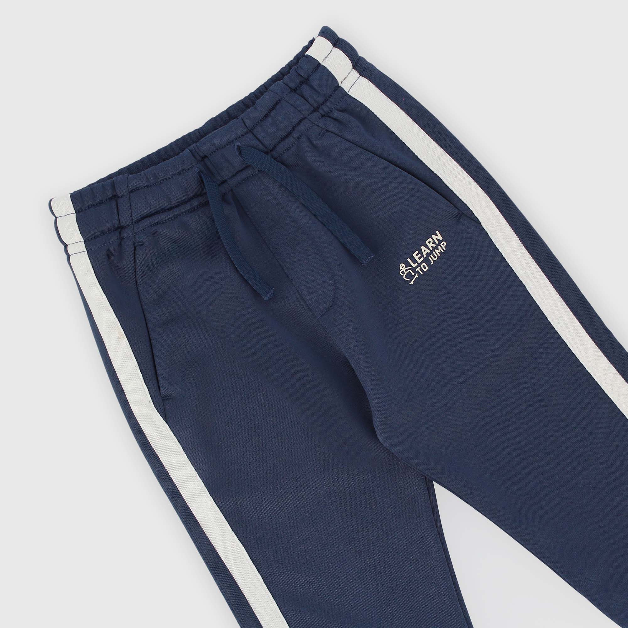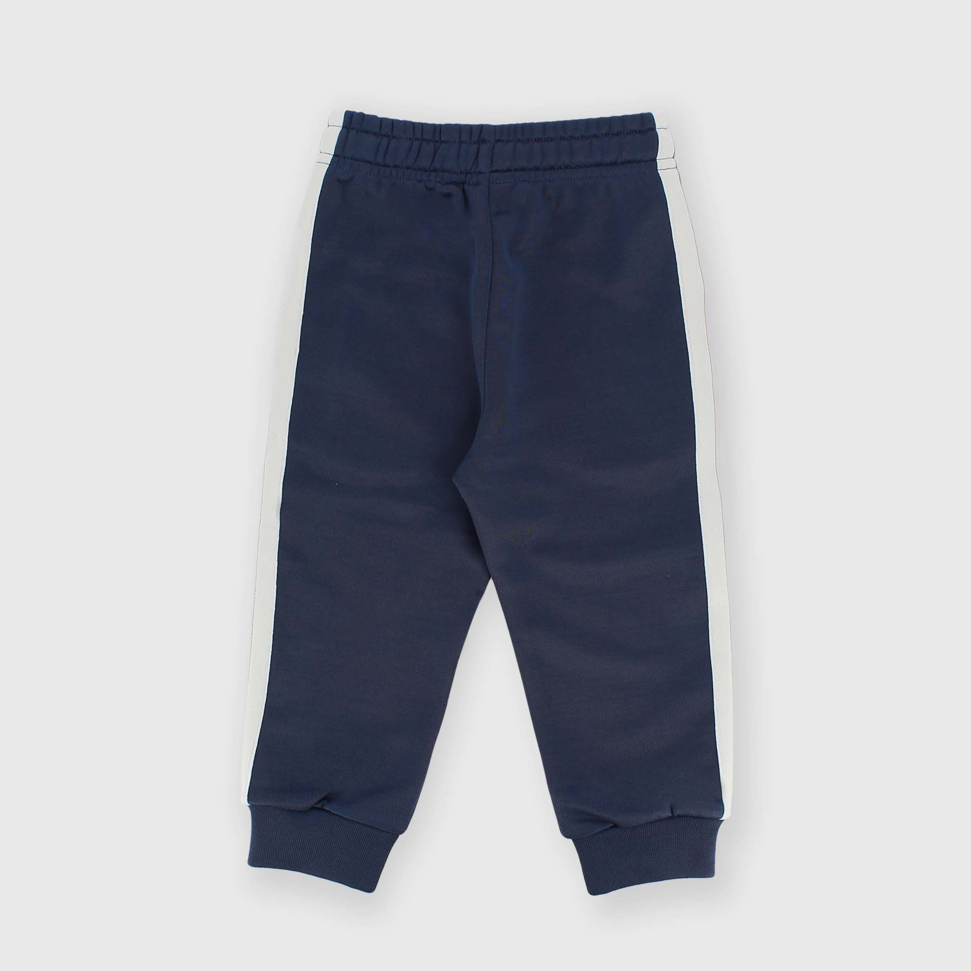 Pantalone in triacetato con vita elasticizzata e lacci frontali. Tasche alla francese. Bande laterali a contrasto. Piccola stampa effetto gommato sul davanti. Fondo elasticato.
