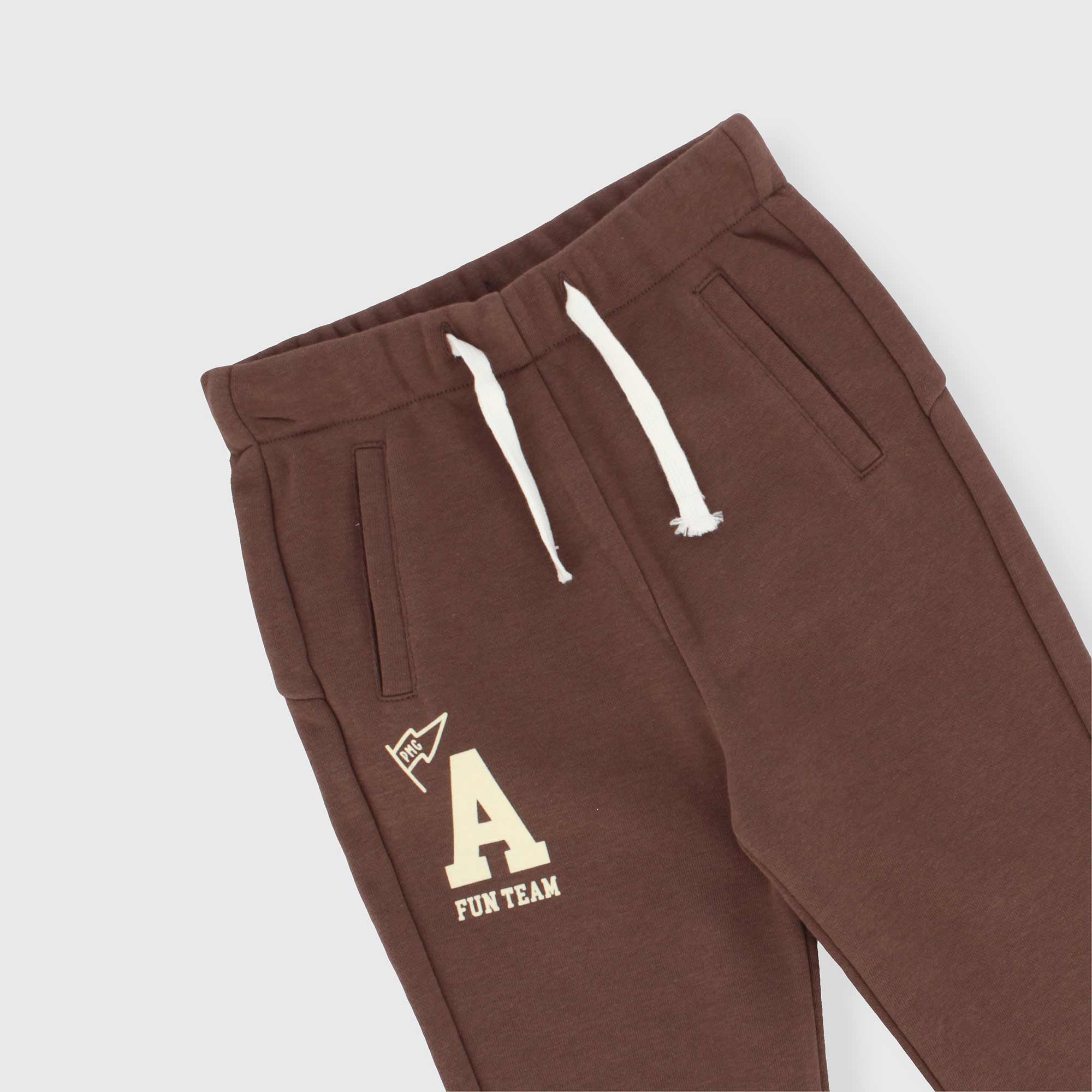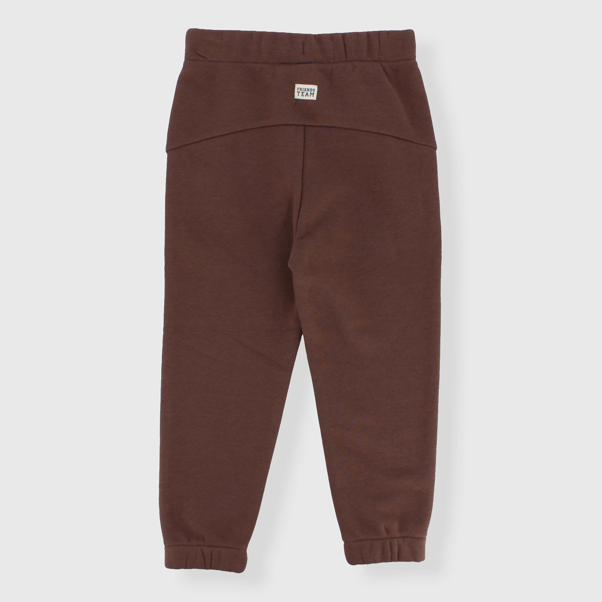 Pantalone in felpa con vita elasticizzata e lacci sul davanti. Tasche a filetto. Stampa effetto velluto sul davanti e piccolo patch applicato sul retro. Fondo con elastico.