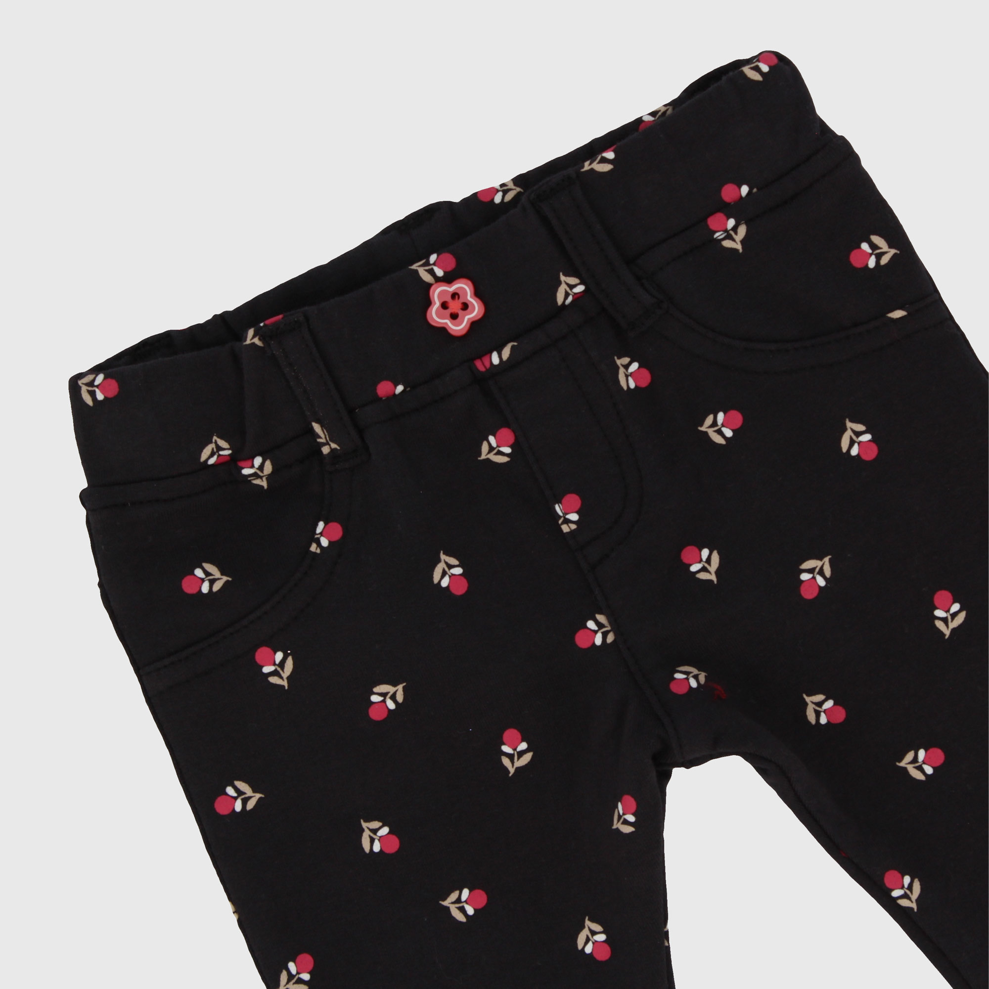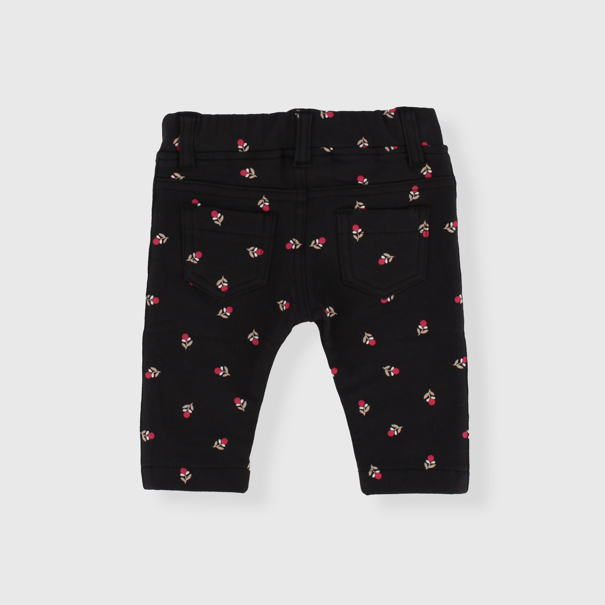 Pantalone in felpa con morbido interno spazzolato e vita elasticizzata. Finte taschine sul davanti e tasche a toppa sul retro. Stampa all-over a fiorellini.