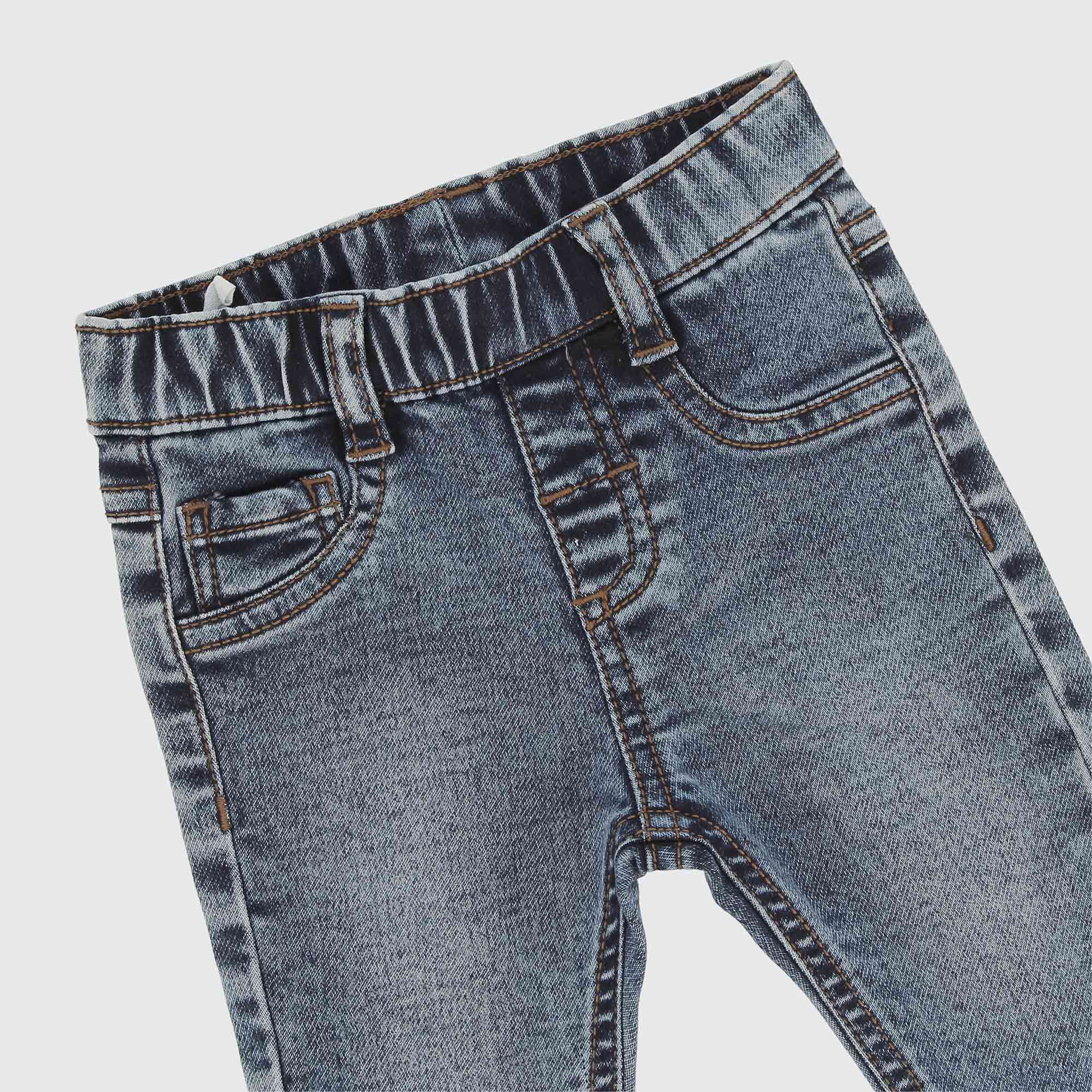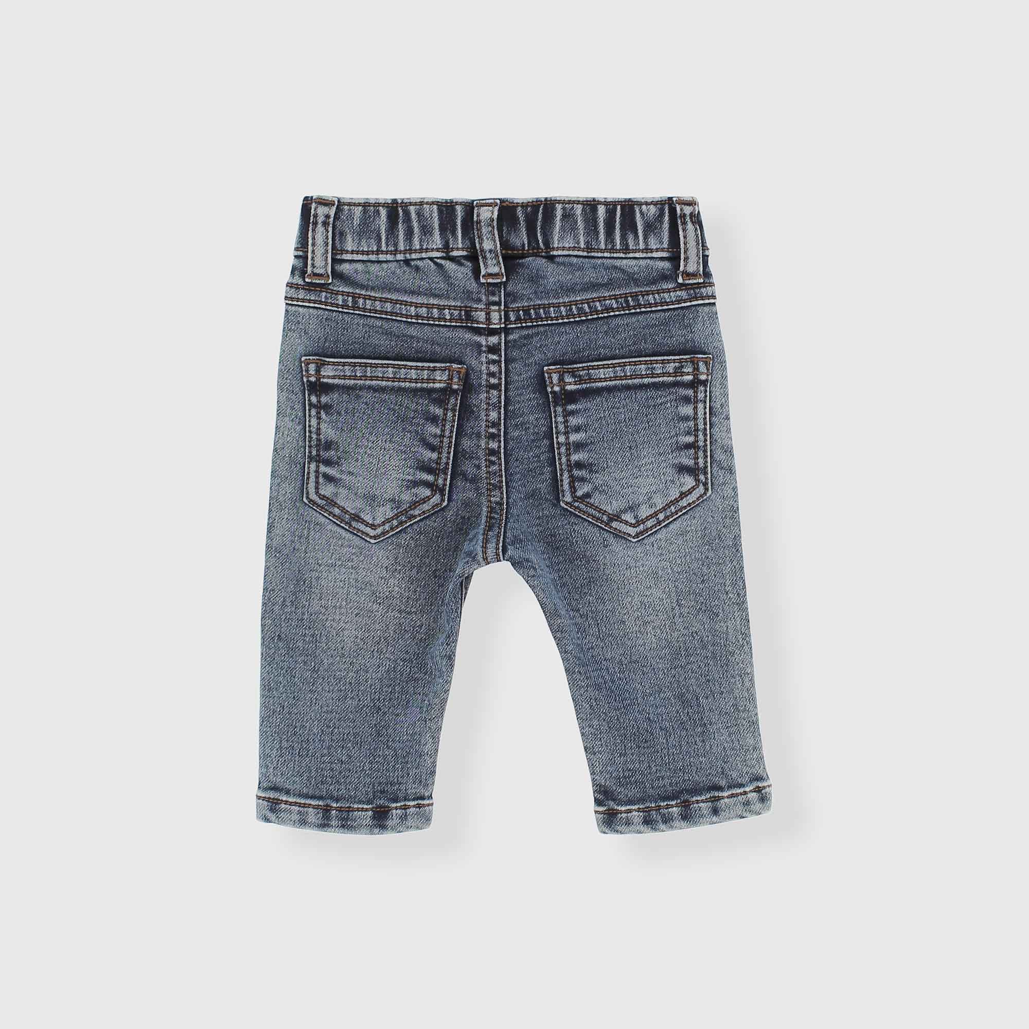 Pantalone in jeans a maglia, con vita elasticizzata. Cinque tasche.