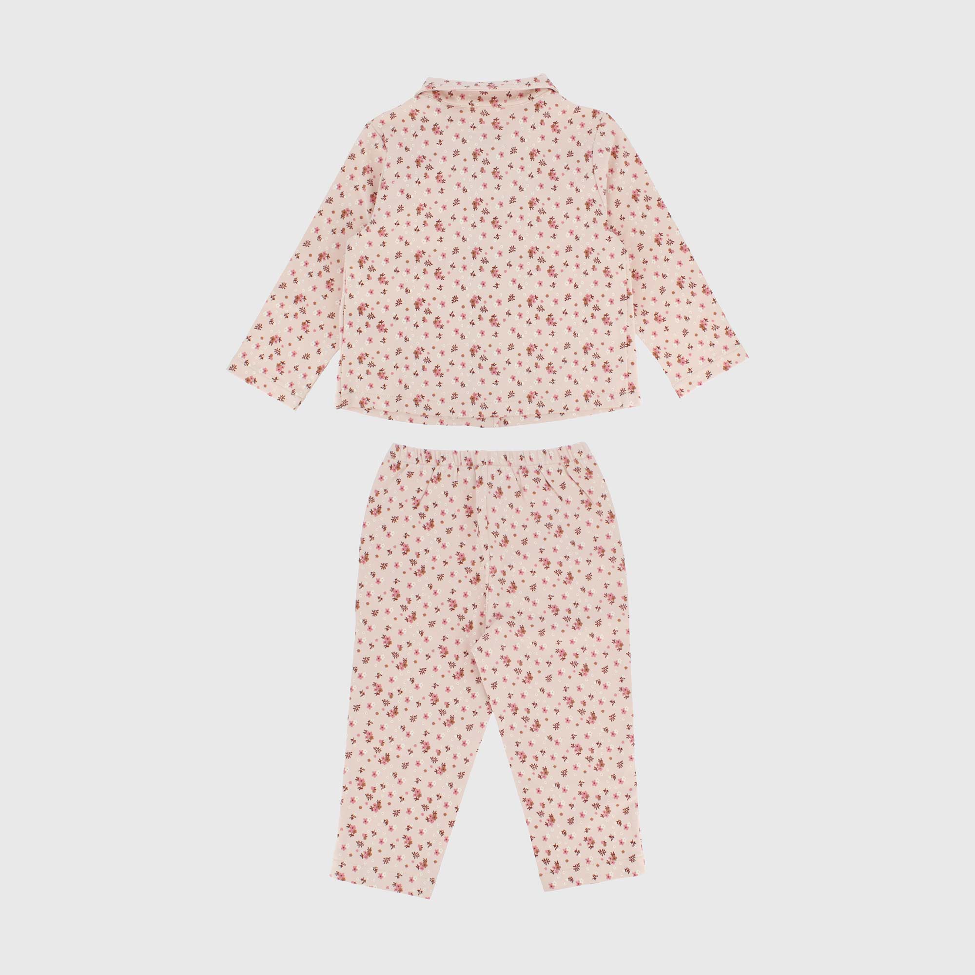 Completo pigiama in caldo cotone, con stampa all-over fiorellini. Maglia con colletto, a maniche lunghe. Abbottonatura sul davanti. Tasche a toppa. Pantalone con vita elasticizzata.