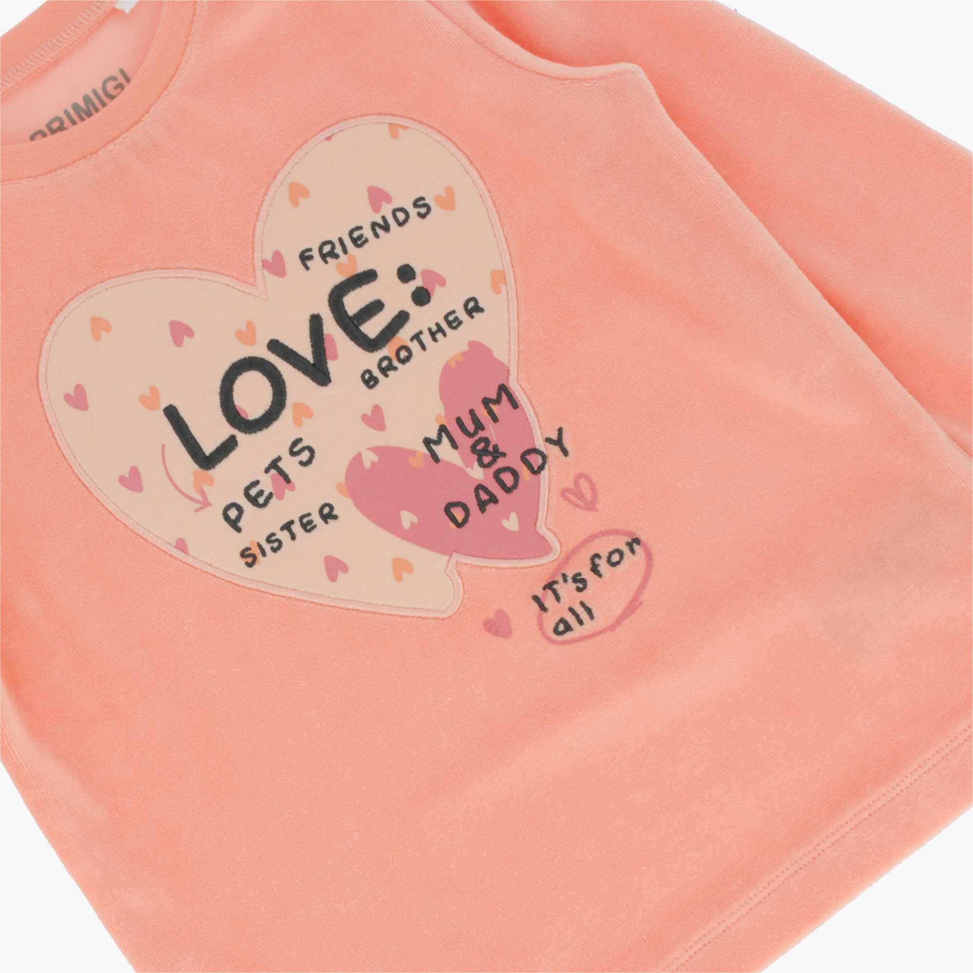 Completo pigiama in ciniglia. Maglia girocollo a maniche lunghe, con ricami sul davanti. Pantalone con vita elasticizzata e fondo in costina. Stampa all-over cuori.