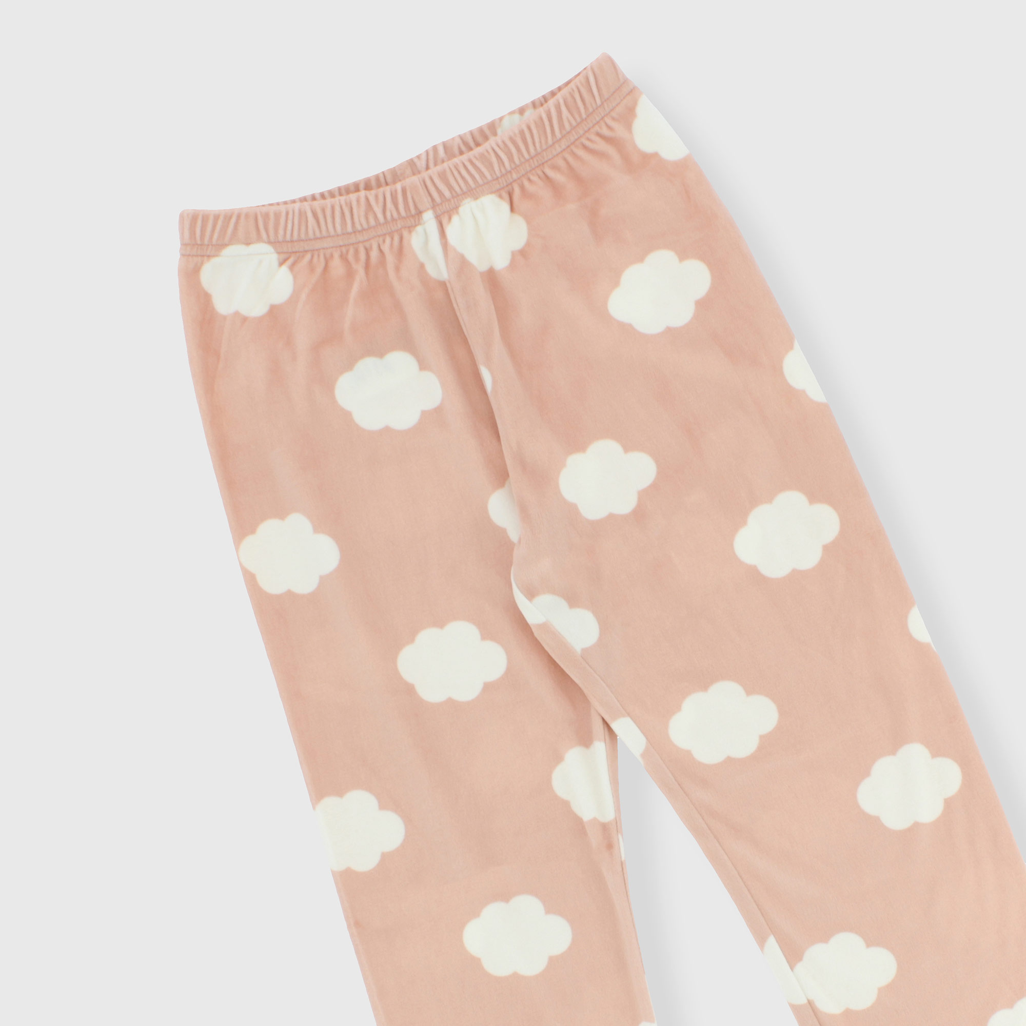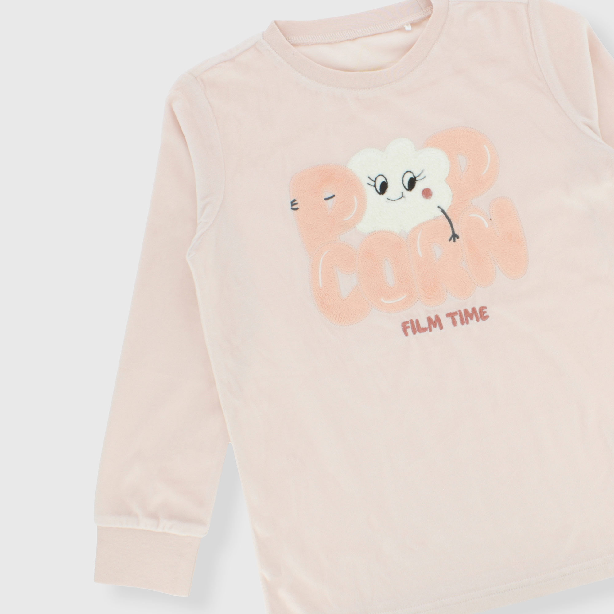 Completo pigiama in ciniglia. Maglia girocollo, a maniche lunghe. Ricamo con applicazione sul davanti. Pantalone con vita elasticizzata e stampa all-over popcorn. Fondo in costina.