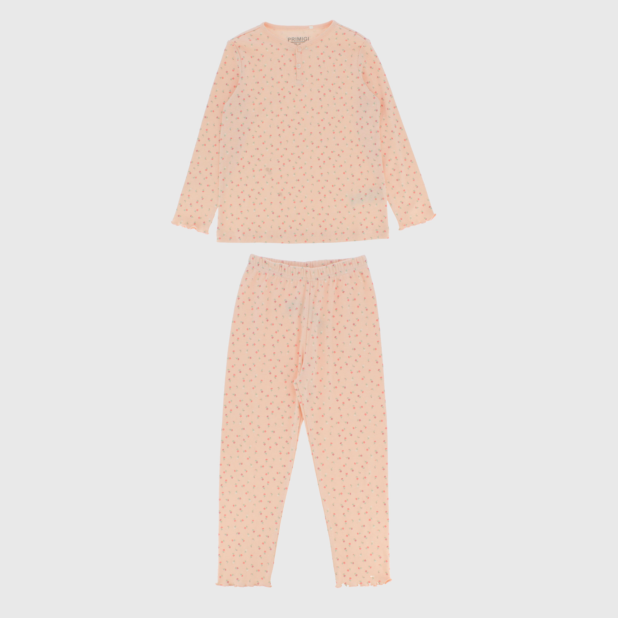 Completo pigiama in costina con stampa all-over fiori. Maglia girocollo a maniche lunghe. Chiusura con bottoncini sul davanti. Leggings con vita elasticizzata.