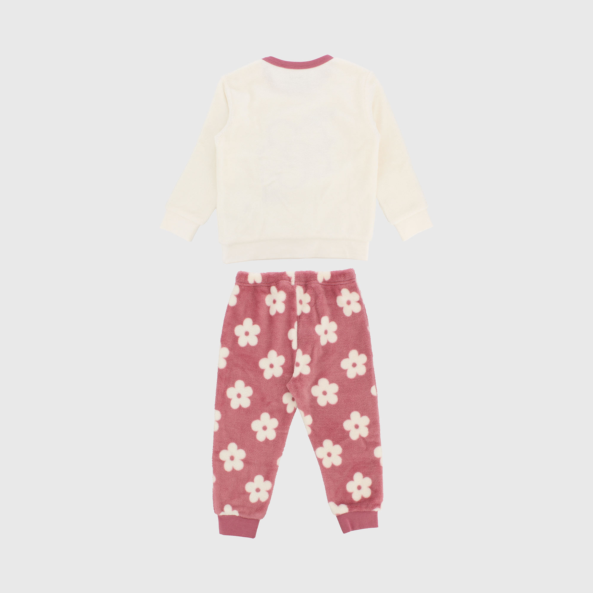 Completo pigiama in pile. Maglia teddy pile, girocollo, a maniche lunghe. Chiusura con bottoncini automatici sulla spalla. Stampa con applicazione sul davanti. Pantalone con vita elasticizzata e stampa all-over fiori. Fondo in costina.