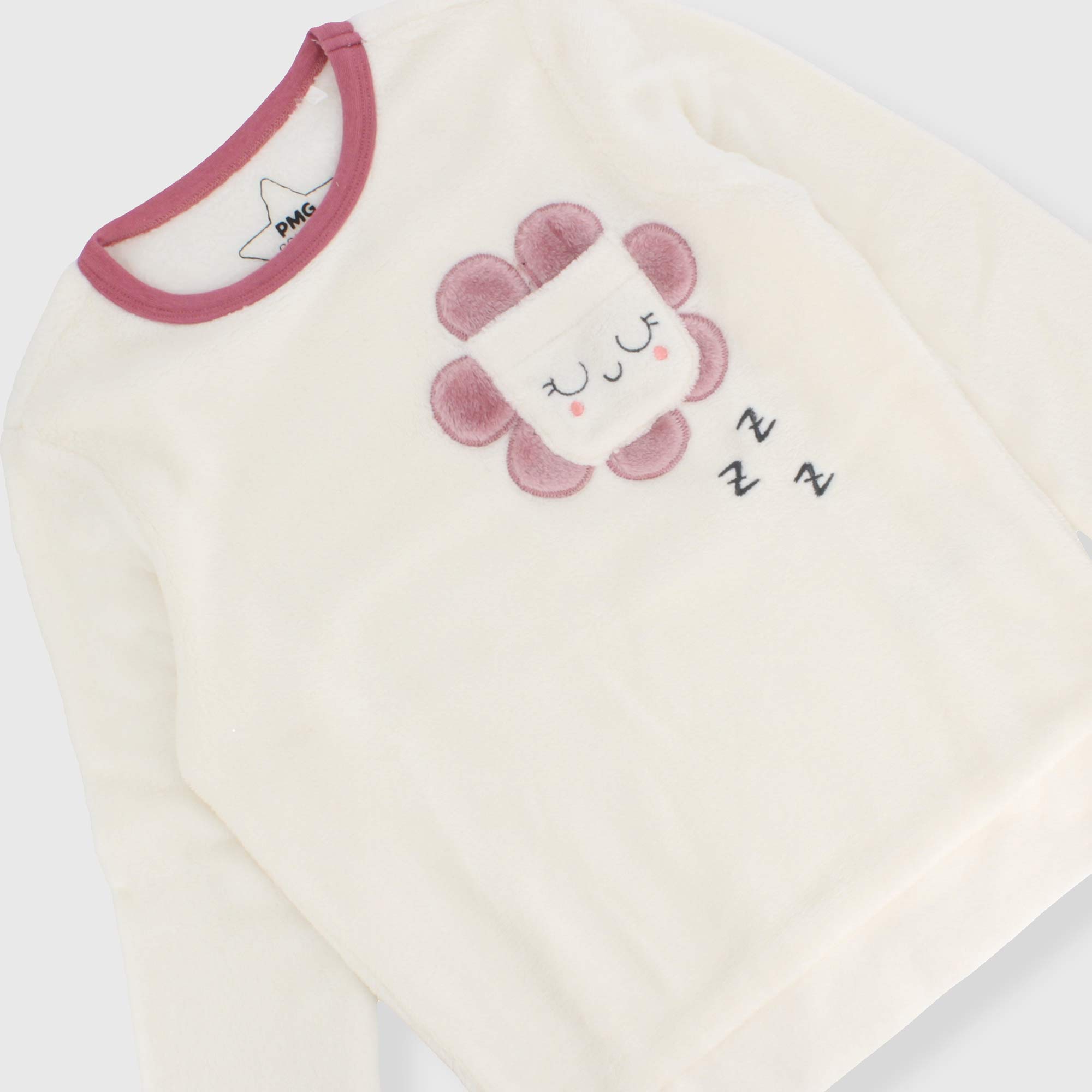 Completo pigiama in pile. Maglia teddy pile, girocollo, a maniche lunghe. Taschino con applicazione fiore sul davanti. Pantalone con vita elasticizzata e stampa all-over fiori. Fondo in costina.
