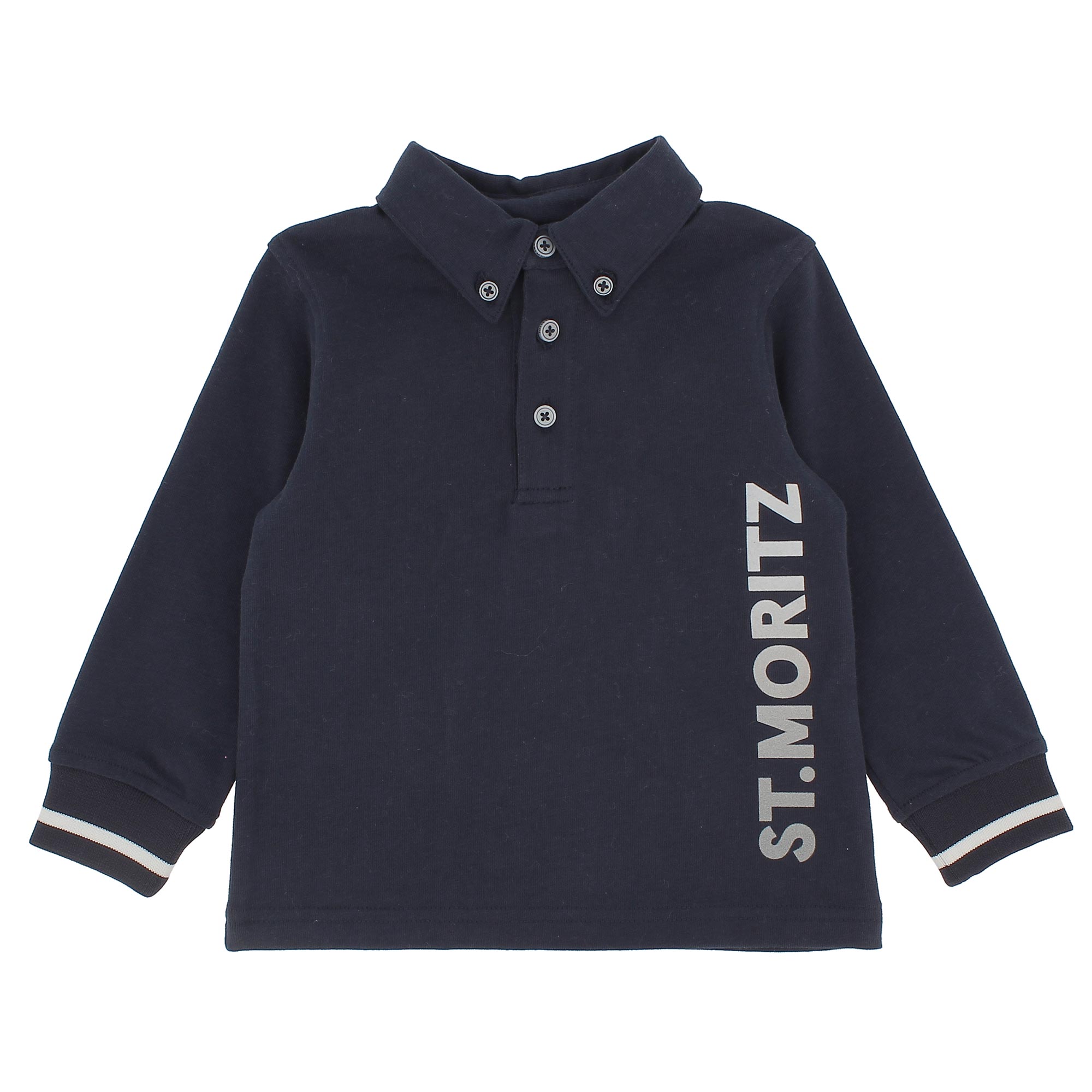 Polo in jersey doppiato, a maniche lunghe. Chiusura con bottoni sul davanti. Stampa effetto velluto sul davanti e polsini in costina con riga a contrasto.