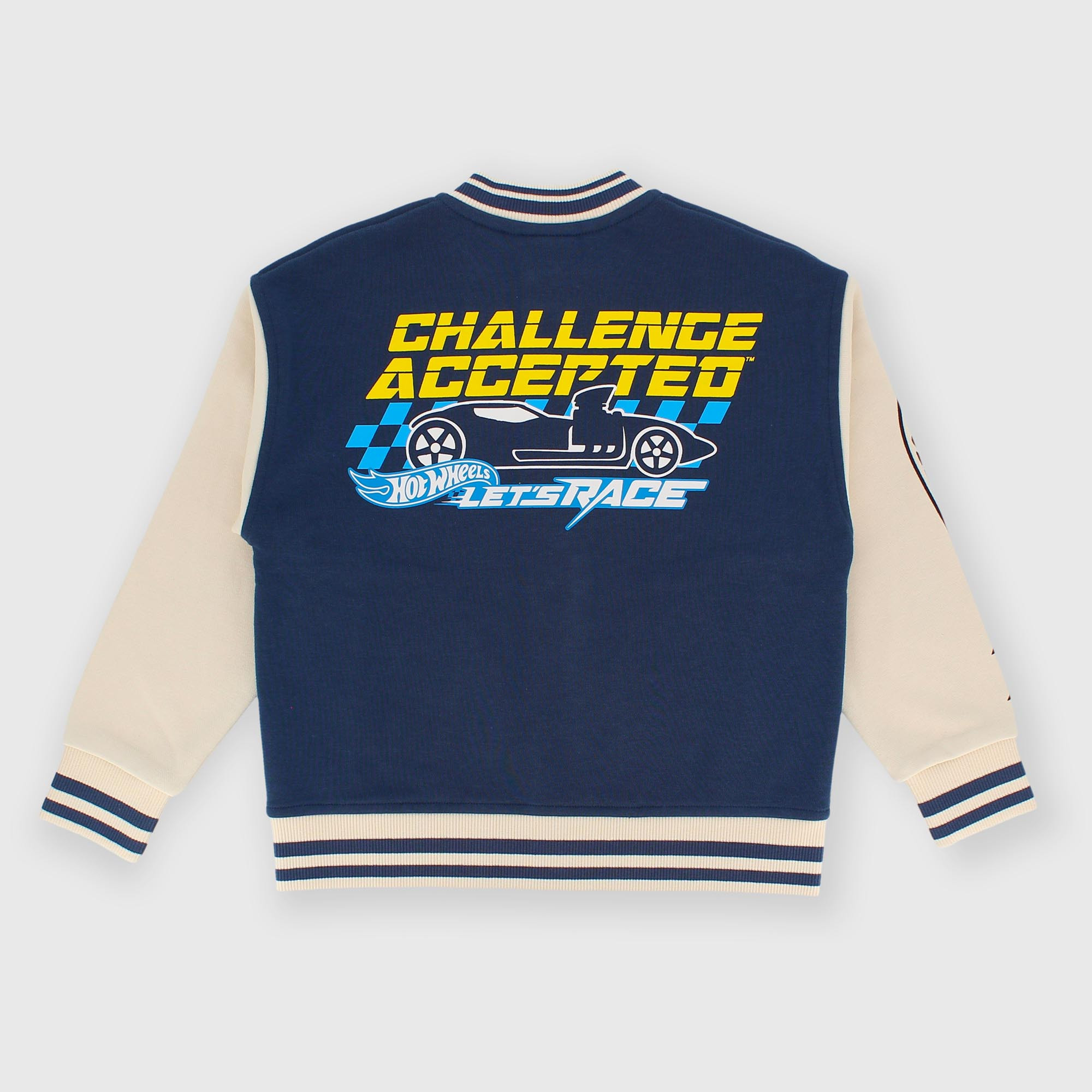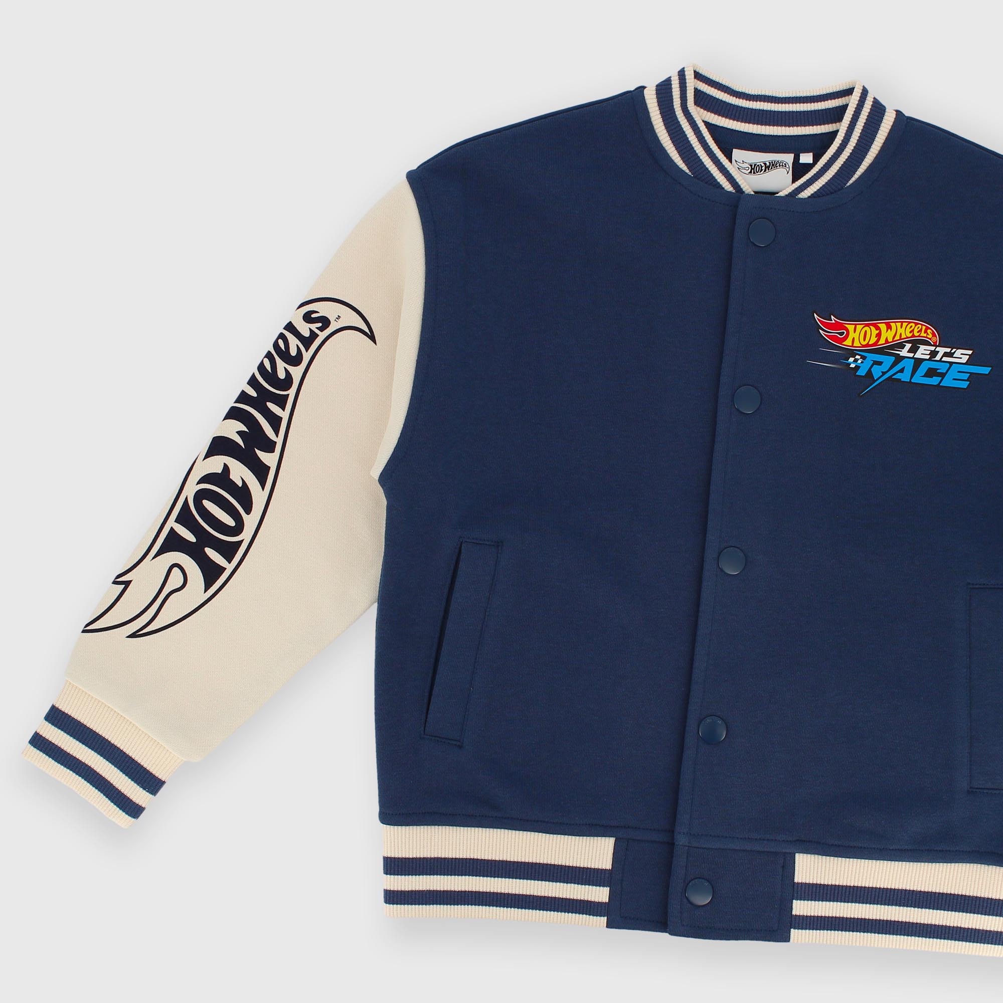 Felpa Hot Wheels™ Let's Race modello bomber a maniche lunghe. Colletto, polsini e fondo in costina a righe. Chiusura con bottoni automatici sul davanti e tasche a filetto. Stampe sul fronte, sul braccio e sul retro. ©2025 Mattel.