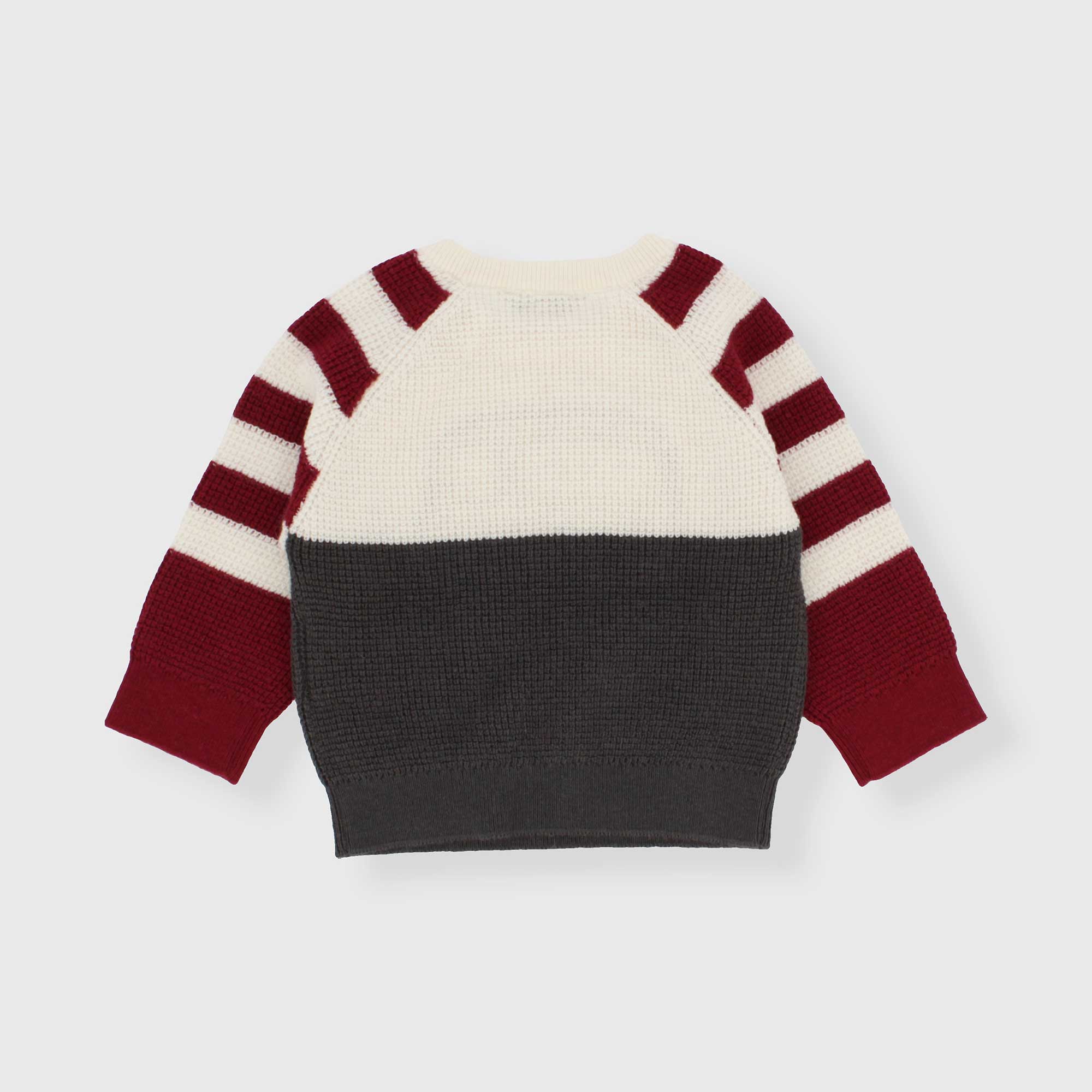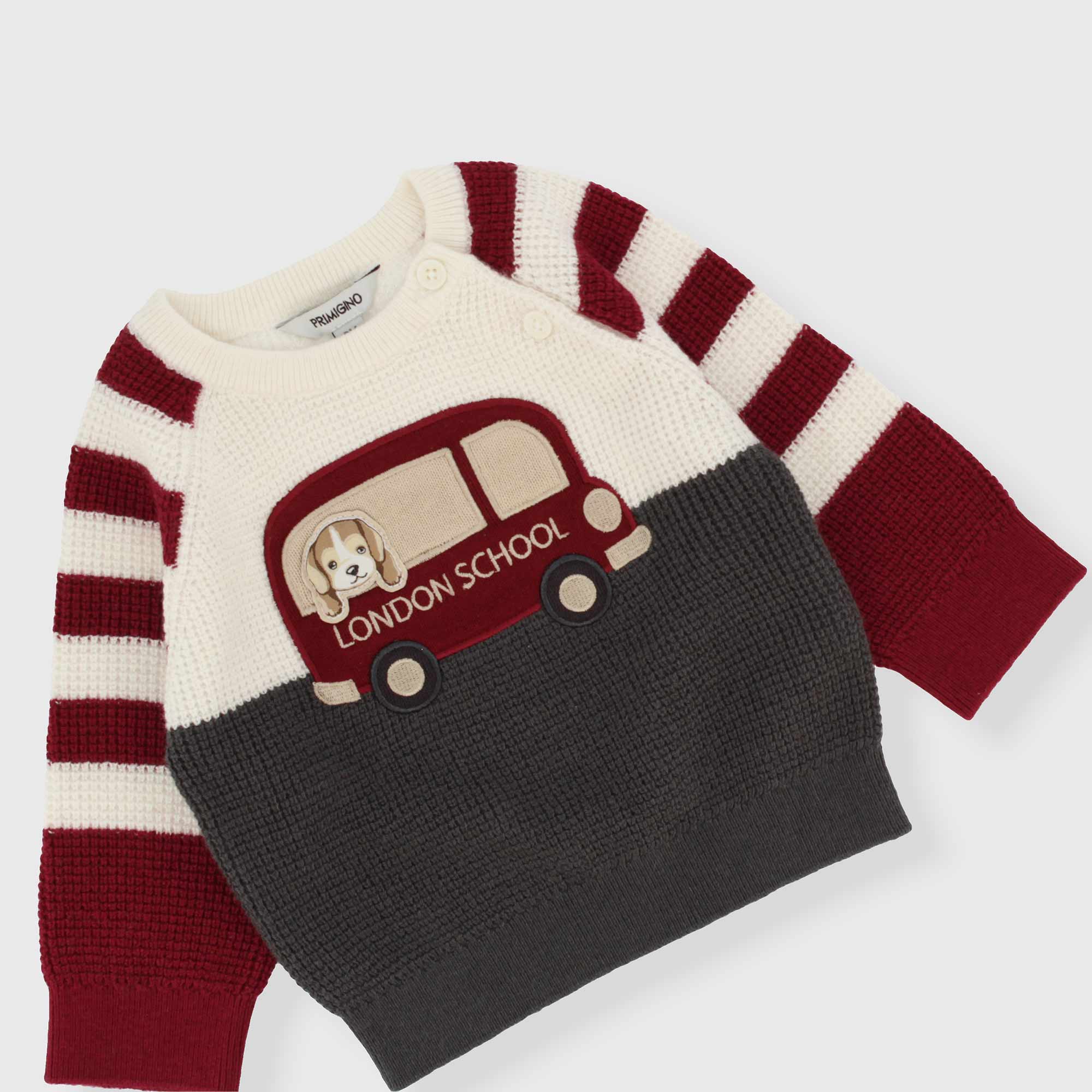 Pullover in morbida maglia, girocollo, a maniche lunghe. Chiusura con bottoncini sulla spalla. Ricamo bus sul davanti.