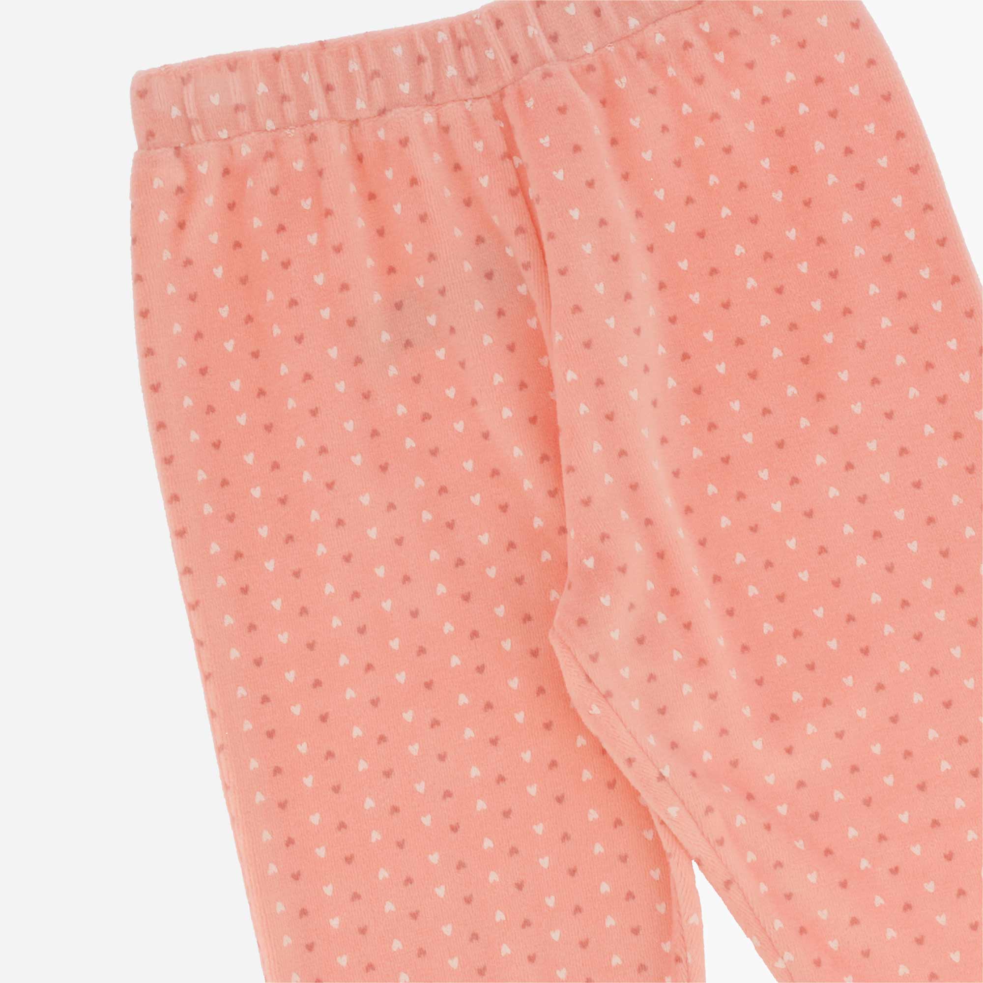 Completo pigiama in ciniglia. Maglia girocollo a maniche lunghe, con ricami sul davanti. Pantalone con vita elasticizzata e fondo in costina. Stampa all-over cuori.