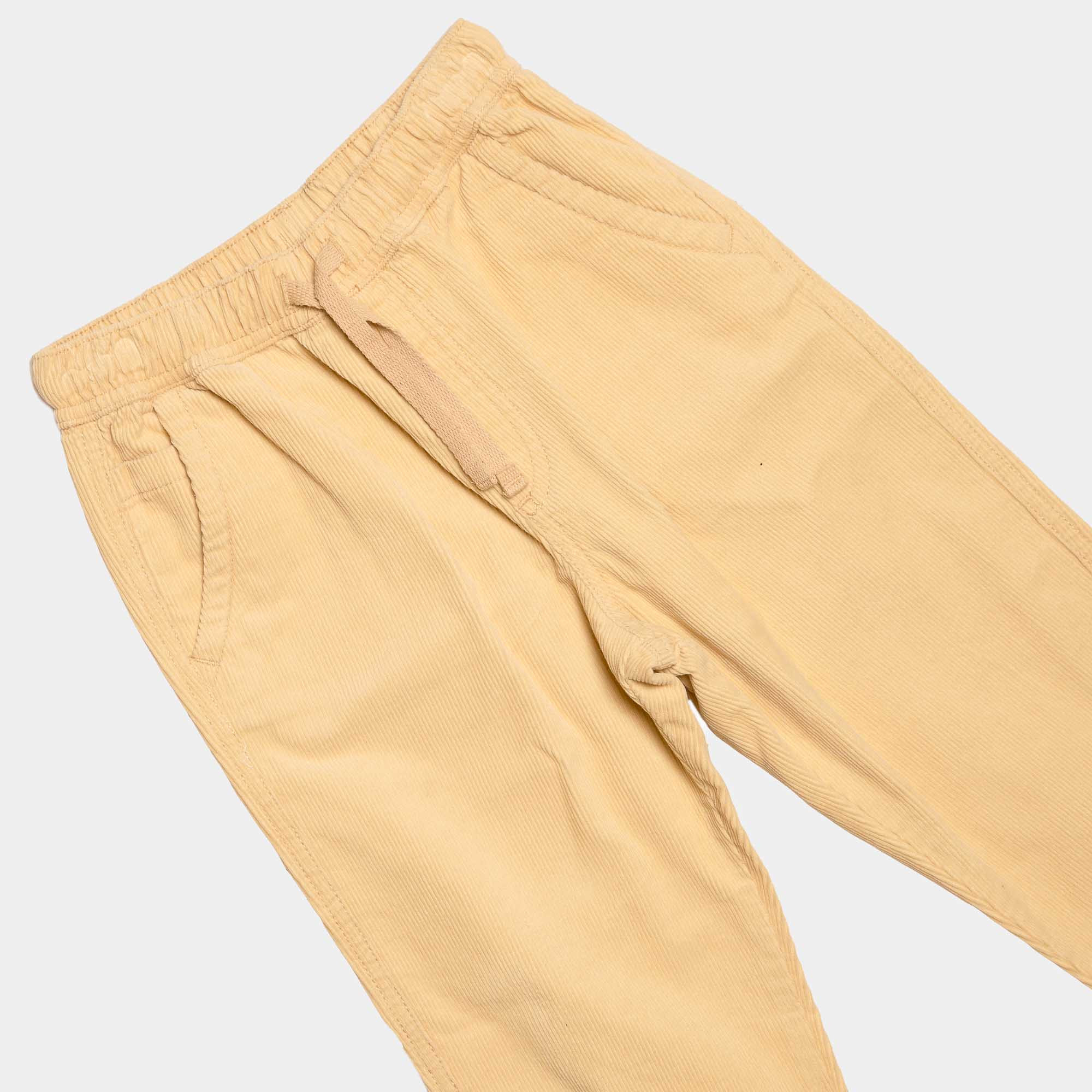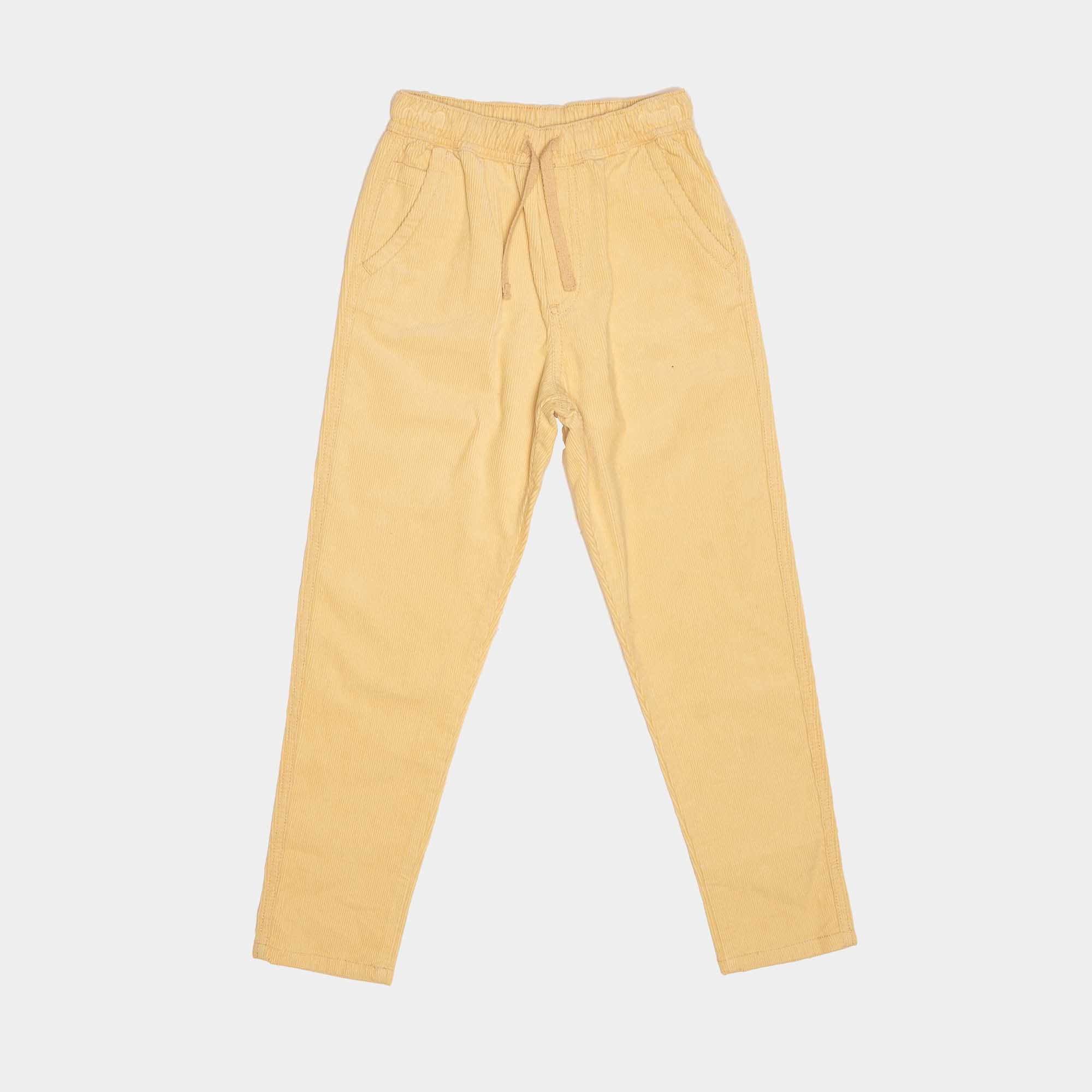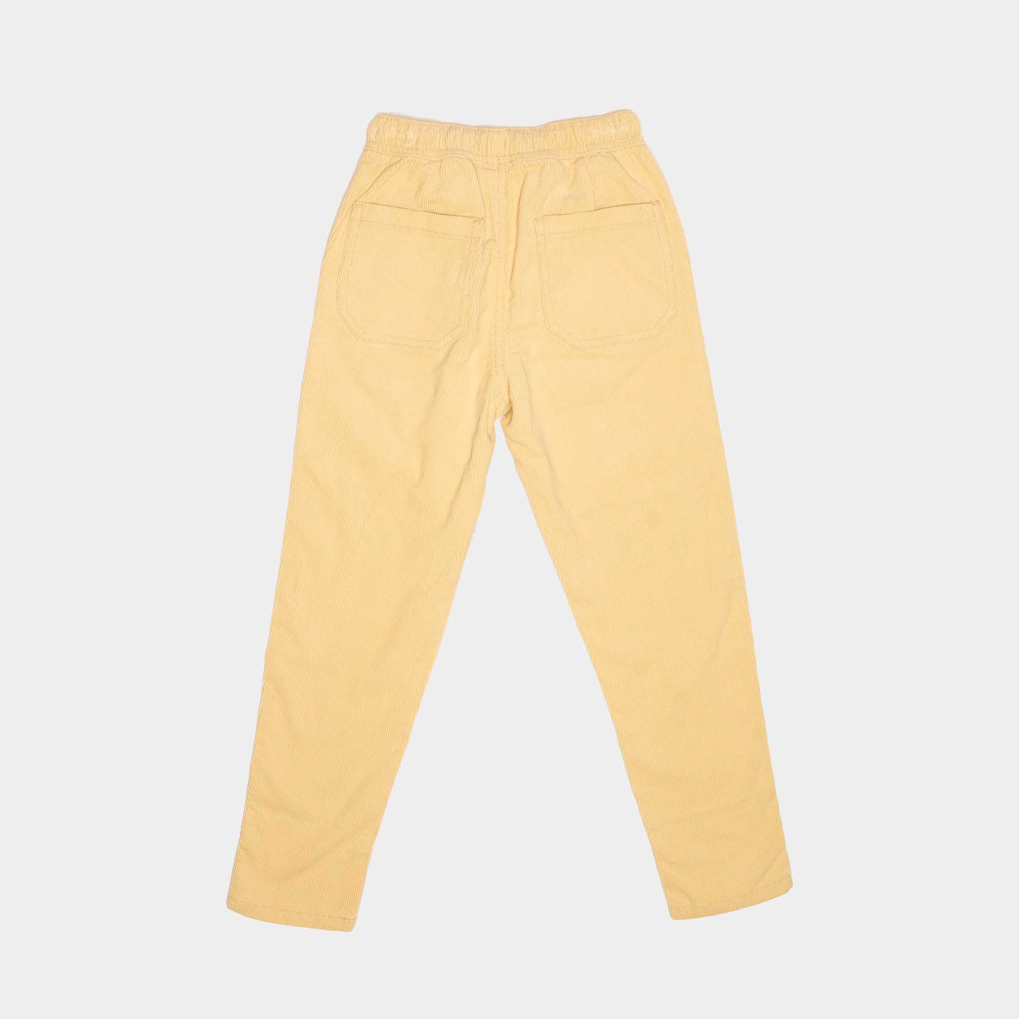 Pantalone in velluto a costine con vita elasticizzata e lacci sul davanti. Tasche alla francese anteriori e a toppa sul retro.