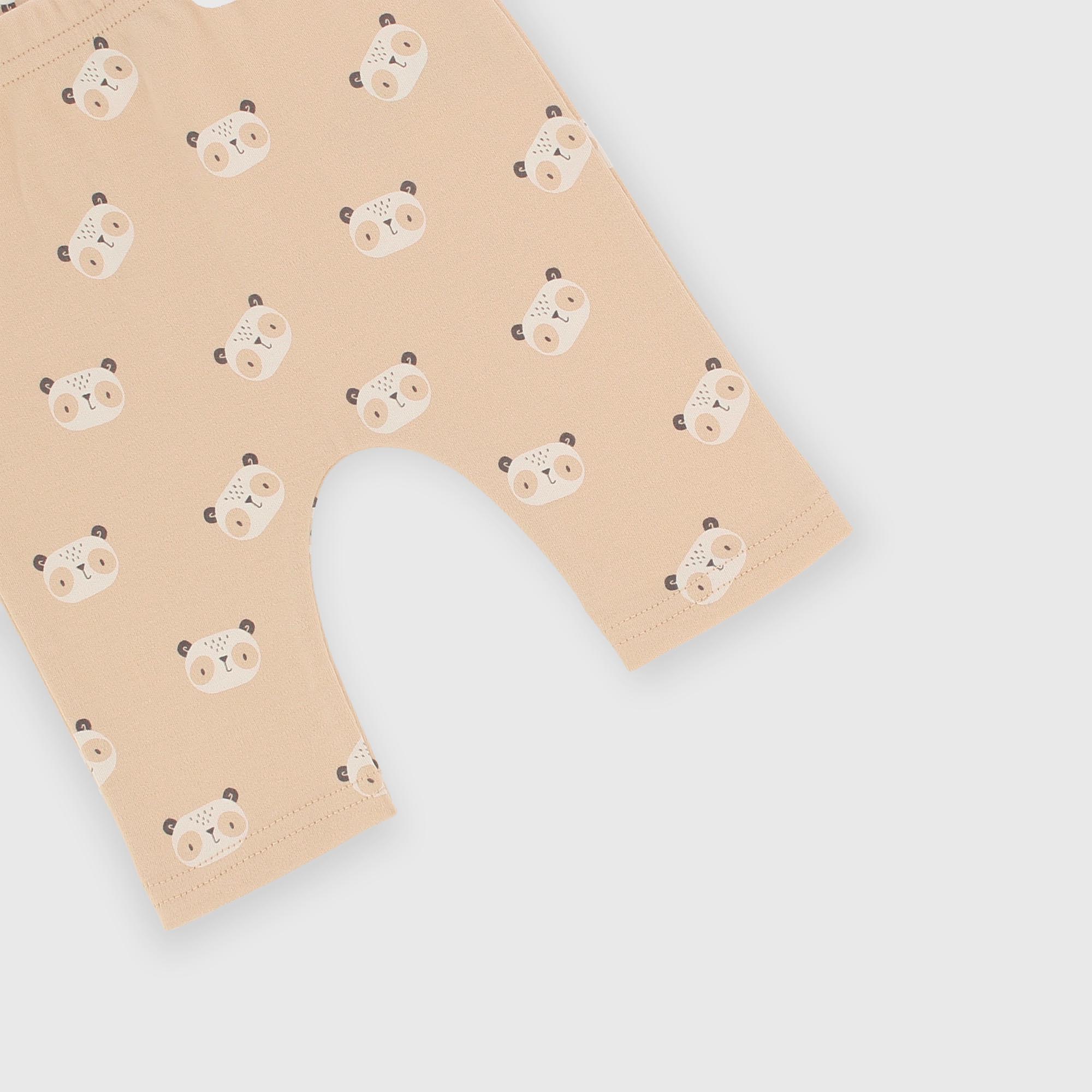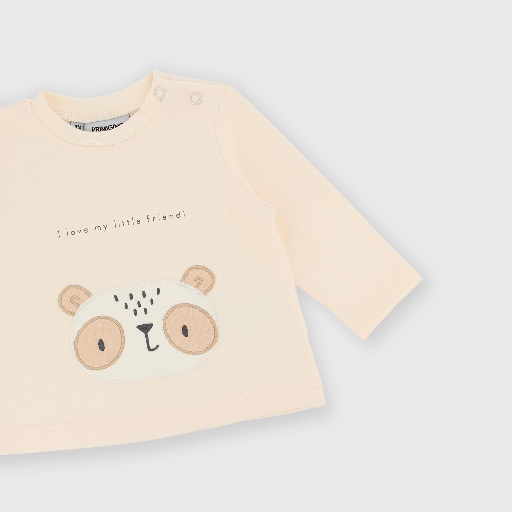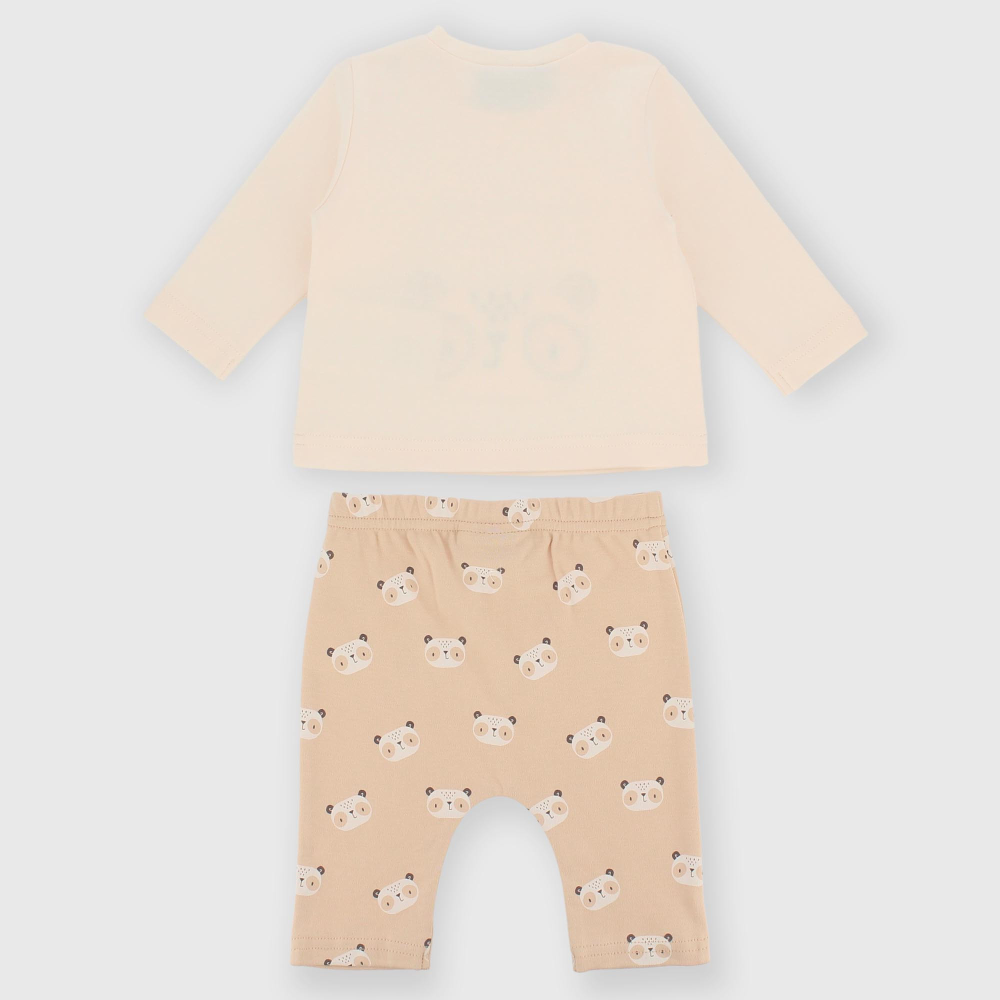 Completo in interlock composto da due pezzi. Maglietta, girocollo, a maniche lunghe. Chiusura con bottoni automatici sulla spalla. Stampa panda sul davanti. Pantalone con vita elasticizzata.