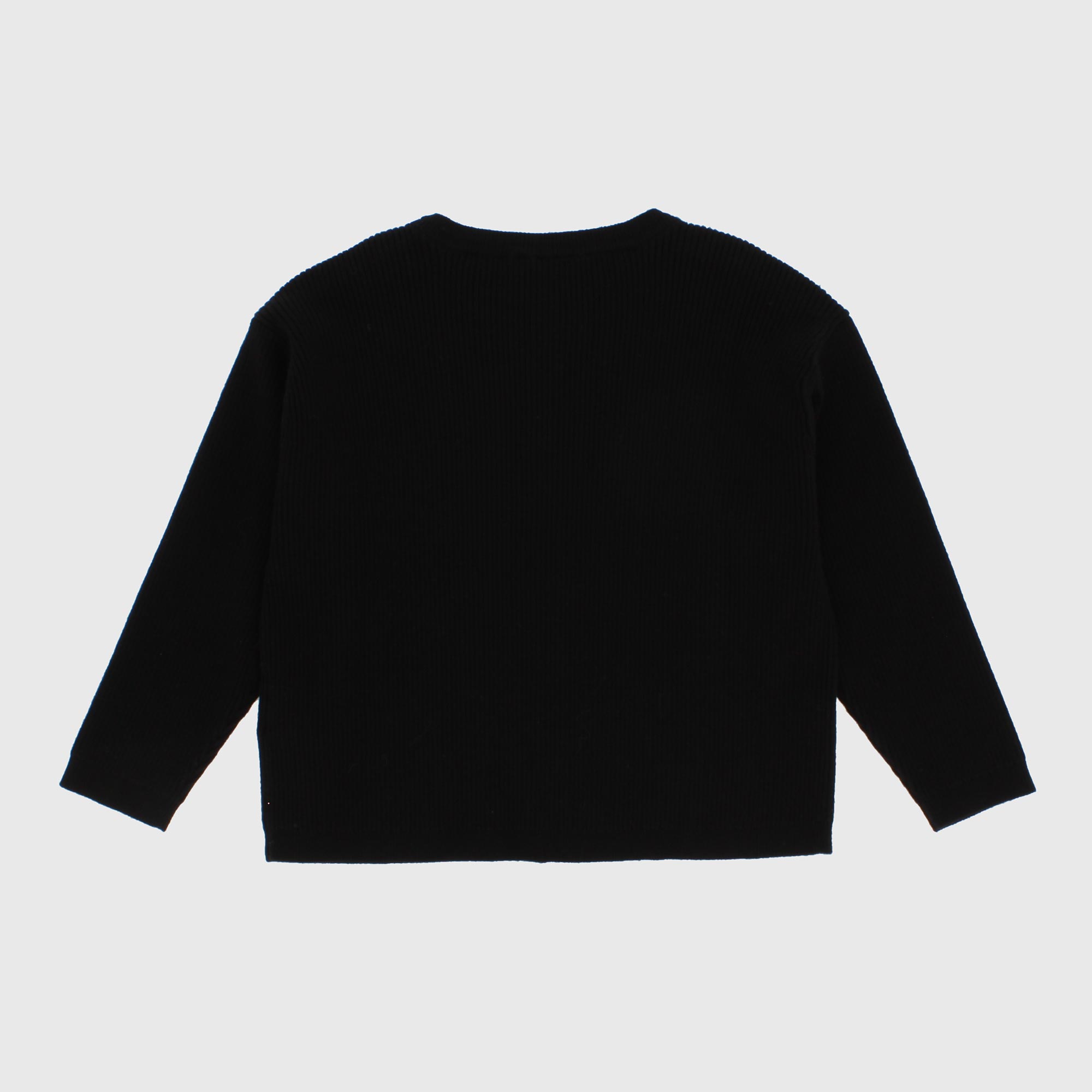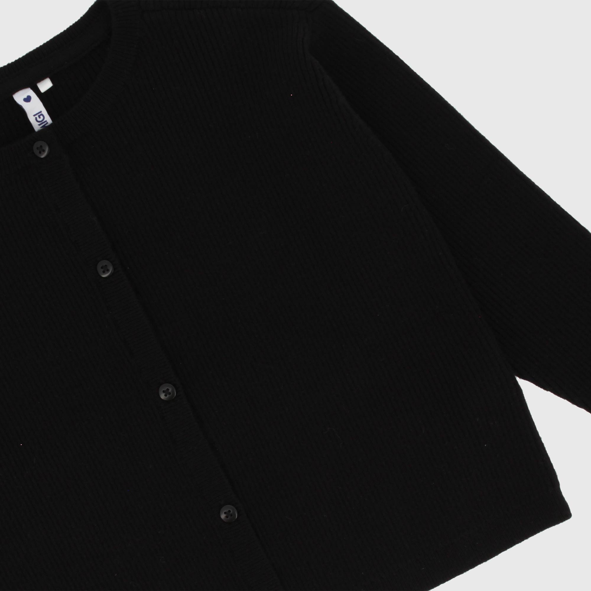 Cardigan in maglia a costine, girocollo, a maniche lunghe. Chiusura con bottoncini sul davanti.
