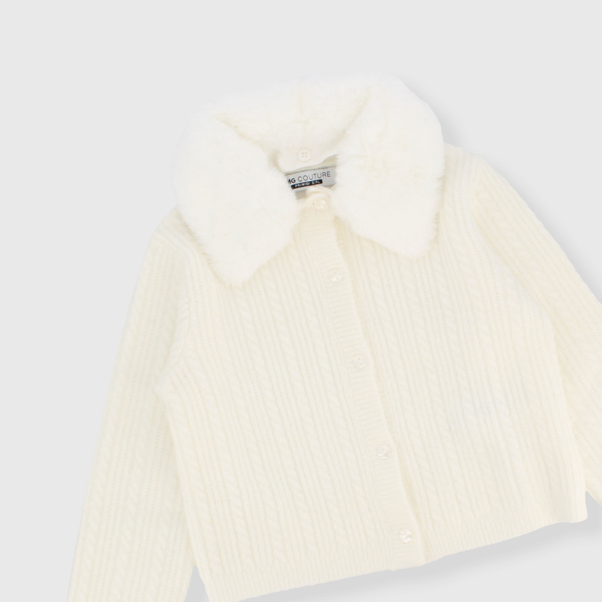 Cardigan in morbida maglia con lavorazione a trecce, a maniche lunghe. Chiusura con bottoni sul davanti. Collo staccabile in ecopelliccia.
