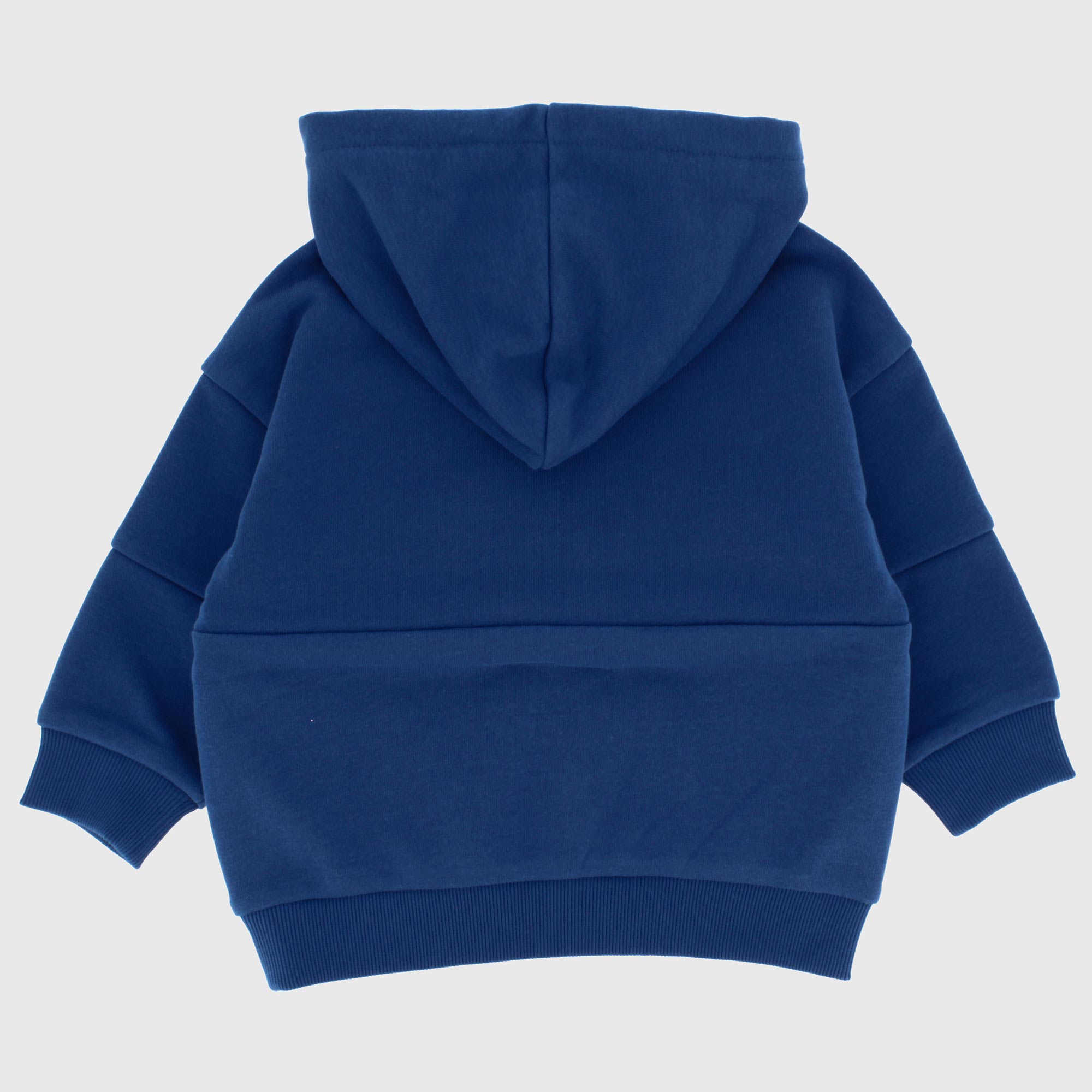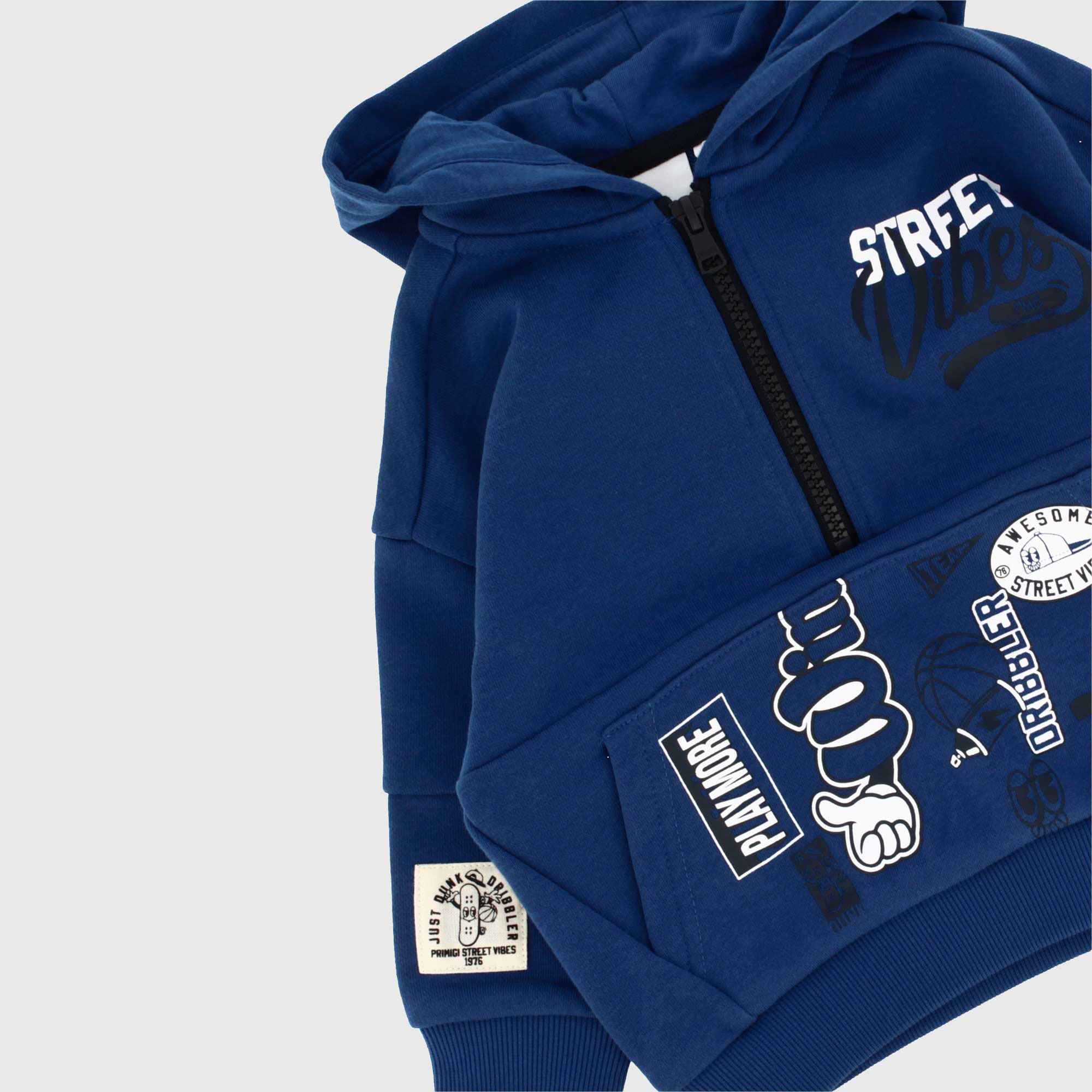 Felpa mezza zip con cappuccio, a maniche lunghe. Tasca a marsupio e stampa sul davanti. Patch con scritte sulla manica. Polsini e fondo in costina.