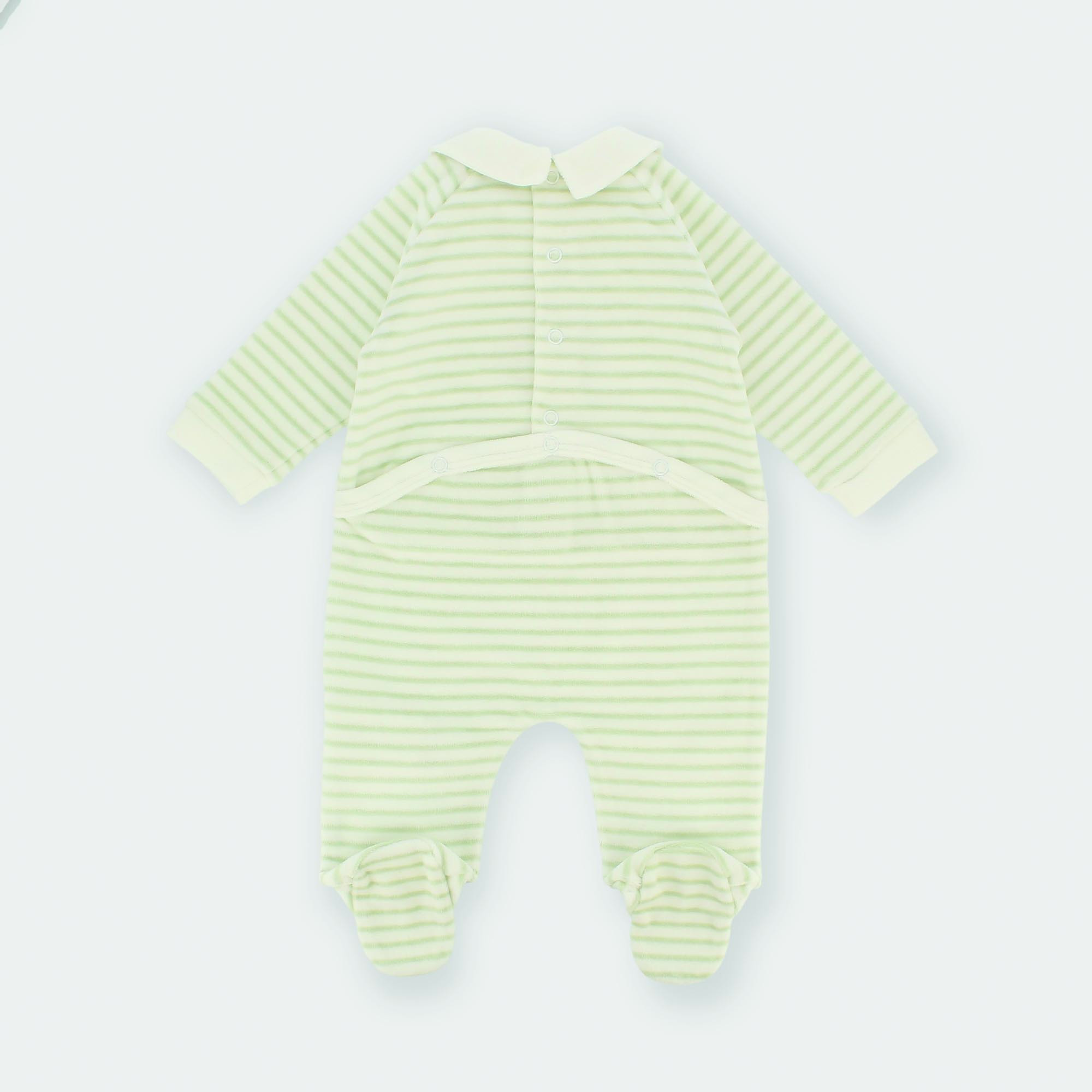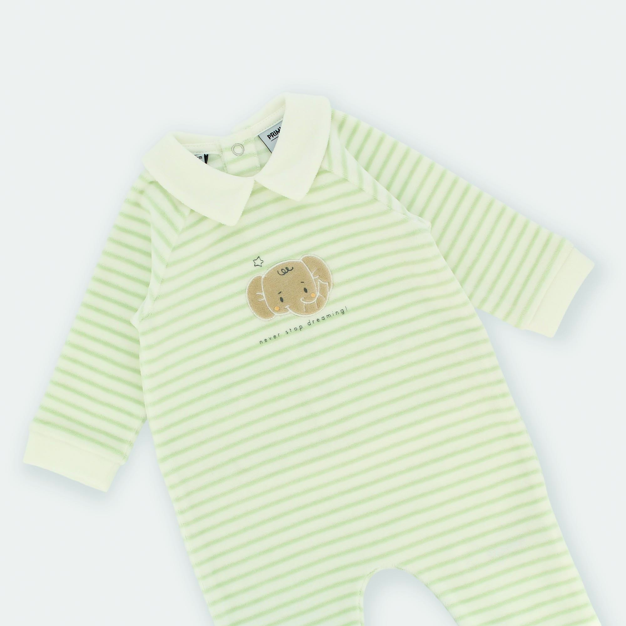 Tutina in ciniglia a righe, con colletto, a maniche lunghe. Chiusura posteriore con bottoncini automatici. Applicazione elefante sul davanti.