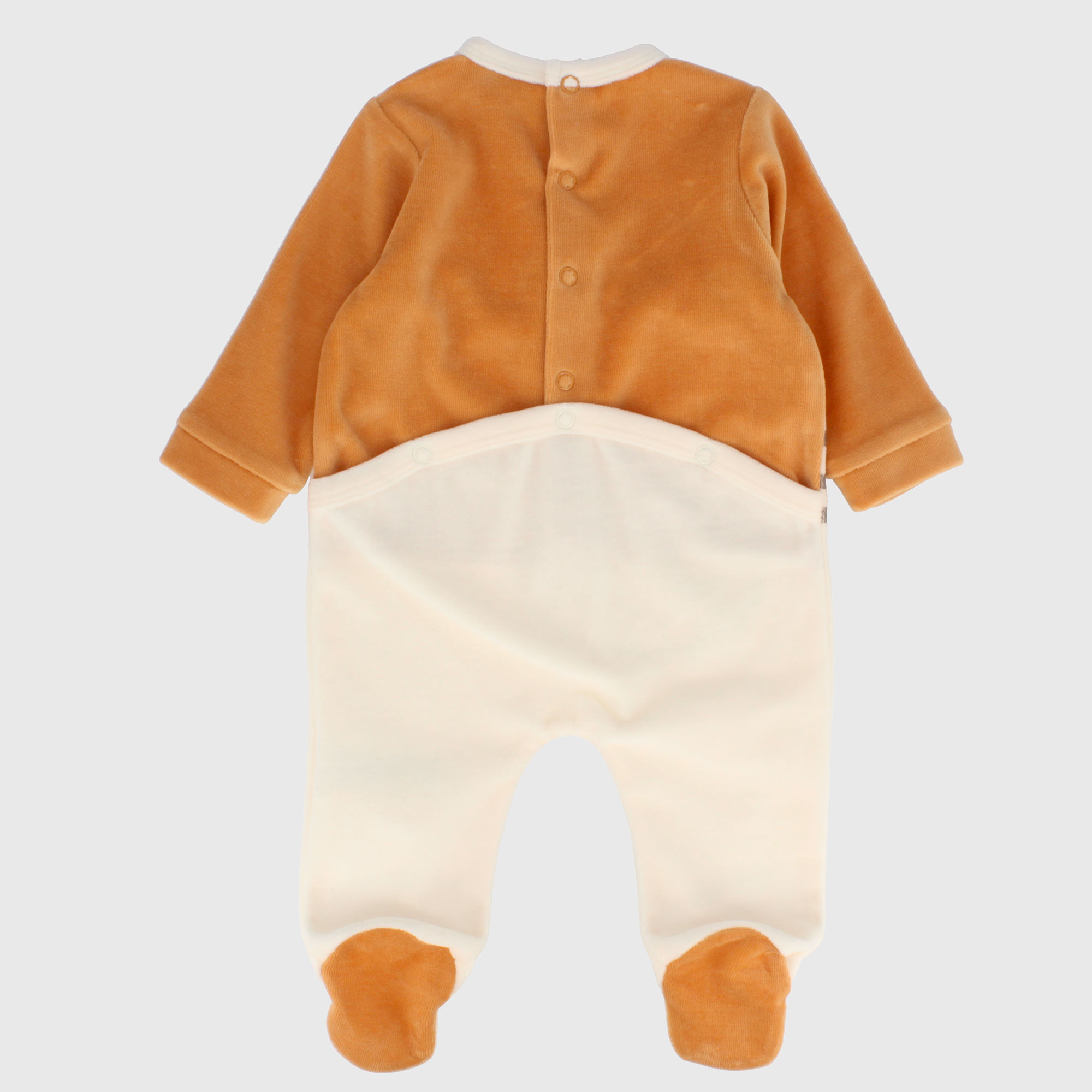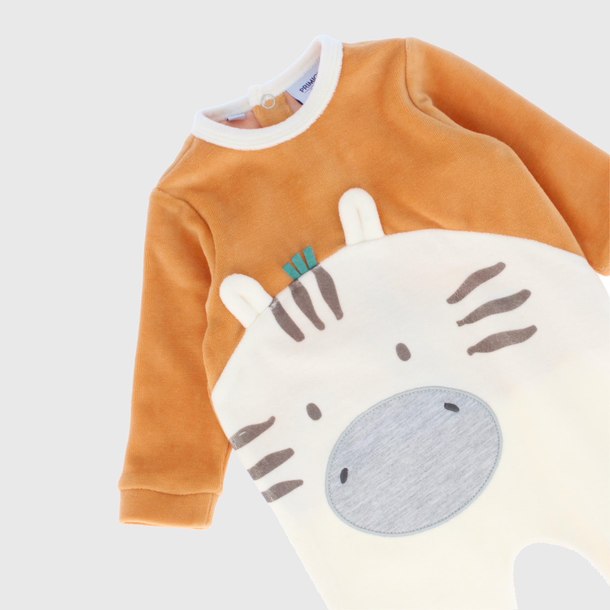 Tutina in ciniglia, girocollo, a maniche lunghe. Chiusura con bottoncini automatici sul retro. Zebra stampata con orecchiette applicate sul davanti.