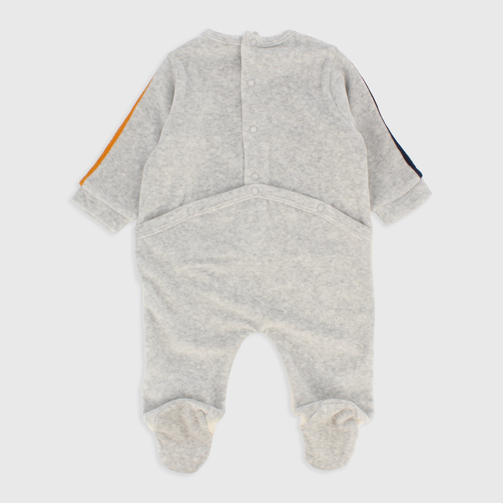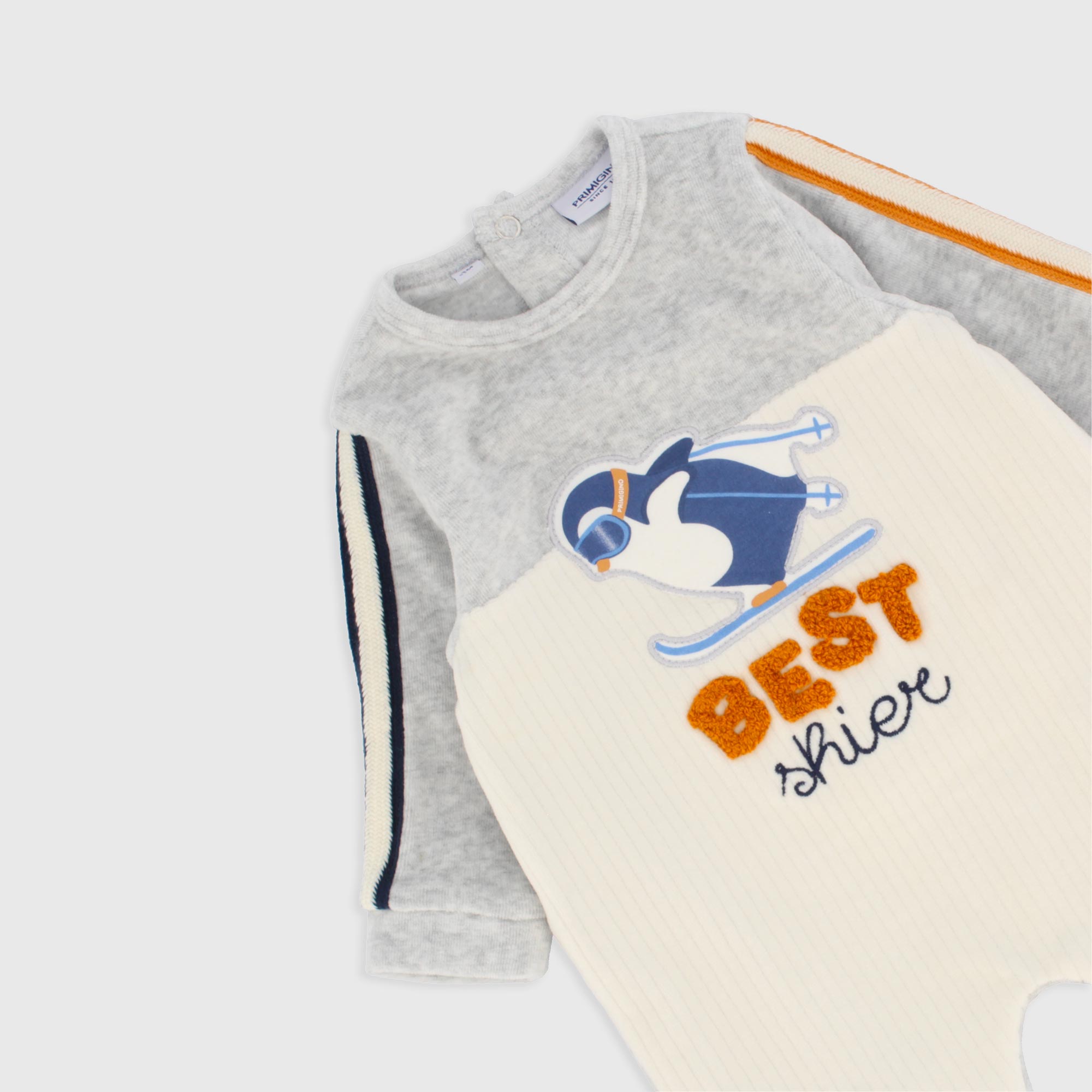 Tutina in ciniglia, girocollo, a maniche lunghe. Chiusura con bottoncini automatici sul retro. Pinguino e applicazioni effetto spugna sul davanti.