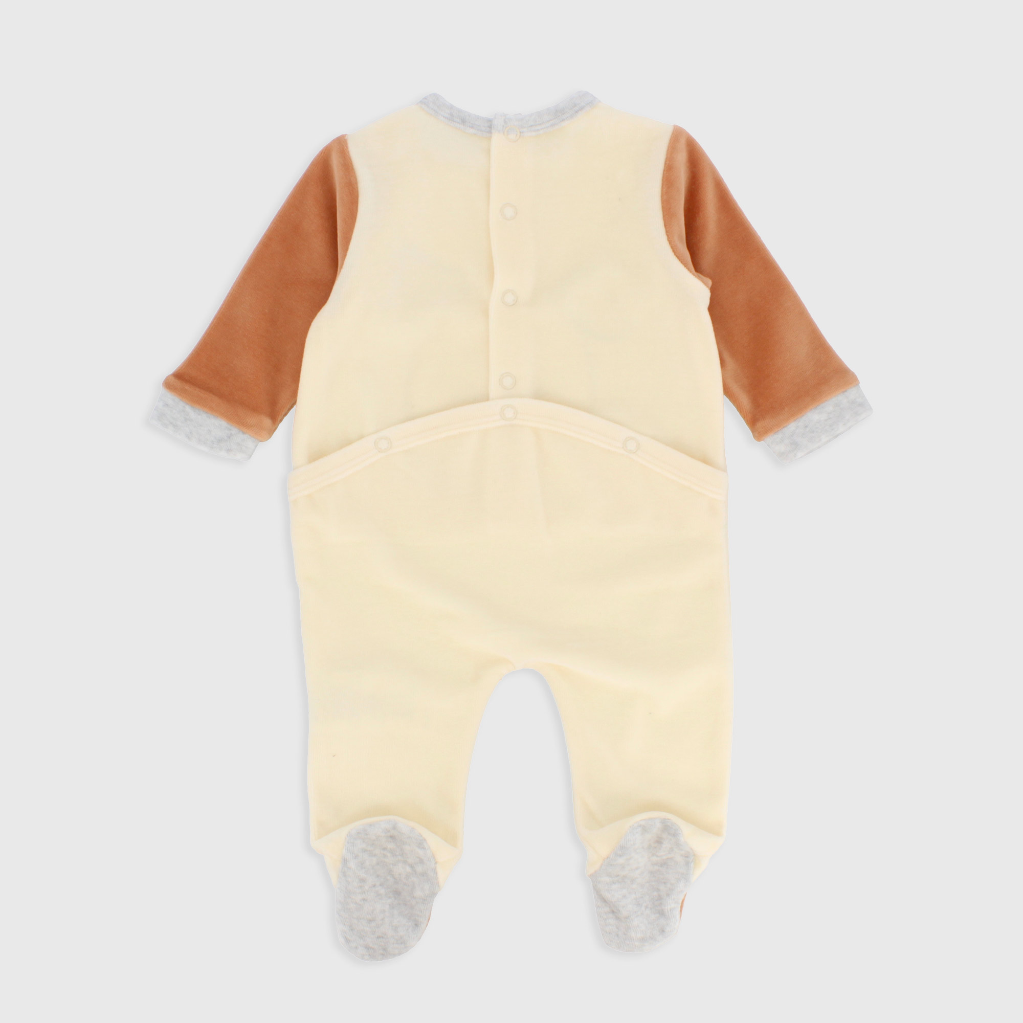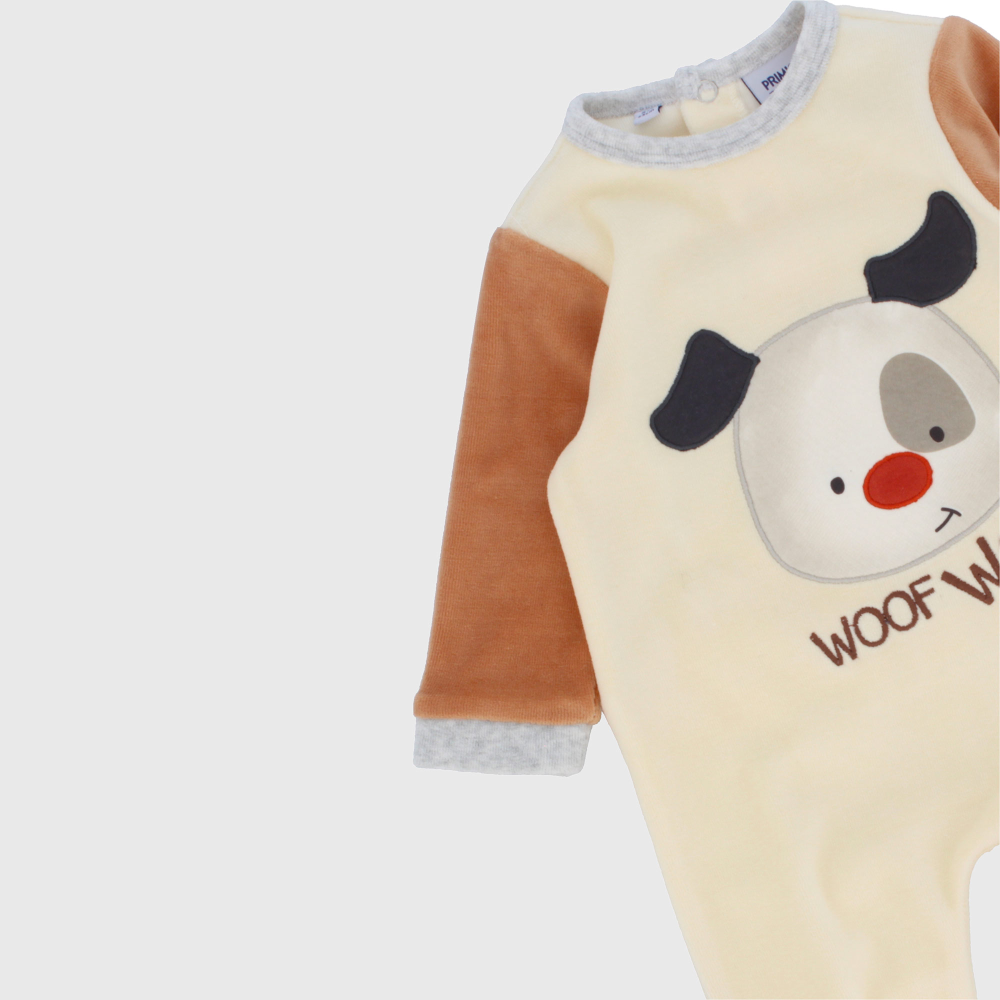 Tutina in ciniglia, girocollo, a maniche lunghe. Chiusura con bottoncini automatici sul retro. Cagnolino sul davanti.