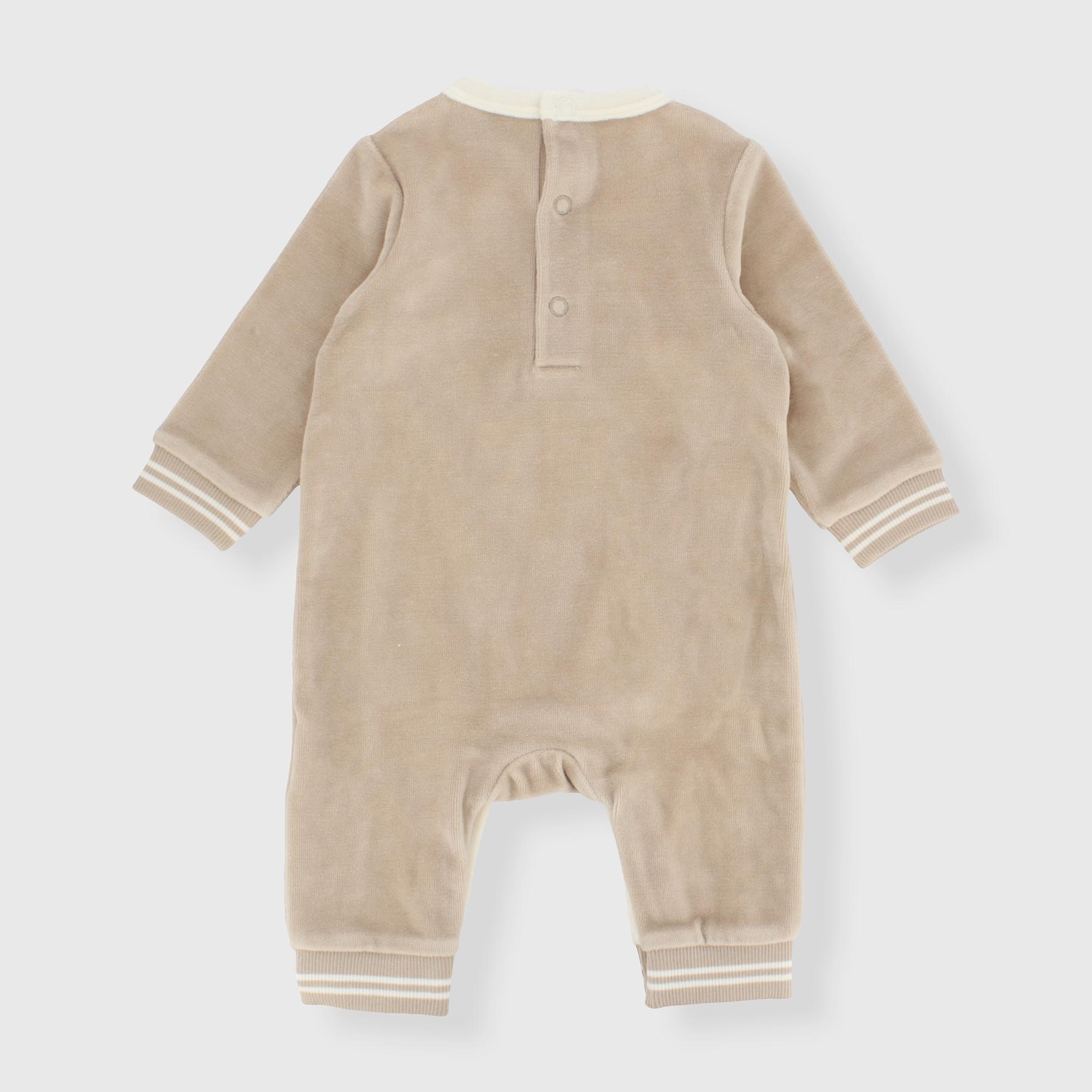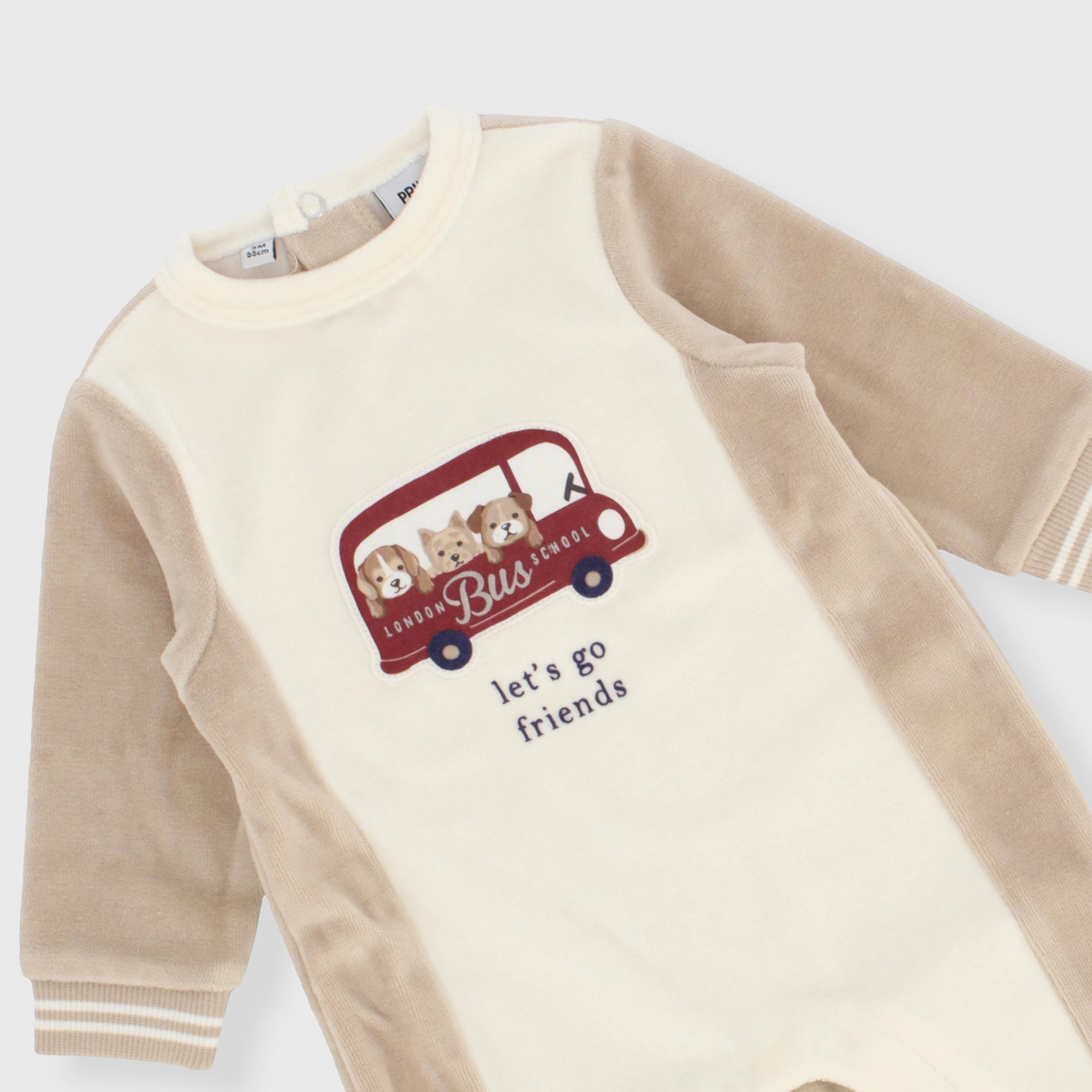 Tutina in ciniglia, girocollo, a maniche lunghe. Chiusura con bottoncini automatici sul retro e sul cavallo. Stampa e patch sul davanti. Polsini e fondo in costina a righe.