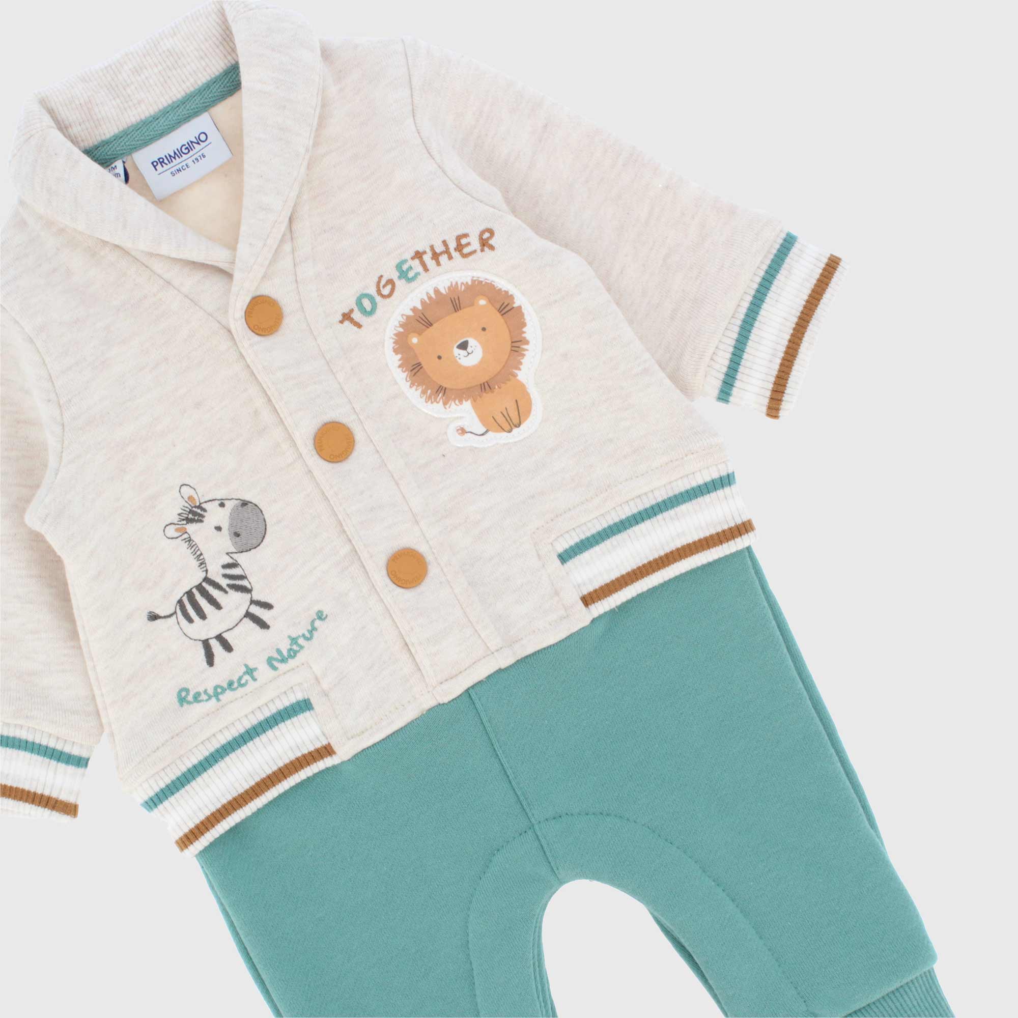 Tutina in felpa con colletto, a maniche lunghe. Chiusura con bottoncini automatici sul davanti e sul cavallo. Applicazioni ricamate sul davanti. Polsini e fondo maglia in costina a righe.