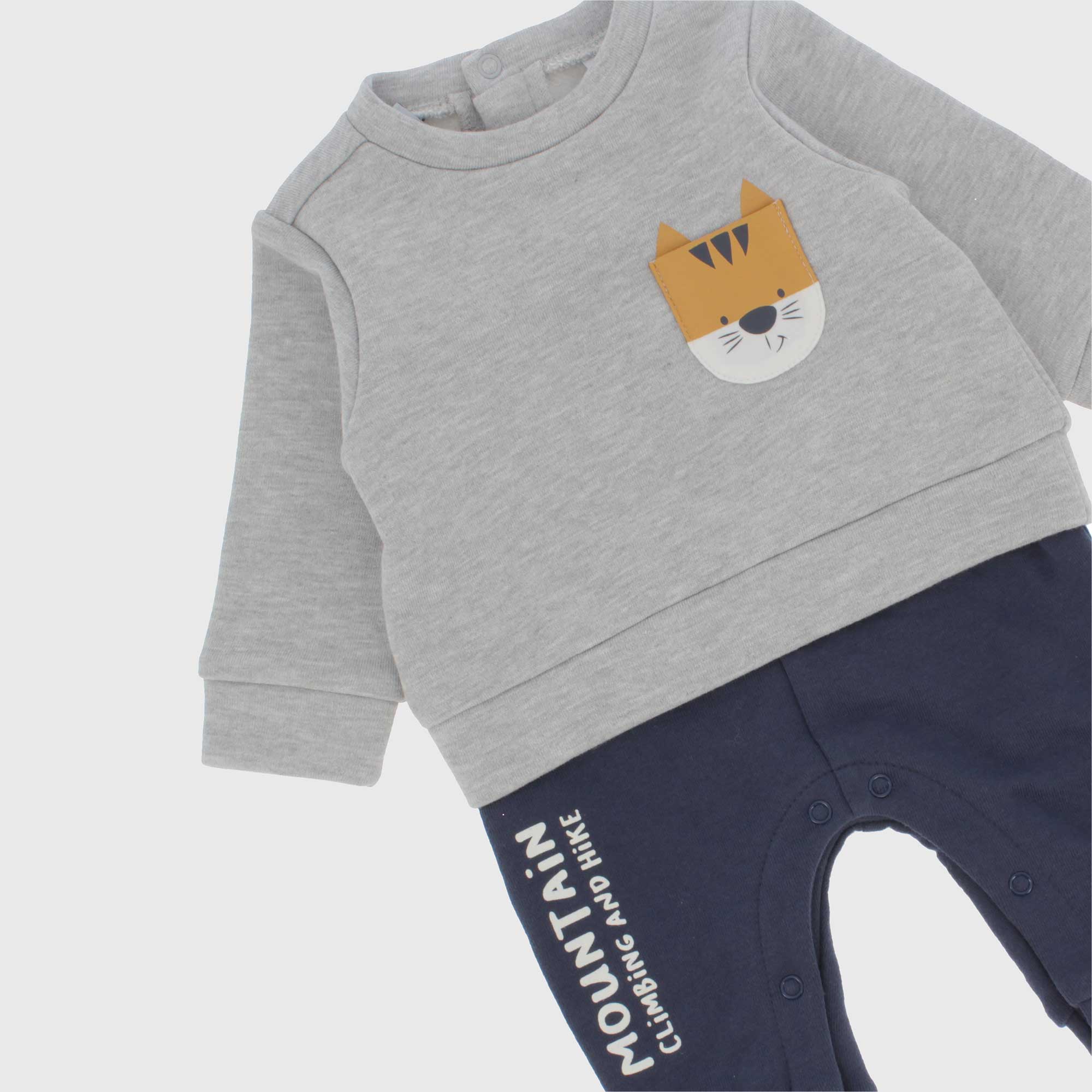 Tutina in felpa con collo rotondo, a maniche lunghe. Chiusura con bottoncini automatici sul retro e sul cavallo. Taschina ad animaletto sul davanti. Stampa sulla gamba e toppe sulle maniche.