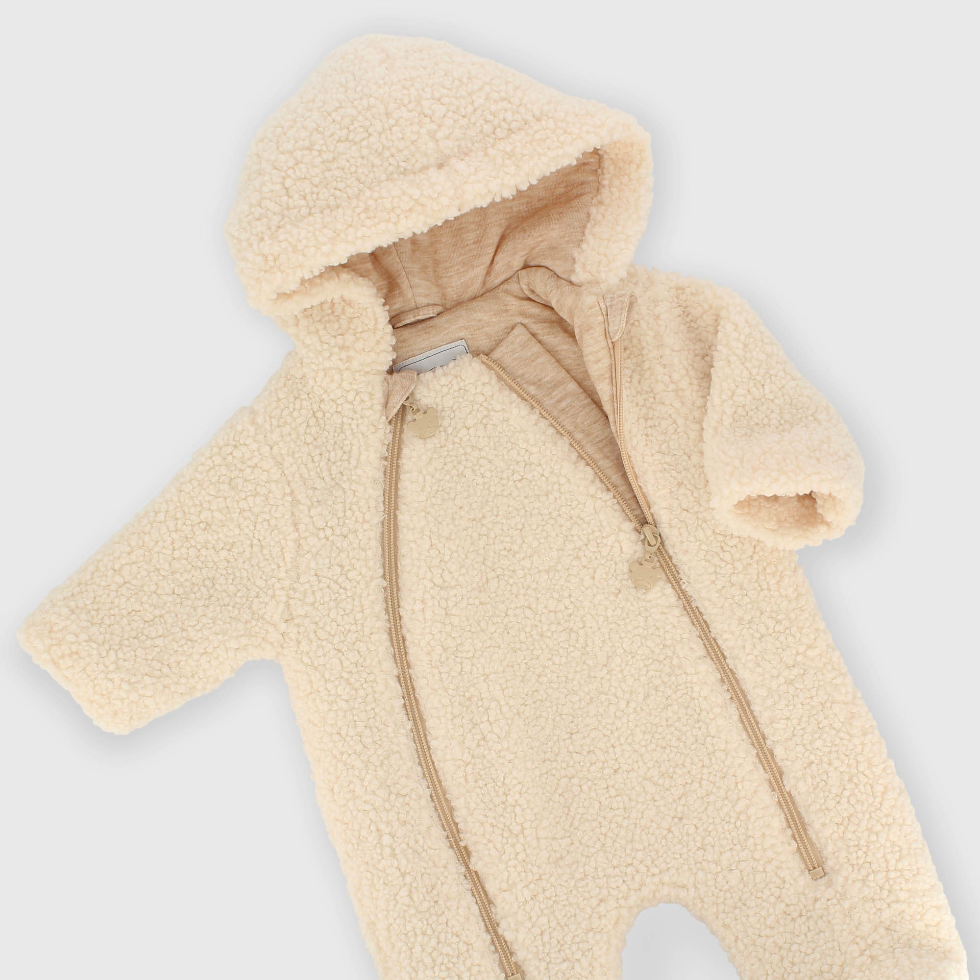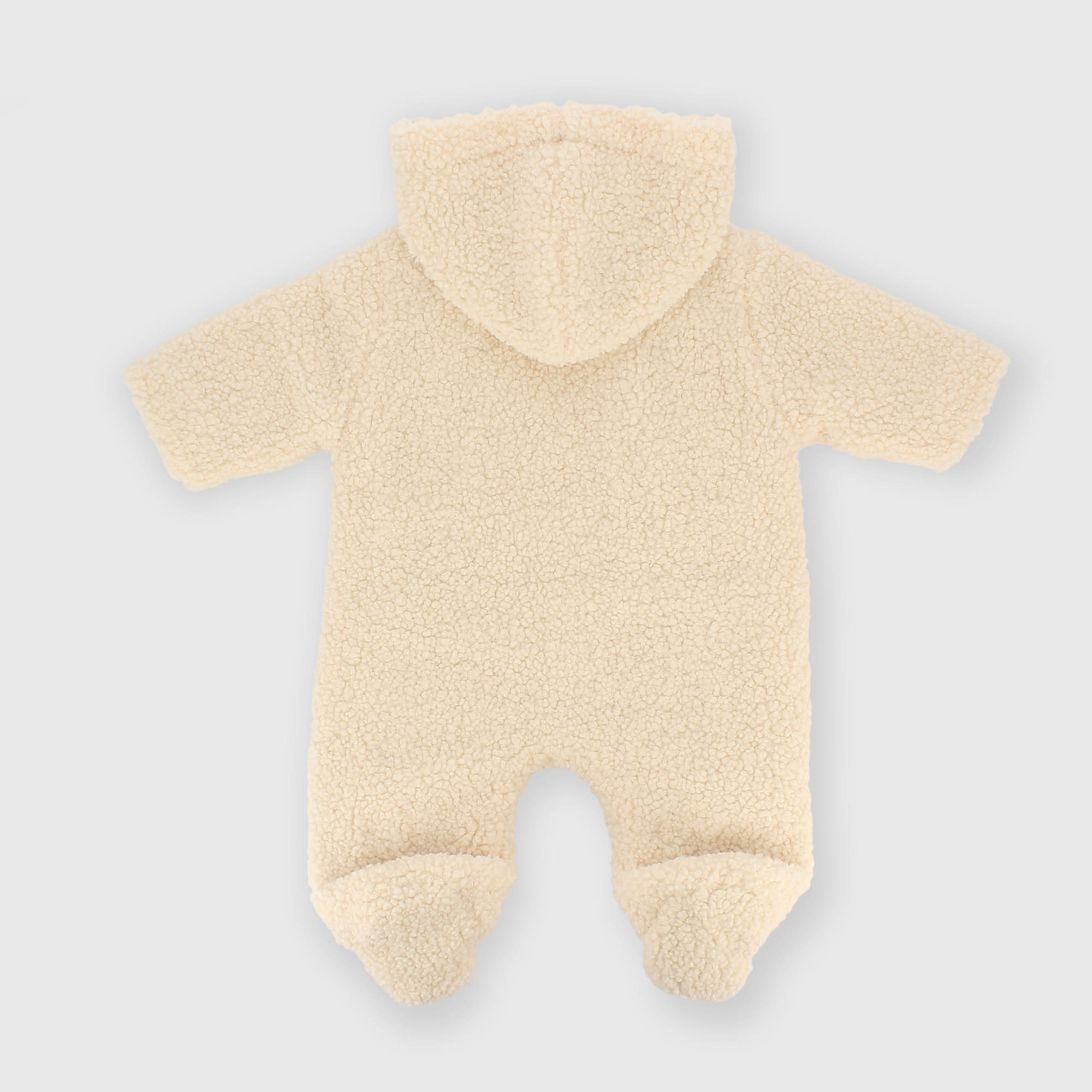 Tuta imbottita in finta pelliccetta, con cappuccio, a maniche lunghe. Guantini e piedini staccabili. Chiusura con zip sul davanti. Fodera interna in pile.