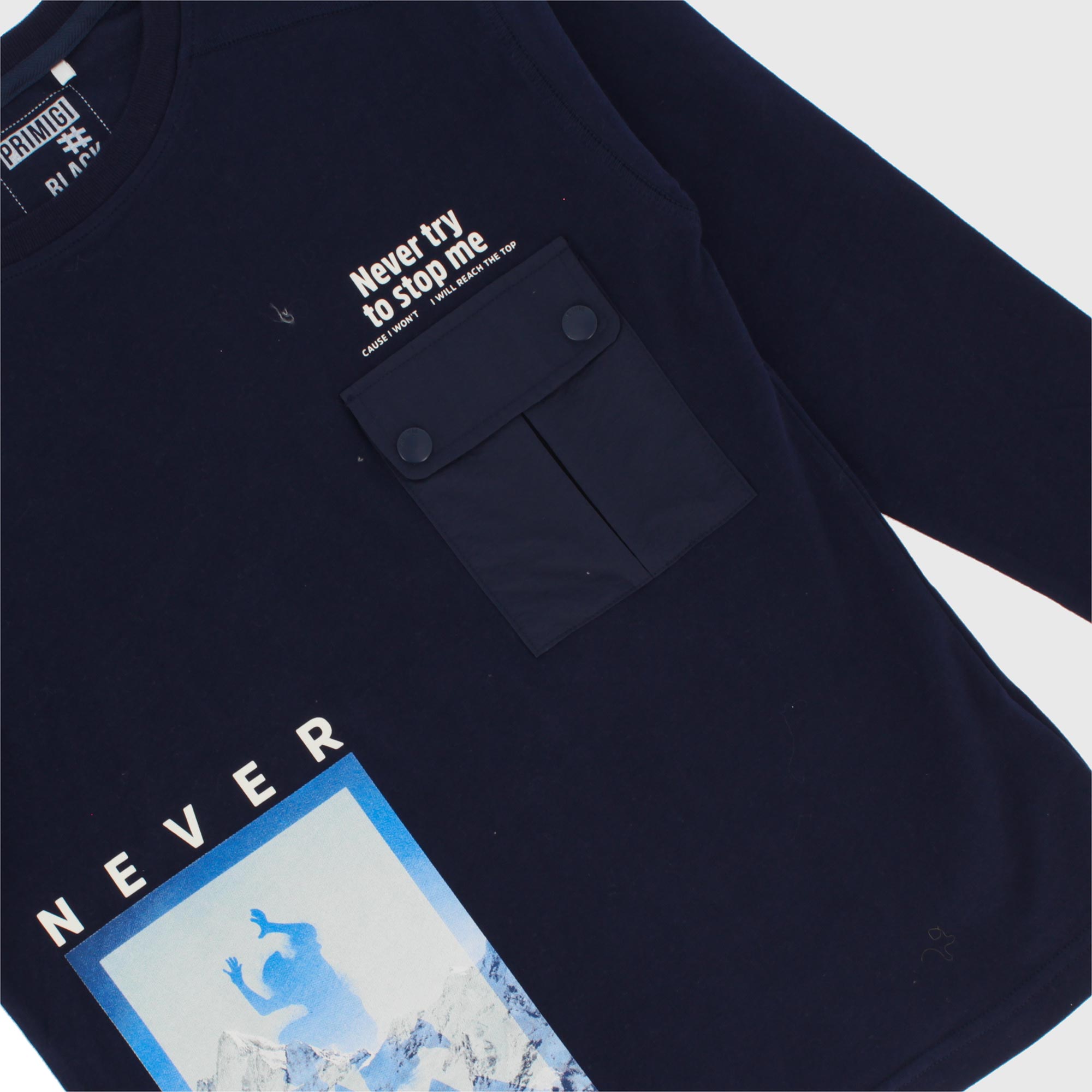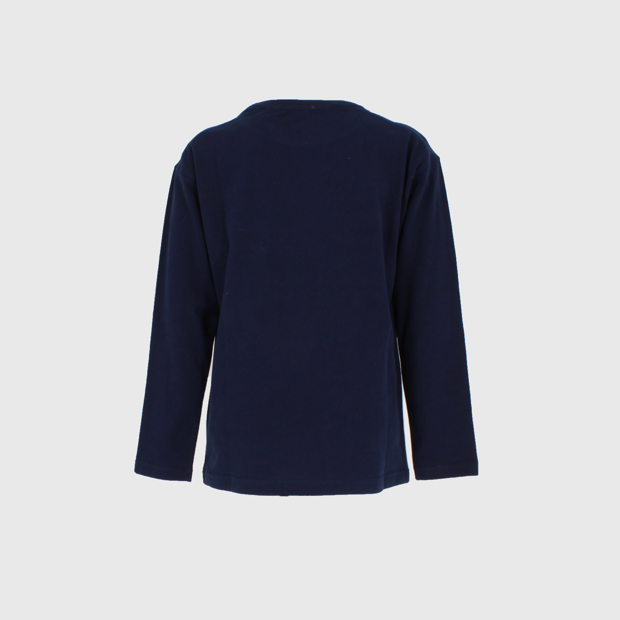 Maglietta oversize in jersey manopesca, girocollo, a maniche lunghe. Stampa effetto gommato con scritte sul davanti. Tasca in nylon sul petto.