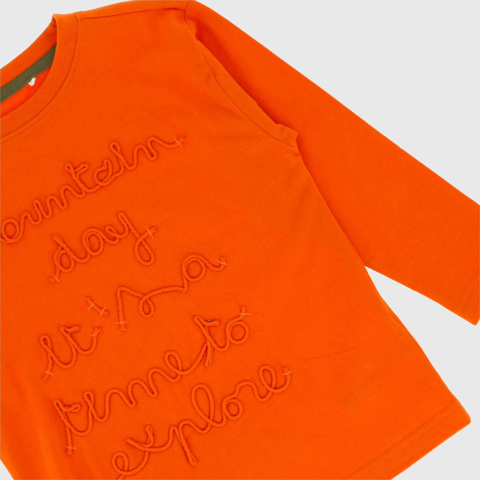 Maglietta oversize in jersey, girocollo, a maniche lunghe. Applicazione con scritte in spago sul davanti. Collo in costina.