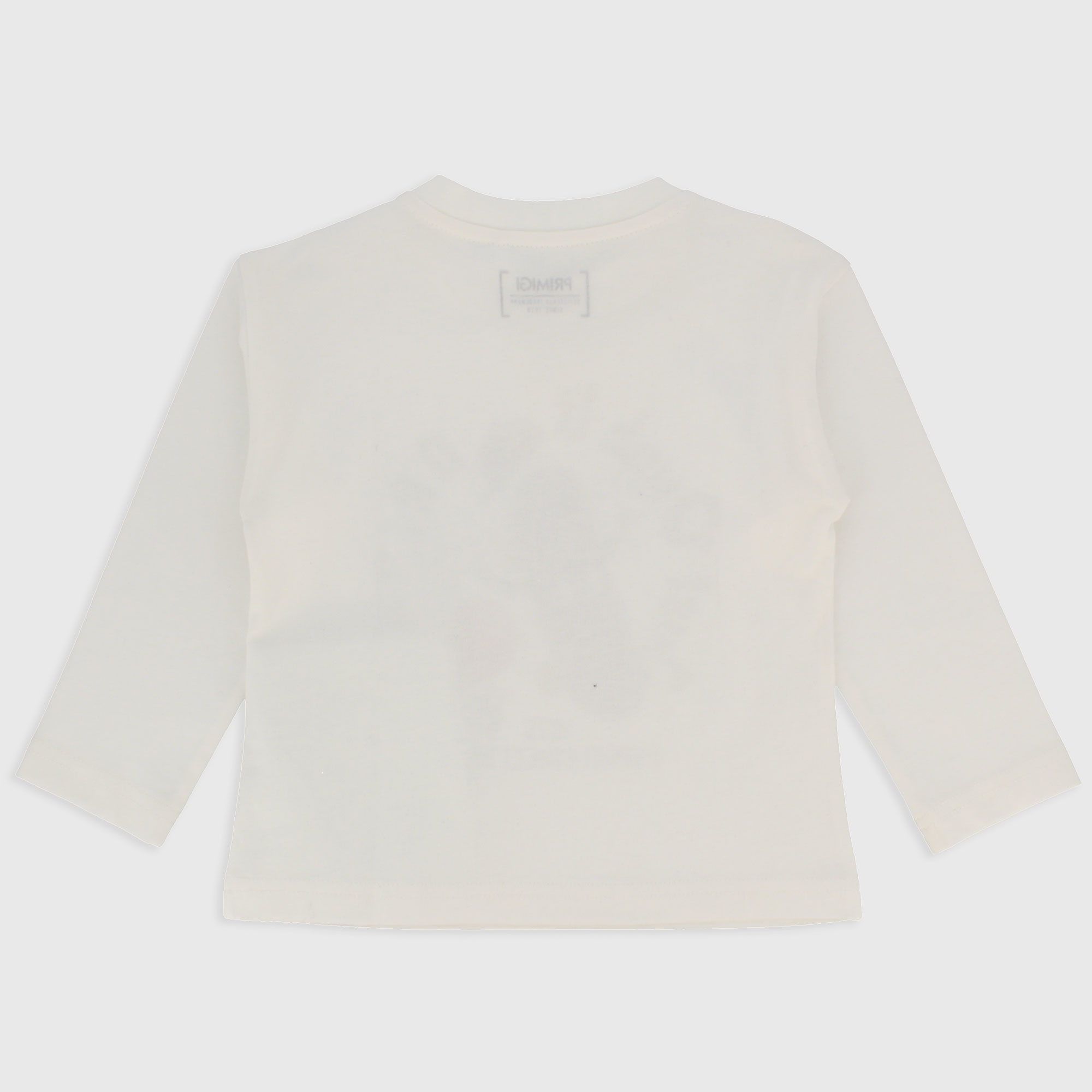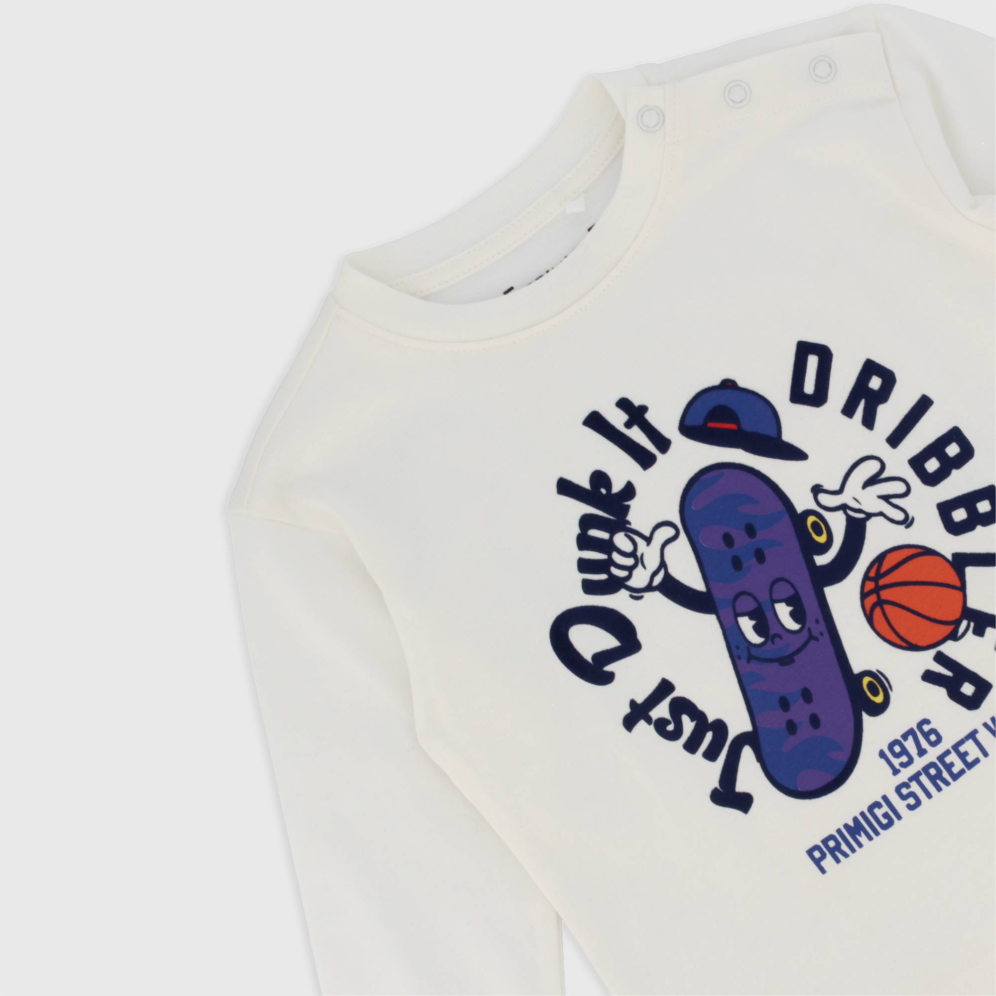 Maglietta oversize in jersey, girocollo, a maniche lunghe. Chiusura con bottoni automatici sulla spalla. Stampa con dettagli flock sul davanti. Collo in costina.