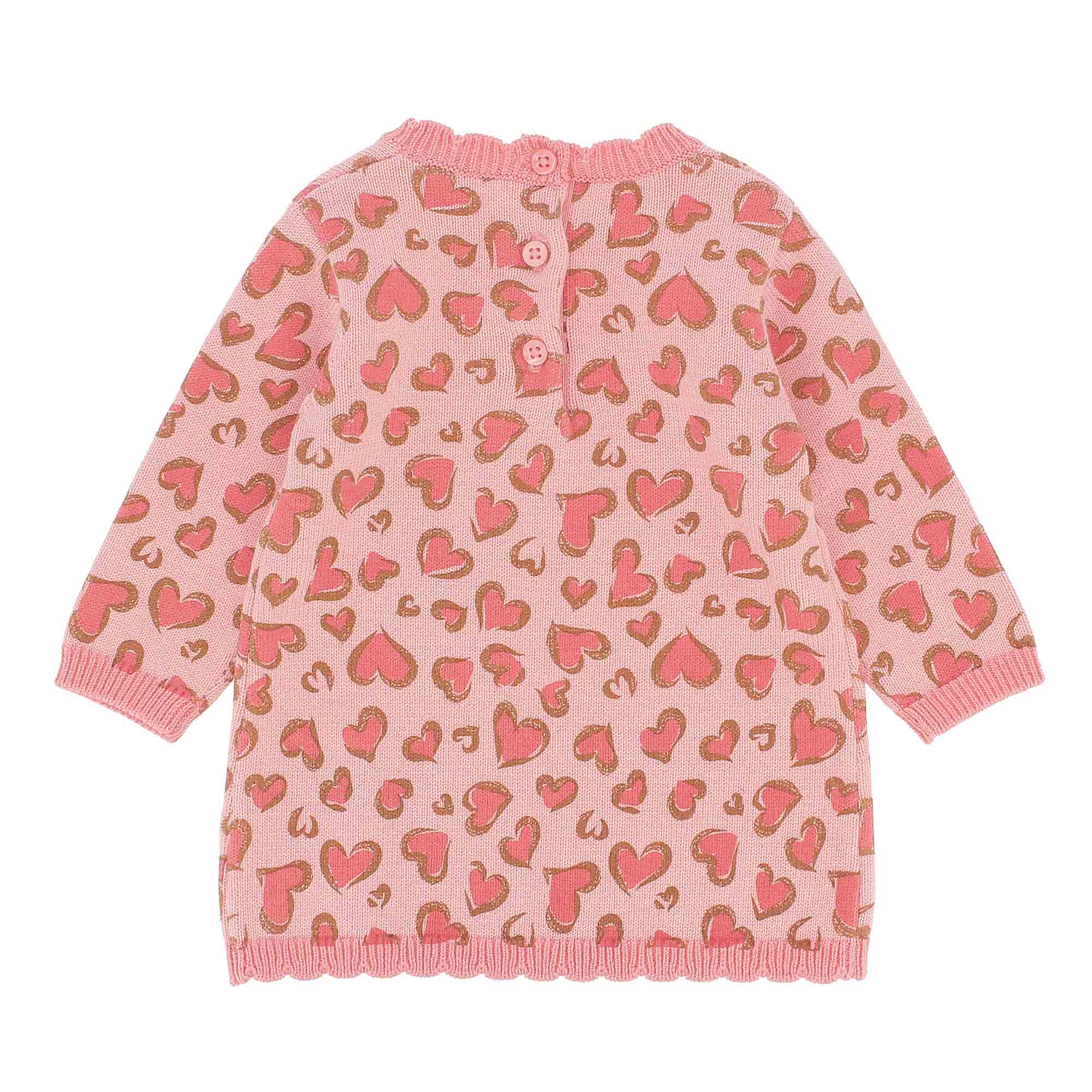 Vestito in morbida maglia girocollo, a maniche lunghe. Chiusura con bottoncini sul retro. Stampa all-over con cuoricini.