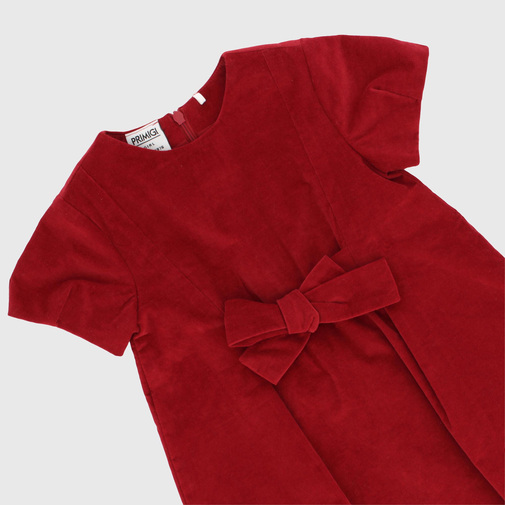Vestito in velluto a costine, girocollo, con maniche corte a sbuffo. Chiusura con zip sul retro. Fiocco sul davanti.