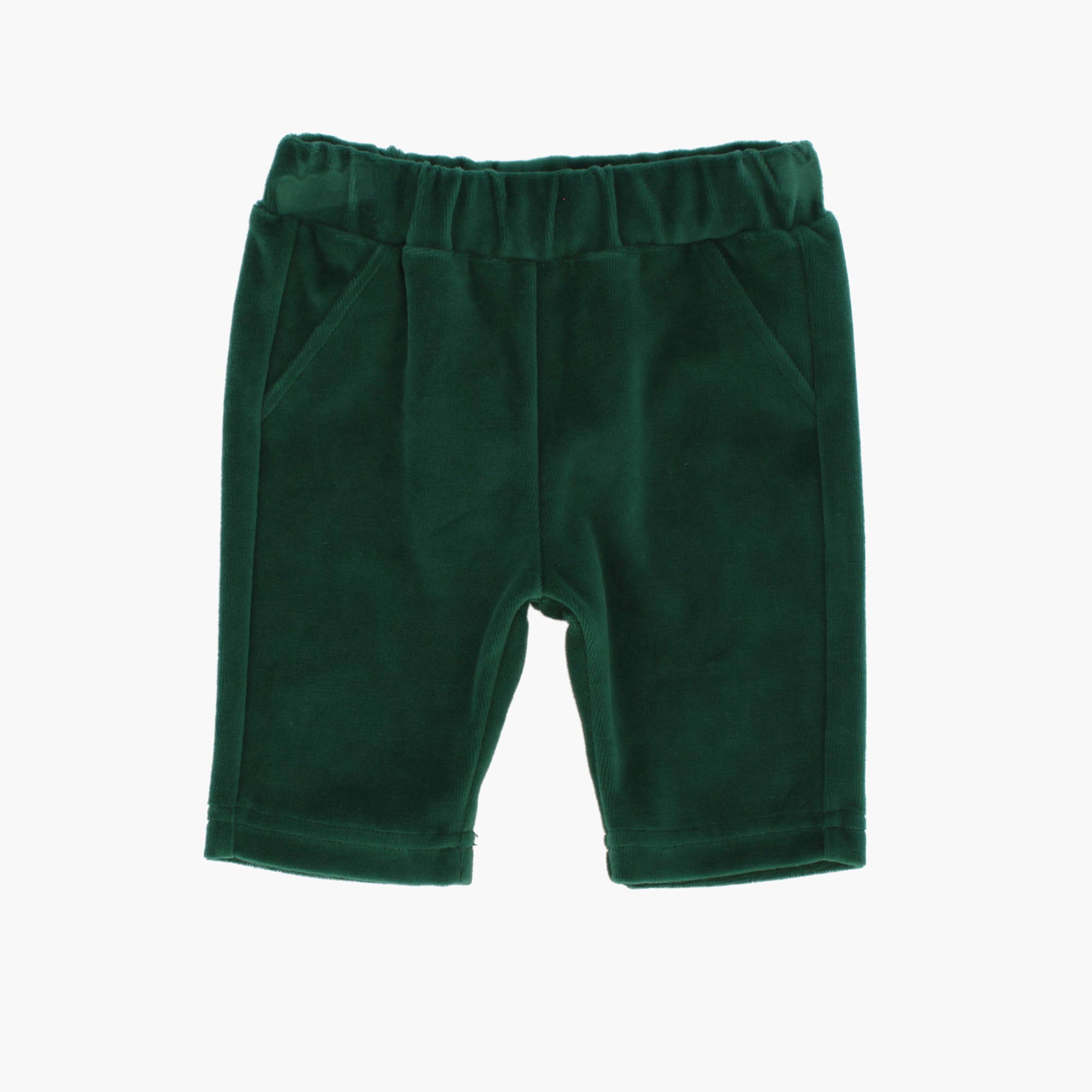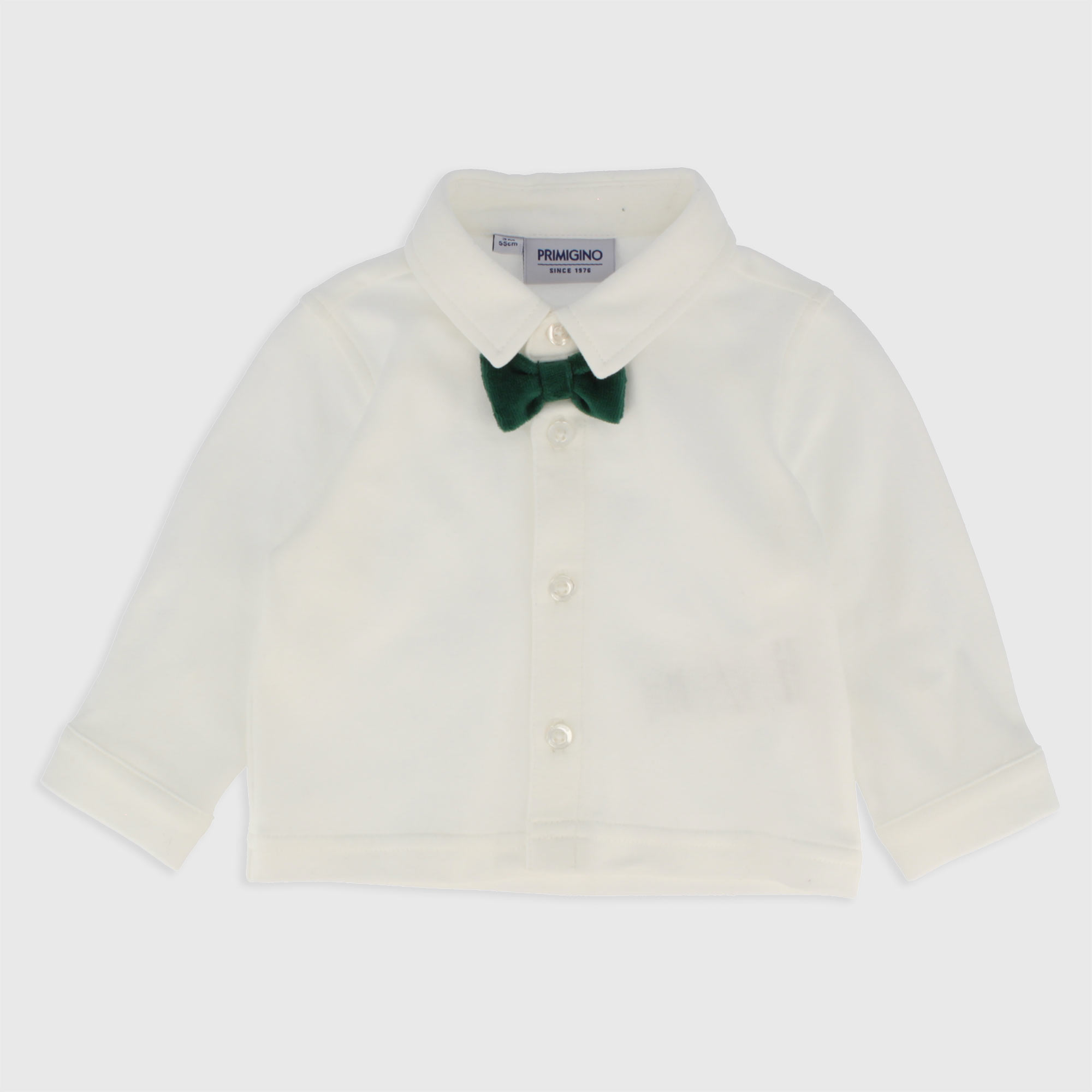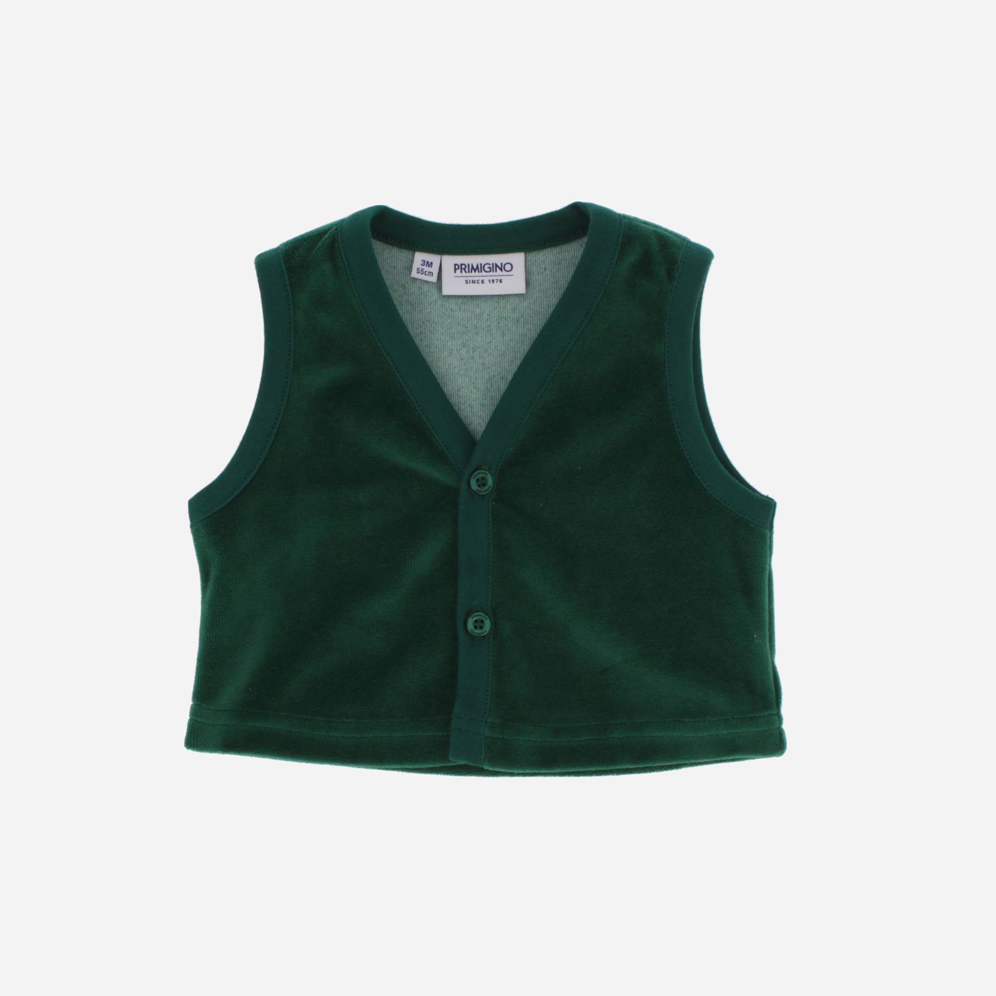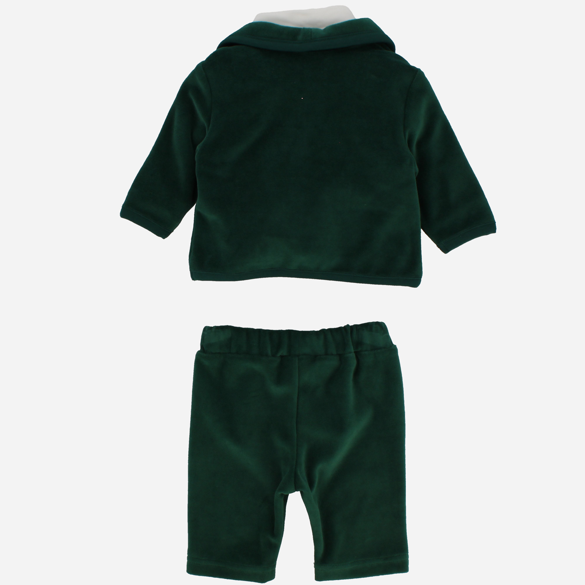 Completo composto da quattro pezzi. Giacchina in ciniglia a maniche lunghe. Chiusura con bottoni sul davanti e finte taschine. Camicia con papillon e abbottonatura frontale. Gilet in ciniglia con bottoncini sul davanti. Pantalone in ciniglia con vita elasticizzata.