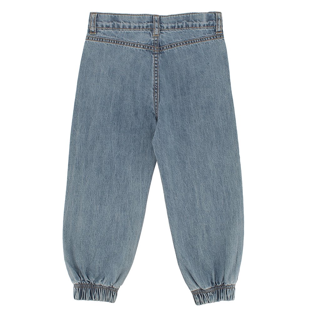 Брюки-джоггеры из легкой джинсовой ткани с регулируемой талией внутри. Застежка на пуговицу и молнию. Низ на резинке.