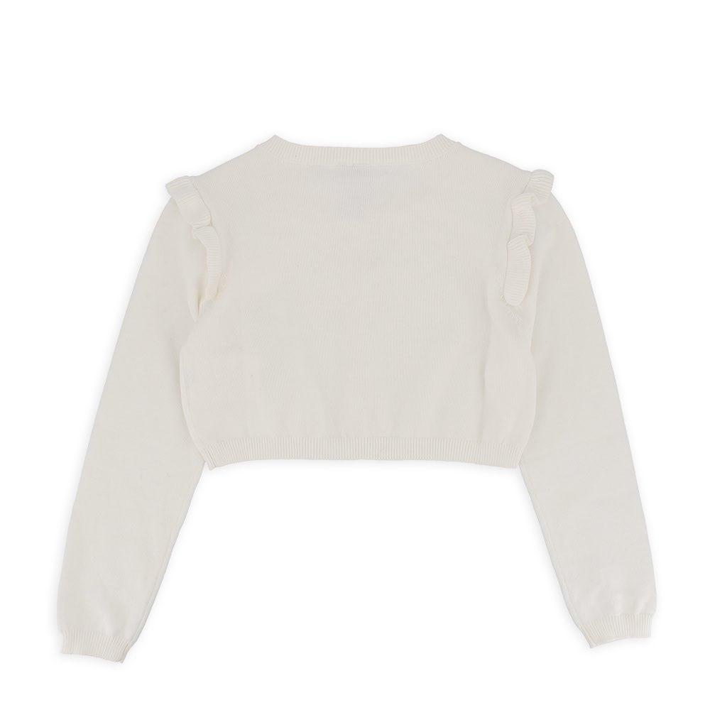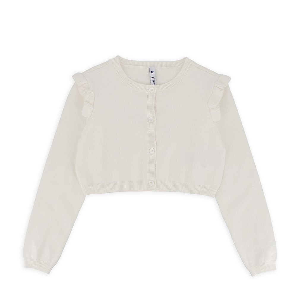 Вязаный кардиган с круглым вырезом горловины, длинными рукавами с воланами. Застежка спереди на пуговицы.