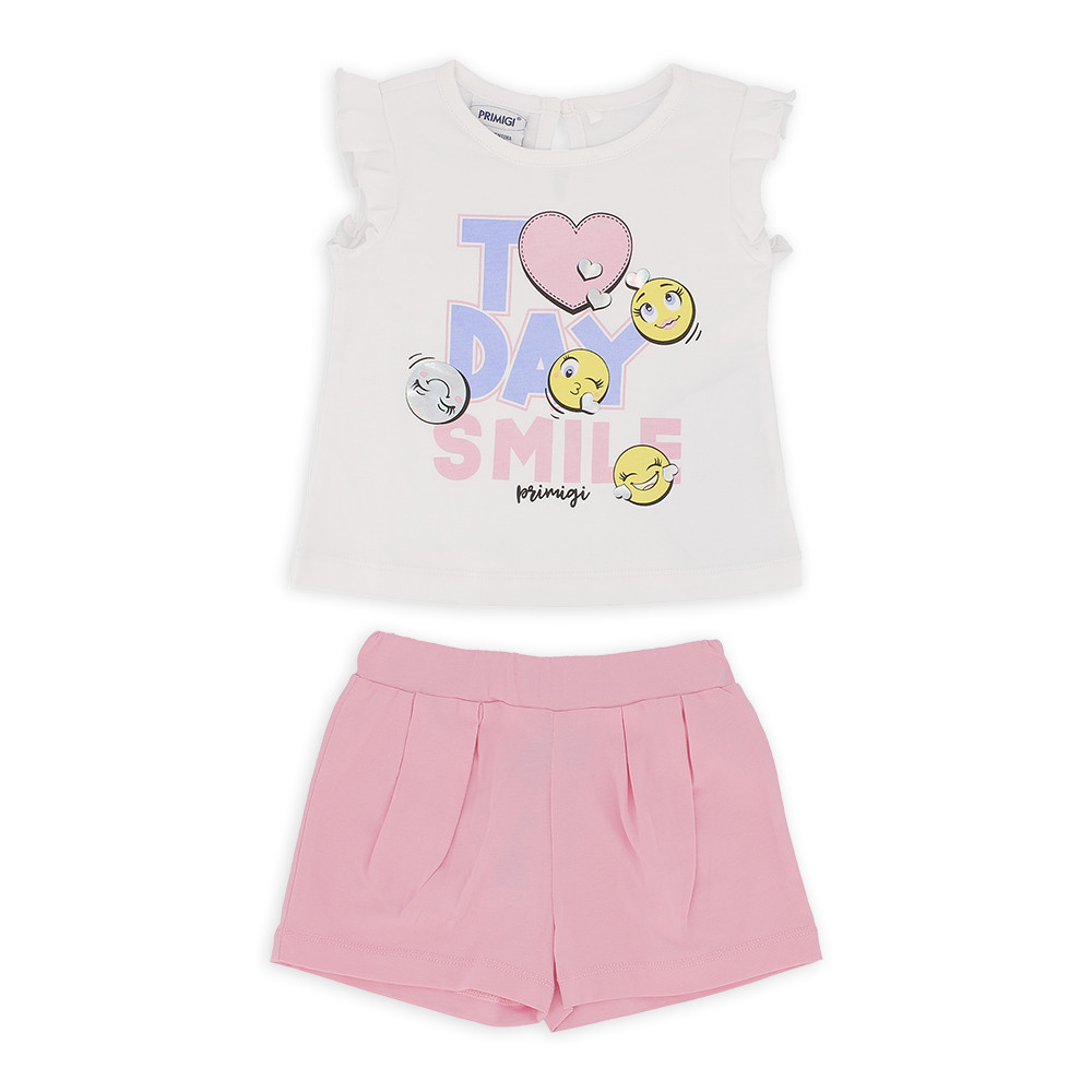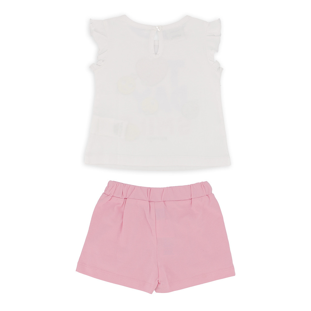 Комплект-двойка. Футболка из джерси с круглым вырезом, короткими рукавами и небольшими рюшами. Застежка-капля с пуговицей сзади. Передний принт с переливающимися деталями. Шорты из джерси с эластичной талией и складками.