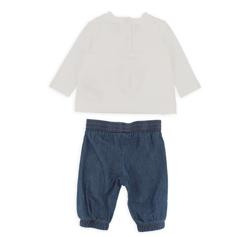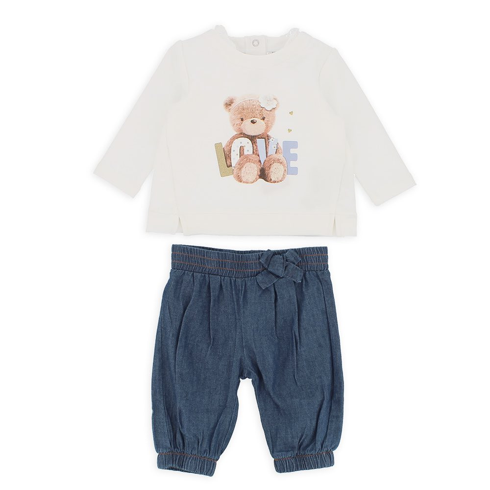 Комплект-двойка. Толстовка с круглым вырезом и длинными рукавами. Сзади застежка на автоматические кнопки. Принт в виде медвежонка спереди с блестящими деталями, английская вышивка на воротнике. Легкие джинсовые брюки с эластичной талией и низом. Бант на талии.