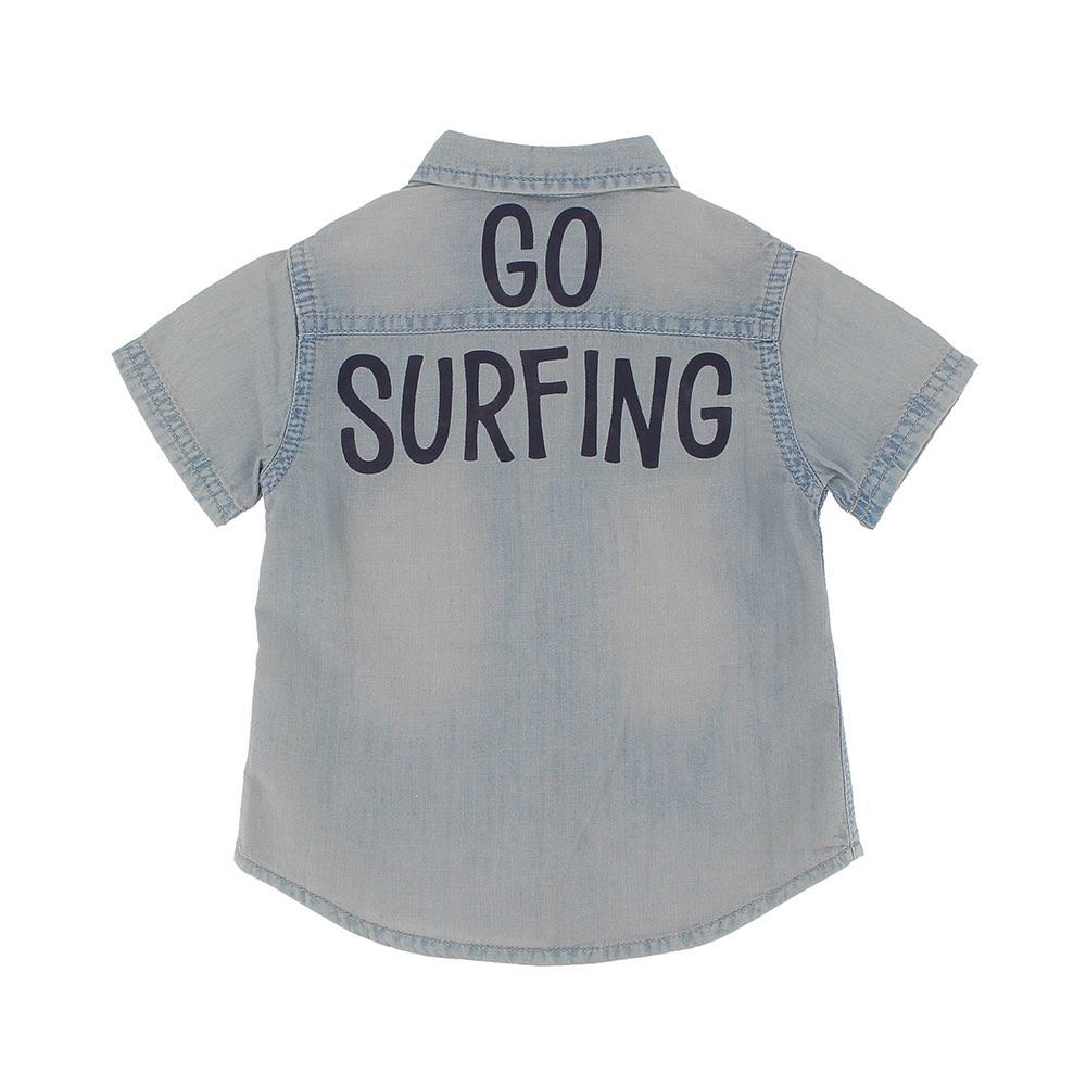 Рубашка из шамбре, короткие рукава. Застежка на пуговицы спереди. Накладные карманы спереди и контрастный принт сзади.
