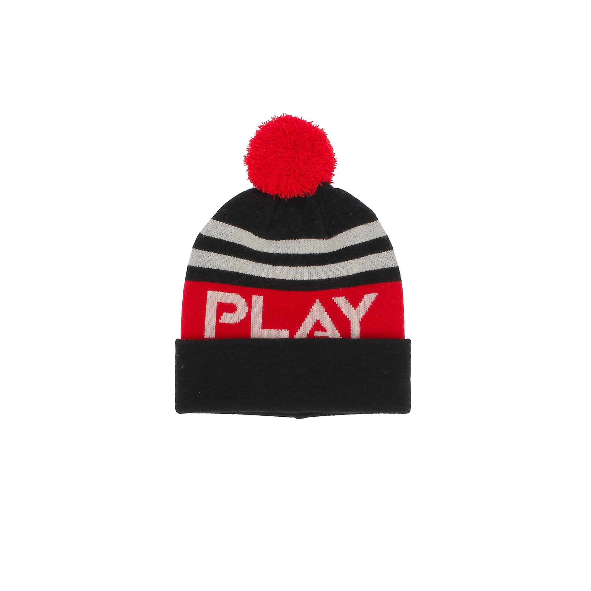 Шапка из мягкого вязаного трикотажа с полосками и надписью, с помпоном.