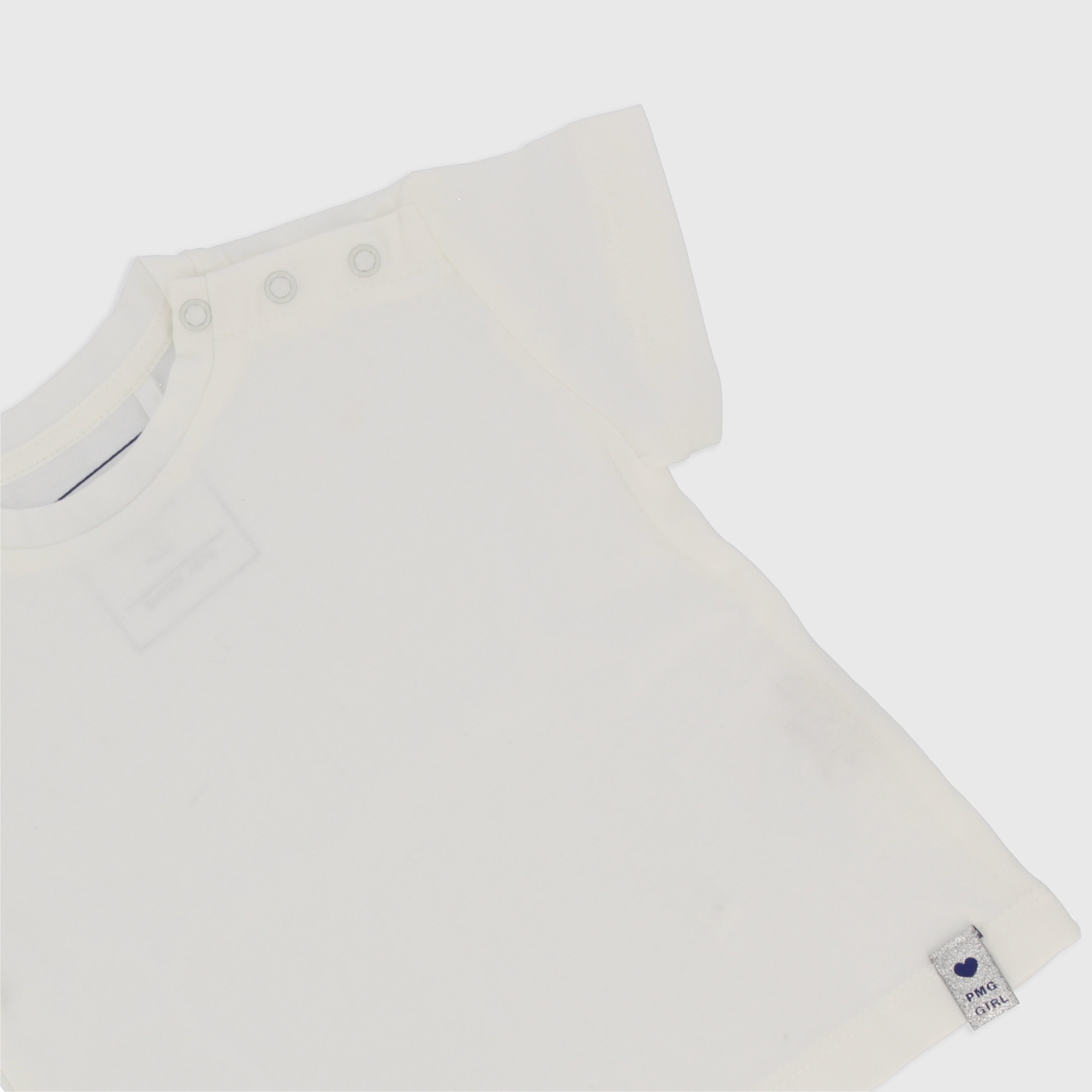 Футболка из джерси с круглым вырезом и короткими рукавами. Застежка на кнопки на плече. Этикетка из люрекса с нанесенным логотипом внизу.