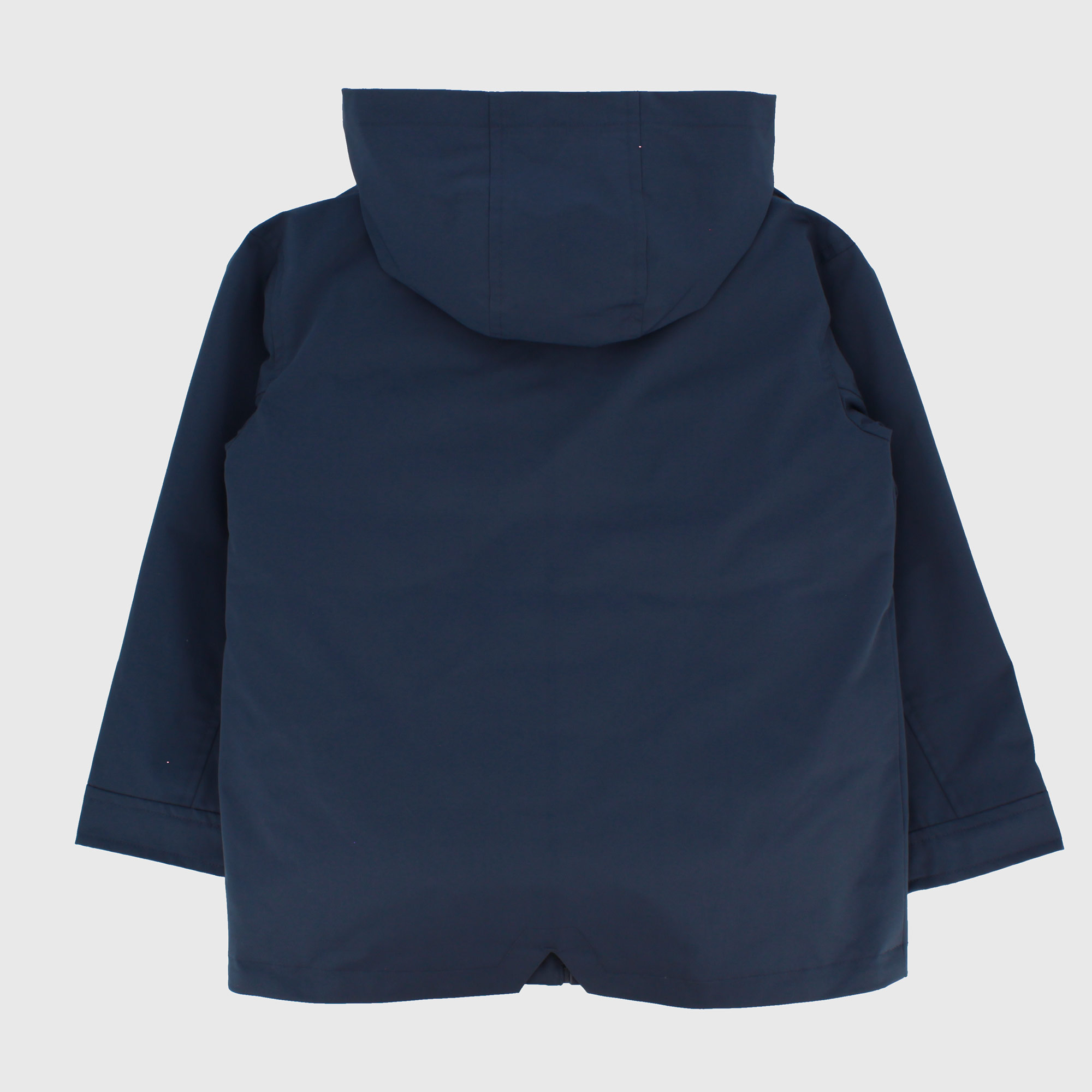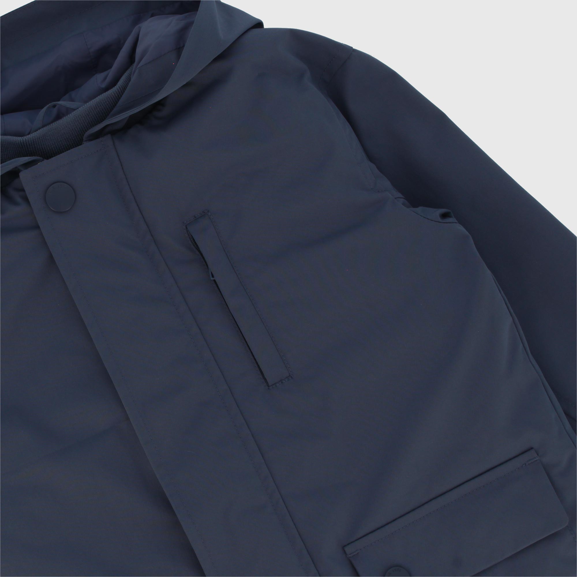 Нейлоновая куртка с капюшоном и съемным утепленным жилетом. Застежка спереди на молнию и пуговицы. Накладные карманы спереди и разрез сзади. Контрастная подкладка.
