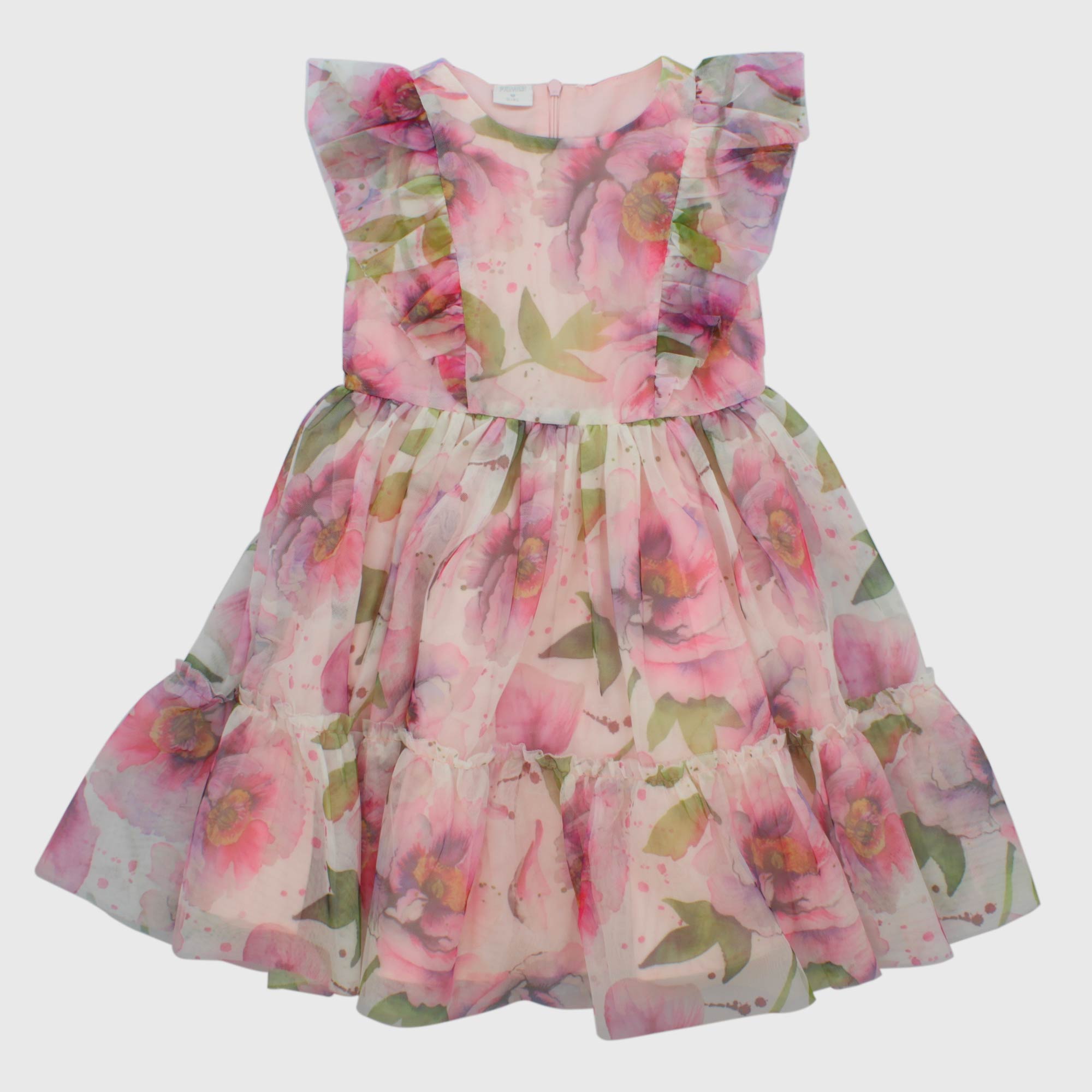 Платье из тюля с цветочным узором, с проймами и воланами. Воланы спереди и сзади. Застежка сзади на невидимую молнию. Внутренняя подкладка.
