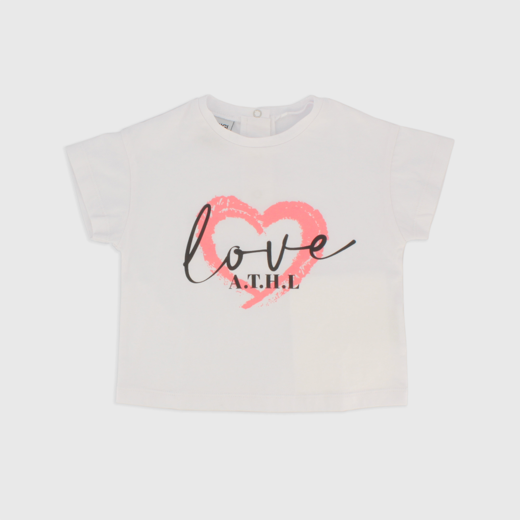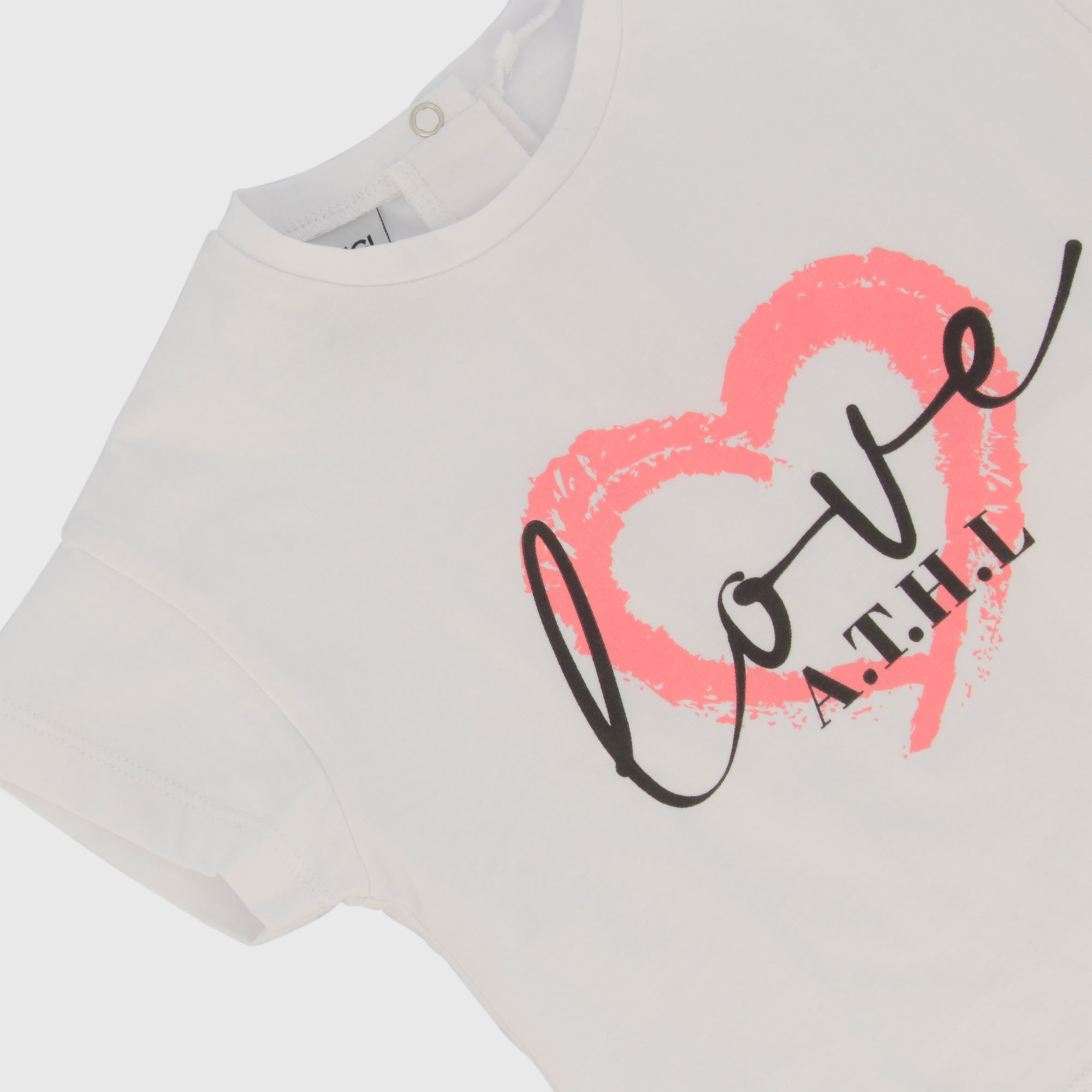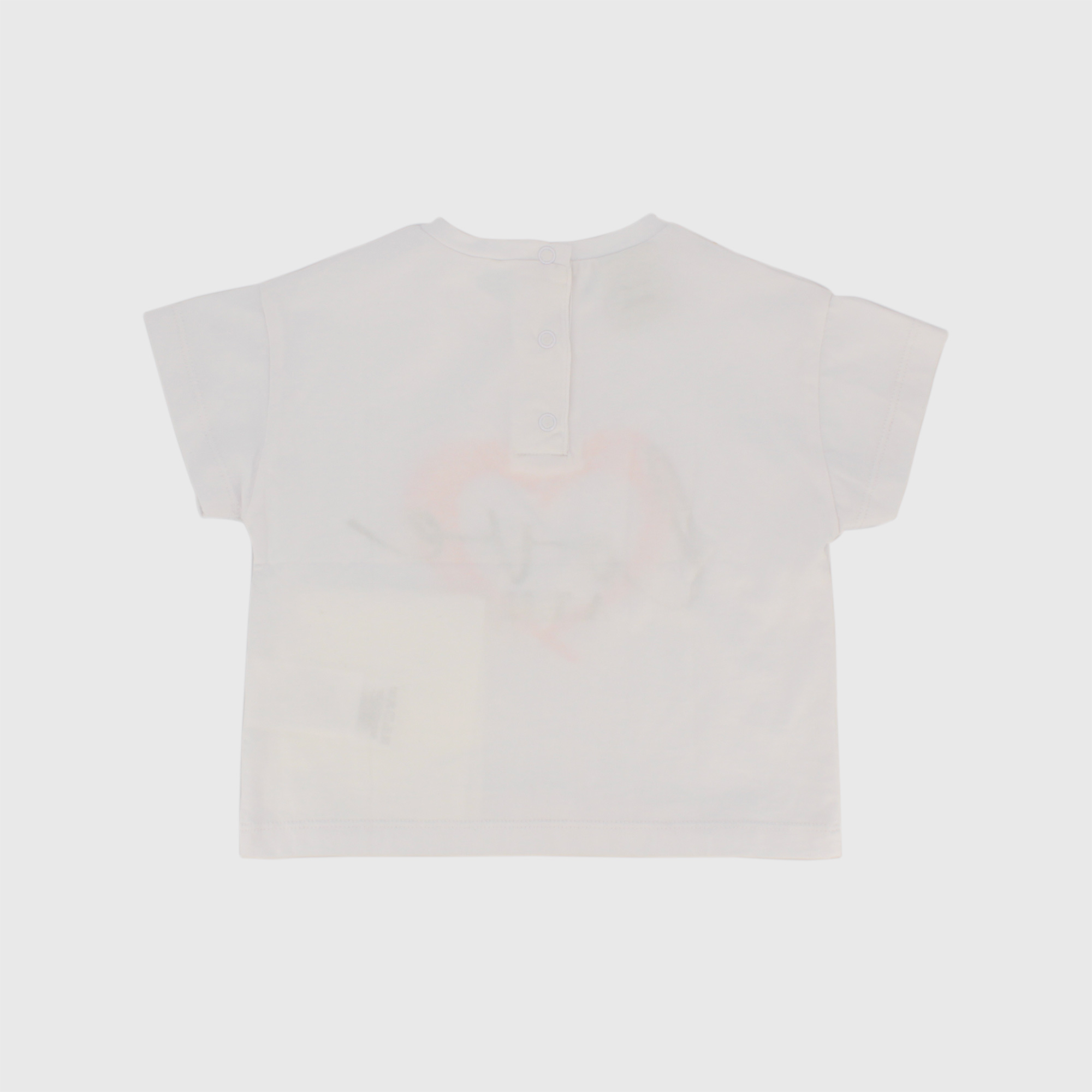Футболка из джерси, круглый вырез, короткие рукава. Застежка сзади на кнопки. Фронтальная печать.